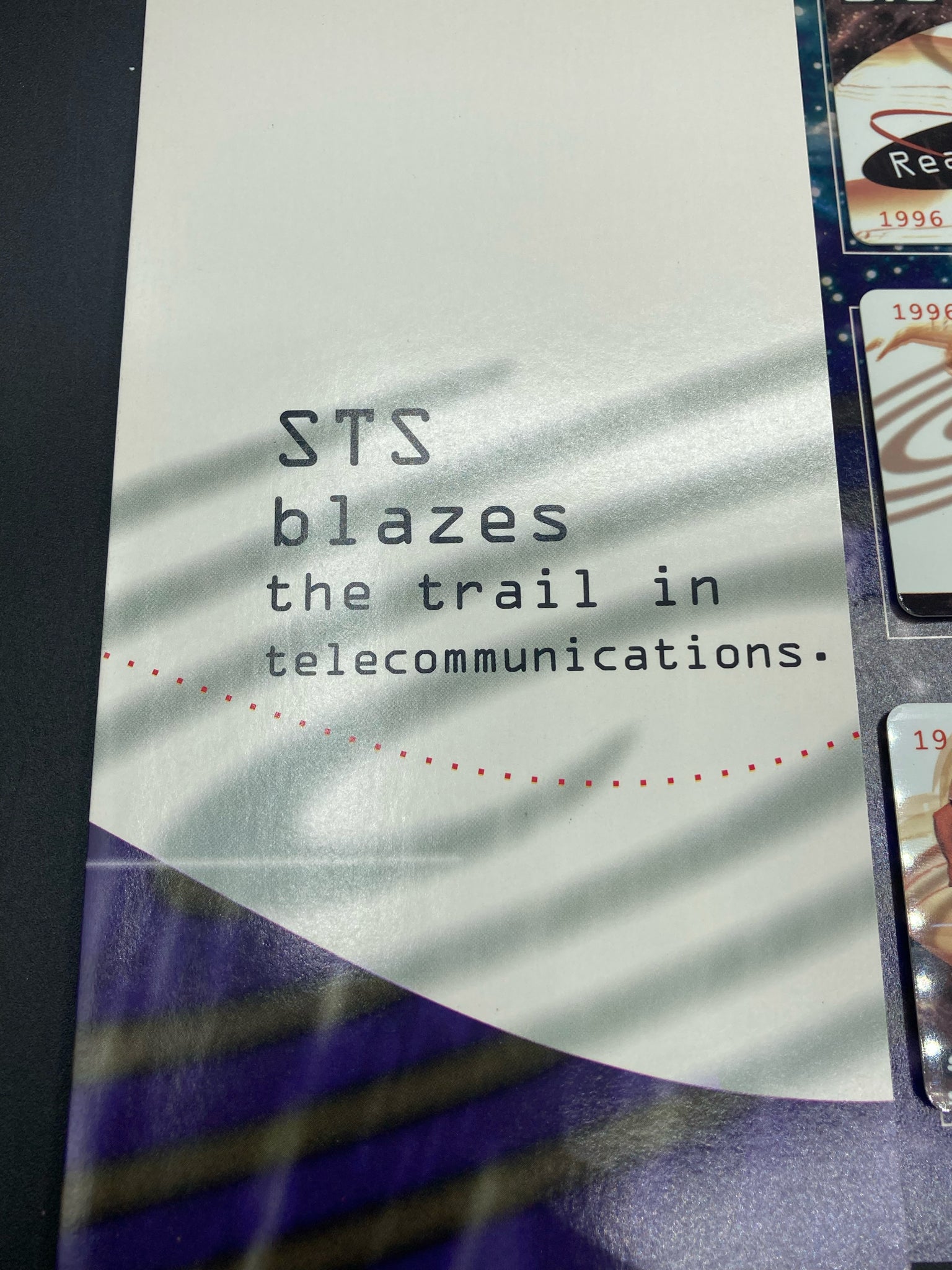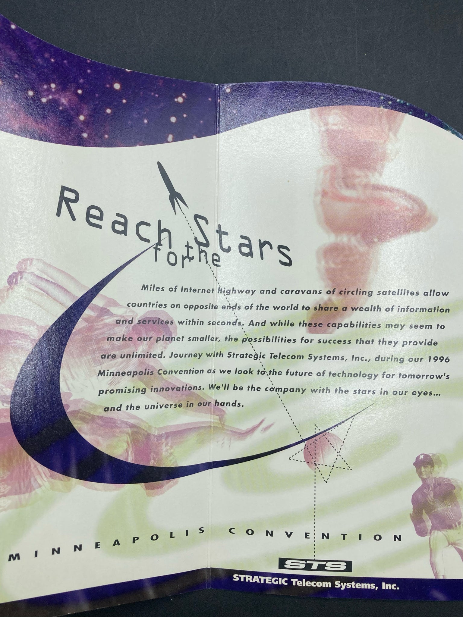 Strategic Telecom Systems "Reach for the stars" 1996 Minneapolis convention phone card set with original folder. Set has all three limited edition phone cards featuring sports themed designs with futuristic design elements. Card folder continues the futuristic optimism design theme. Phone cards are in excellent condition, card folder has some light wear noted in photos.