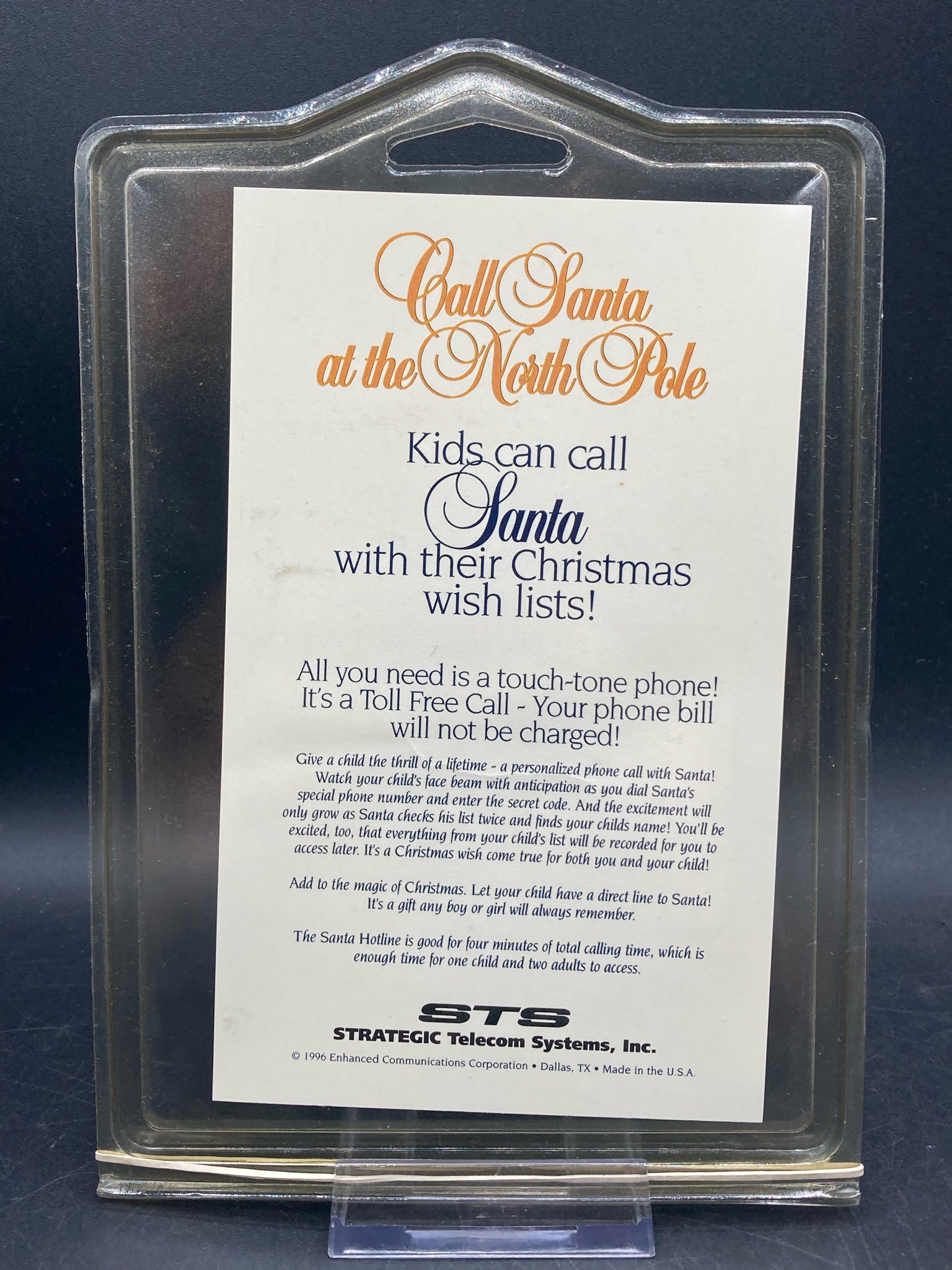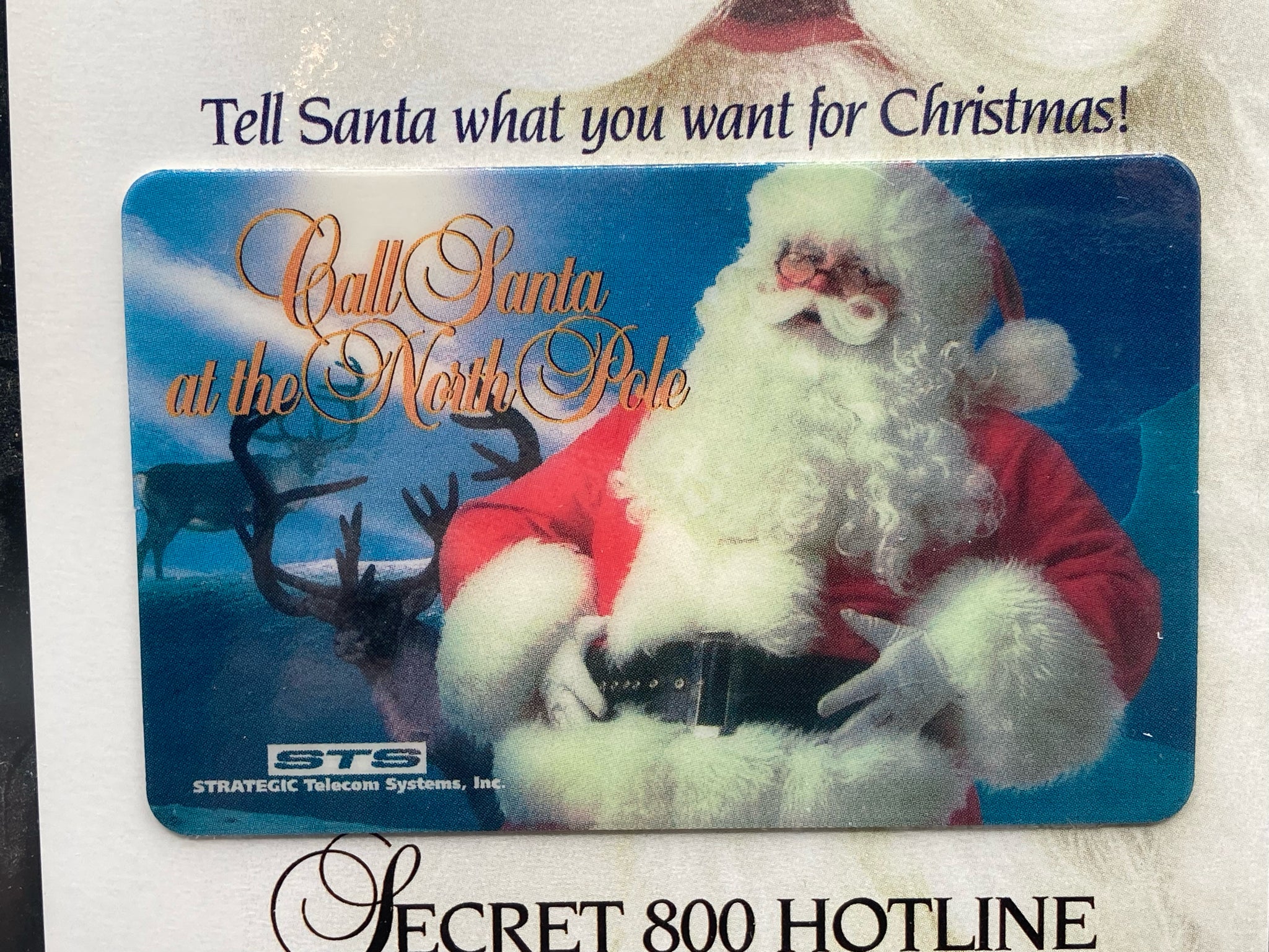 Vintage Strategic Telecom Systems Santa Claus north pole calling card, new in original package. Issued in 1996. Special limited edition card that featured a "Secret north pole hotline" that allowed children to call Santa for four minutes. Card in in like new condition.