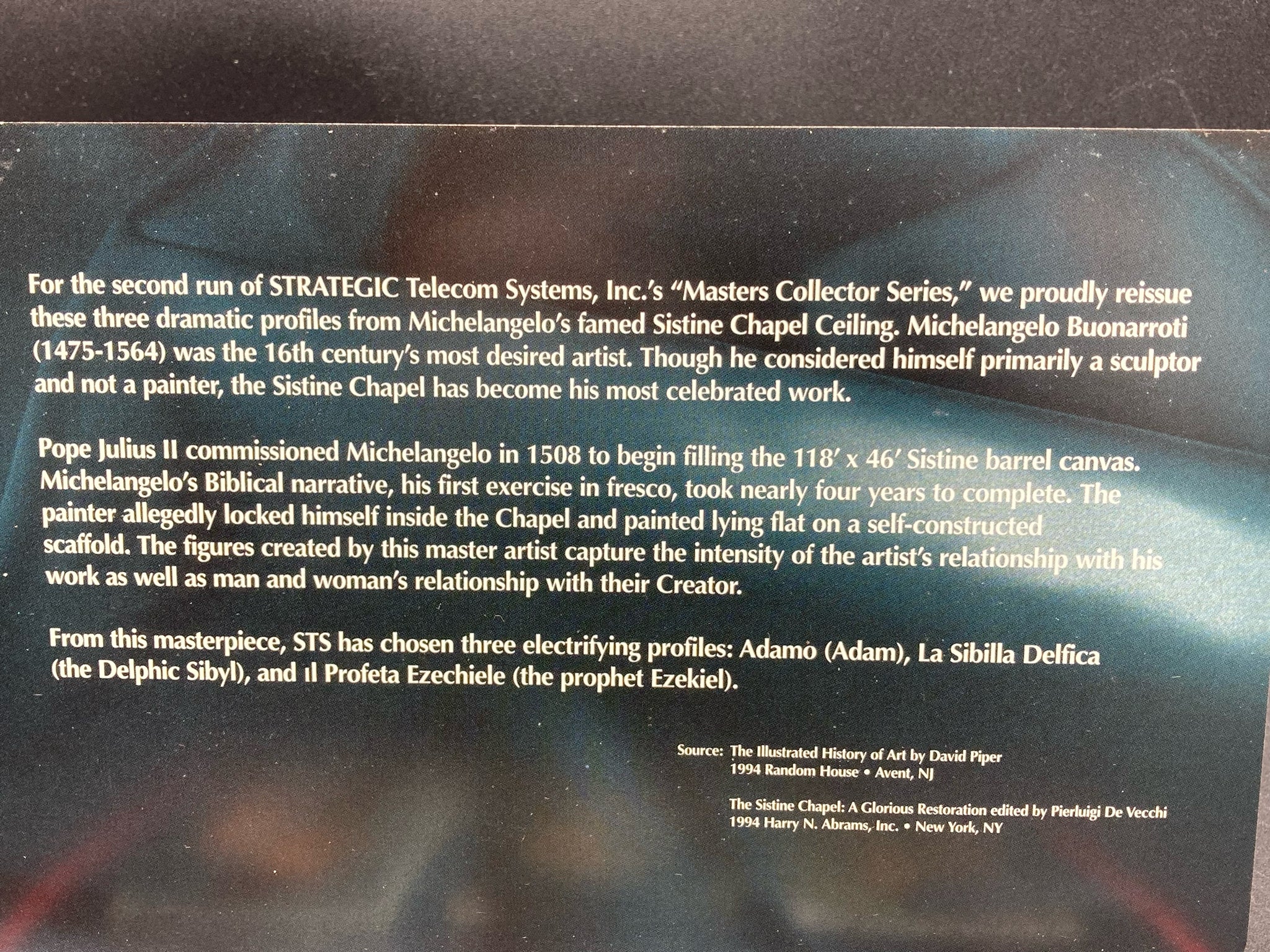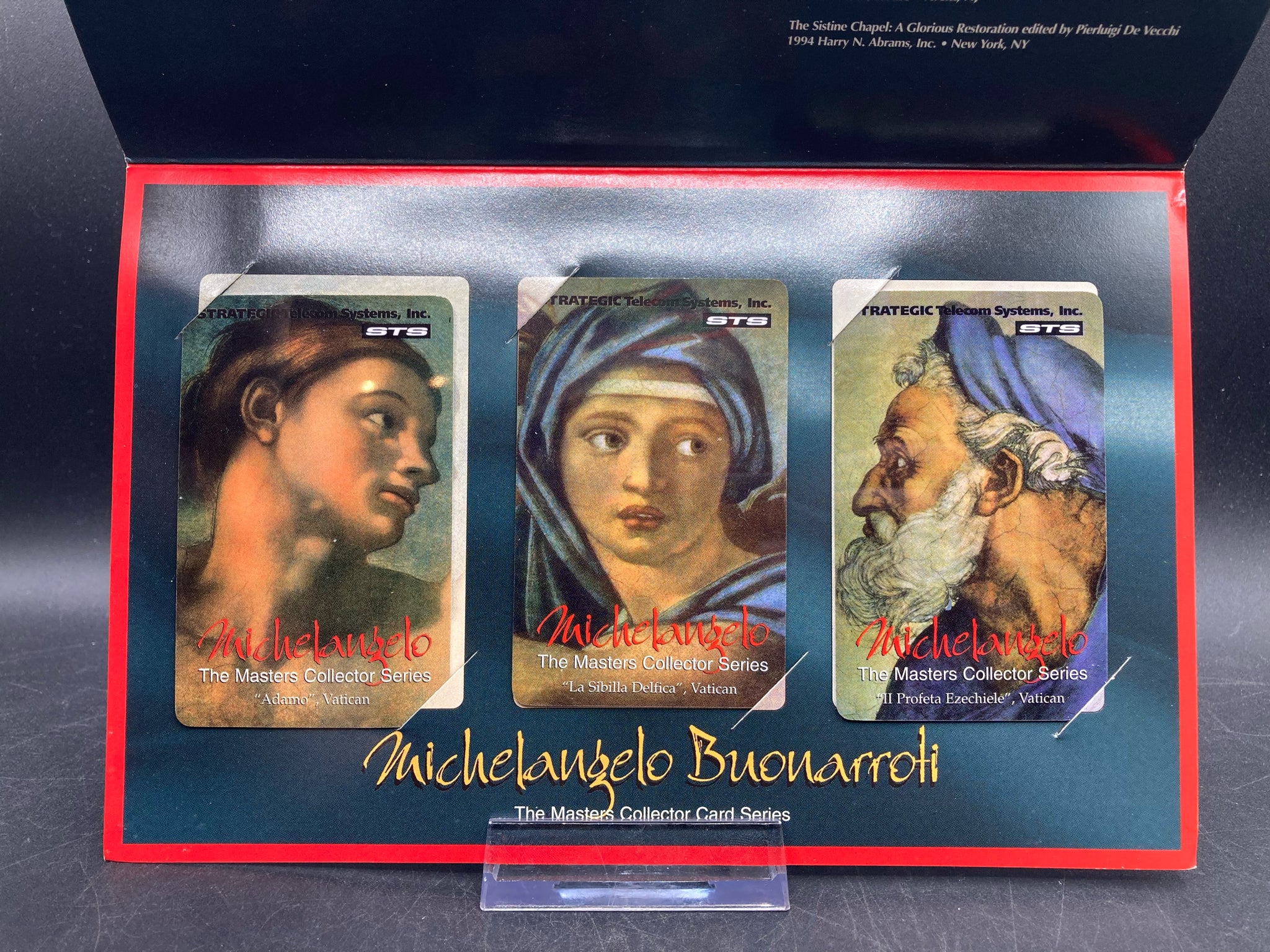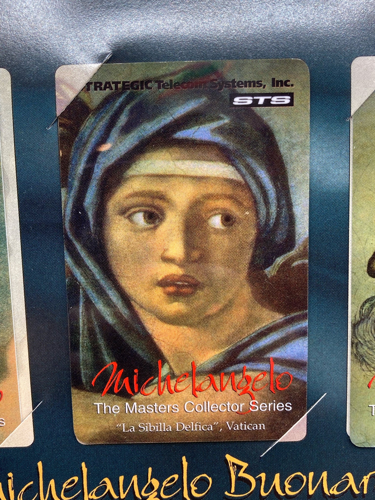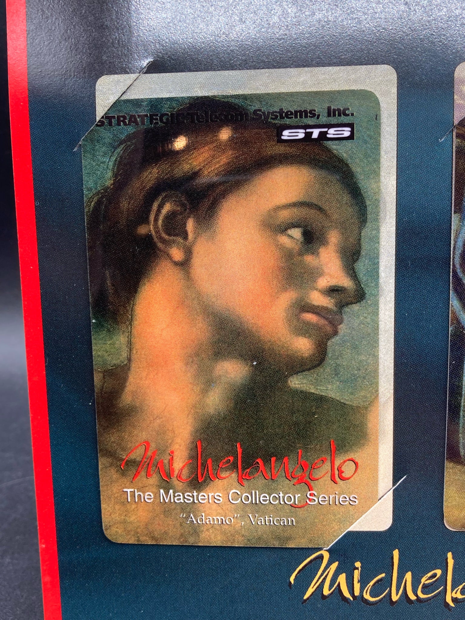 Strategic Telecom Systems the masters collector series Michelangelo phone card set with folder. Set of three calling cards with art and imagery inspired by the legendary artist Michelangelo. Set is in excellent condition. Rare find.