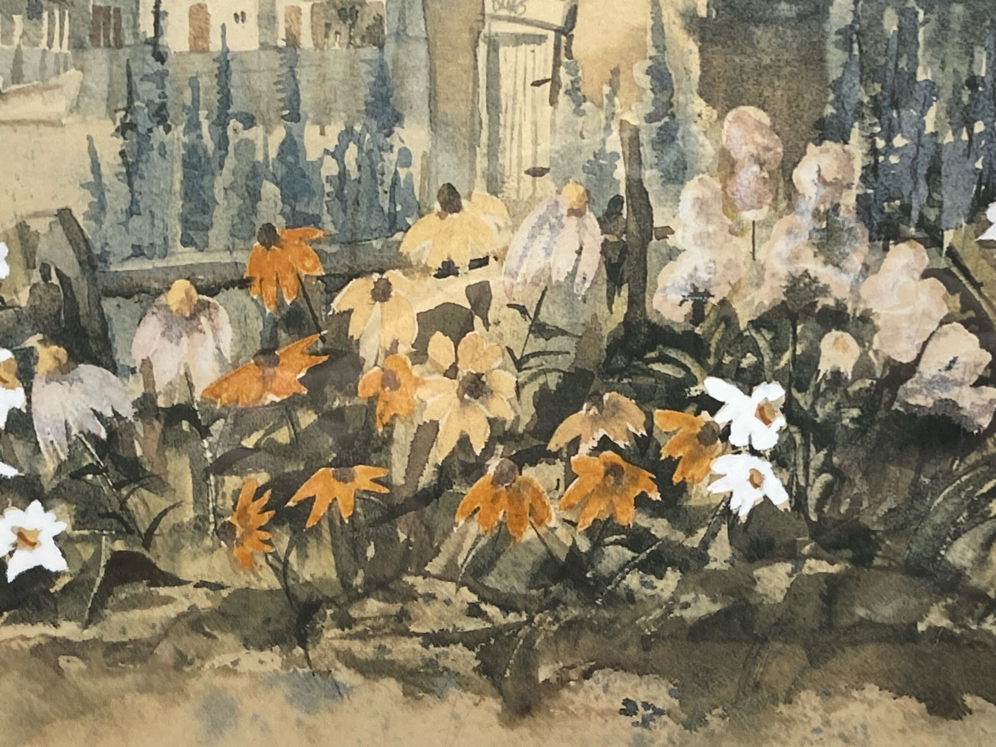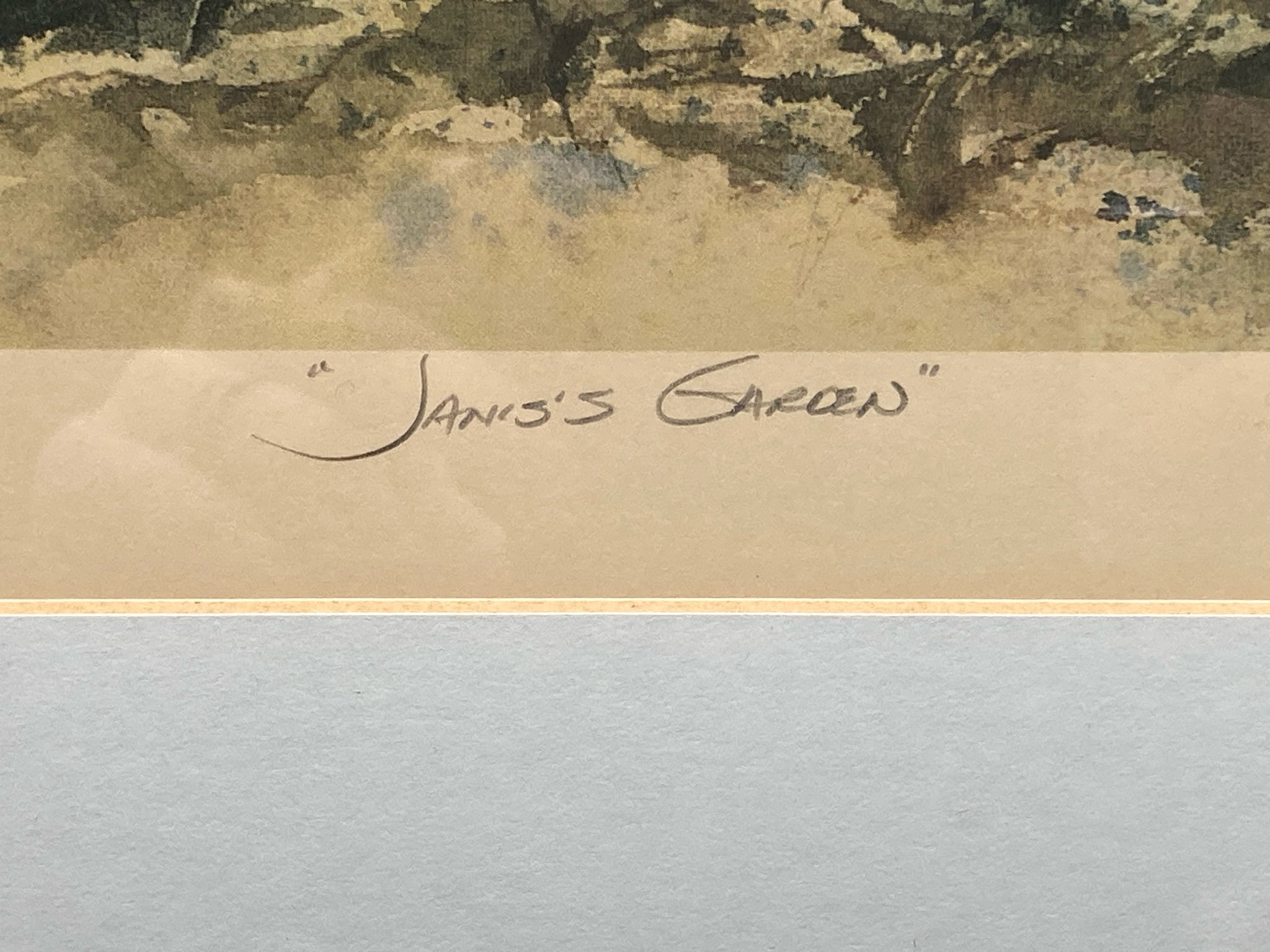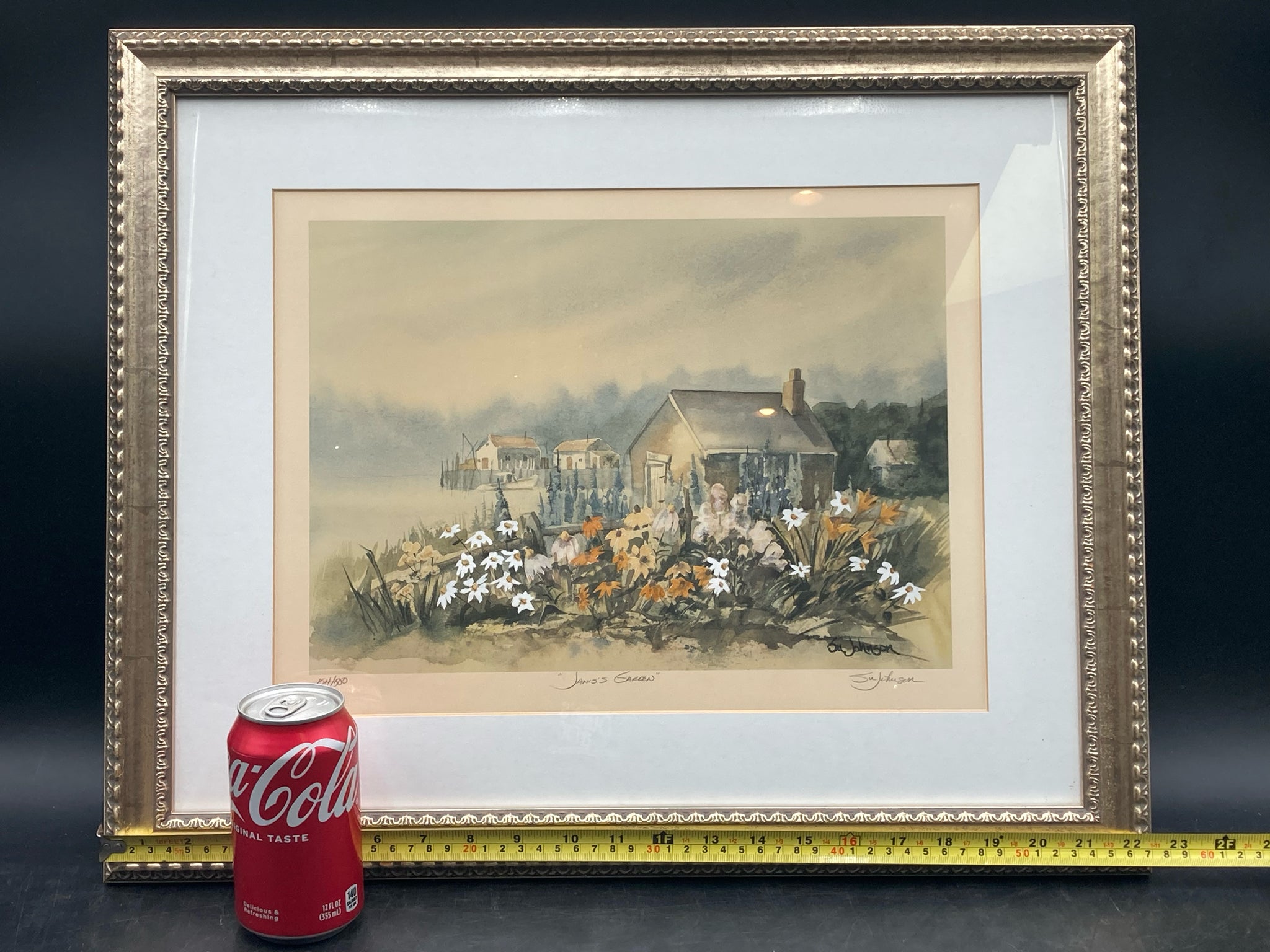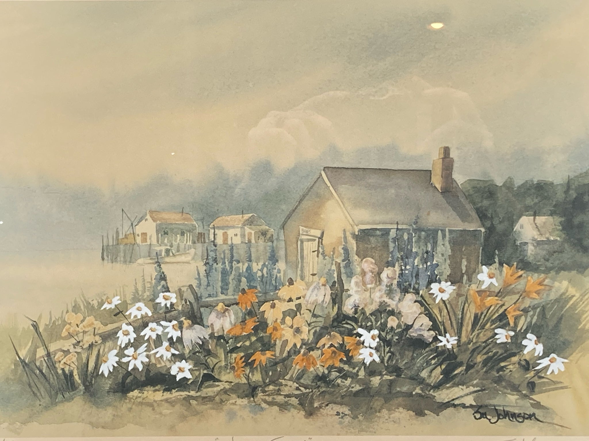 Su Johnson signed "Janis's Garden" limited edition lithograph. Print is based on her original painting of a seaside cottage with docks and fishing boats in the background. Signed, titled and numbered by the artist on bottom, number 154/500. Print measures 11" by 15", total size with frame is 15" by 19" item is in excellent condition.