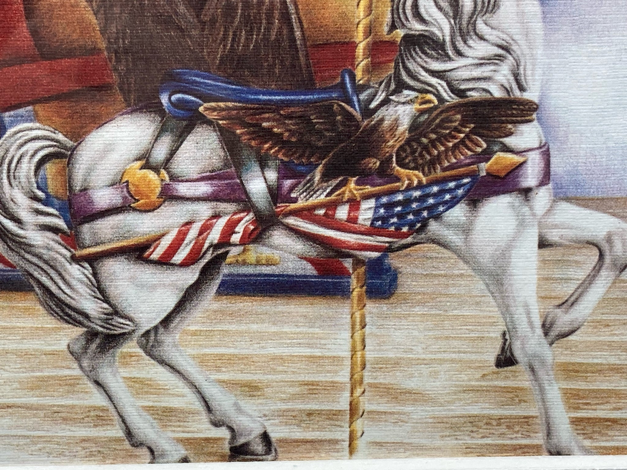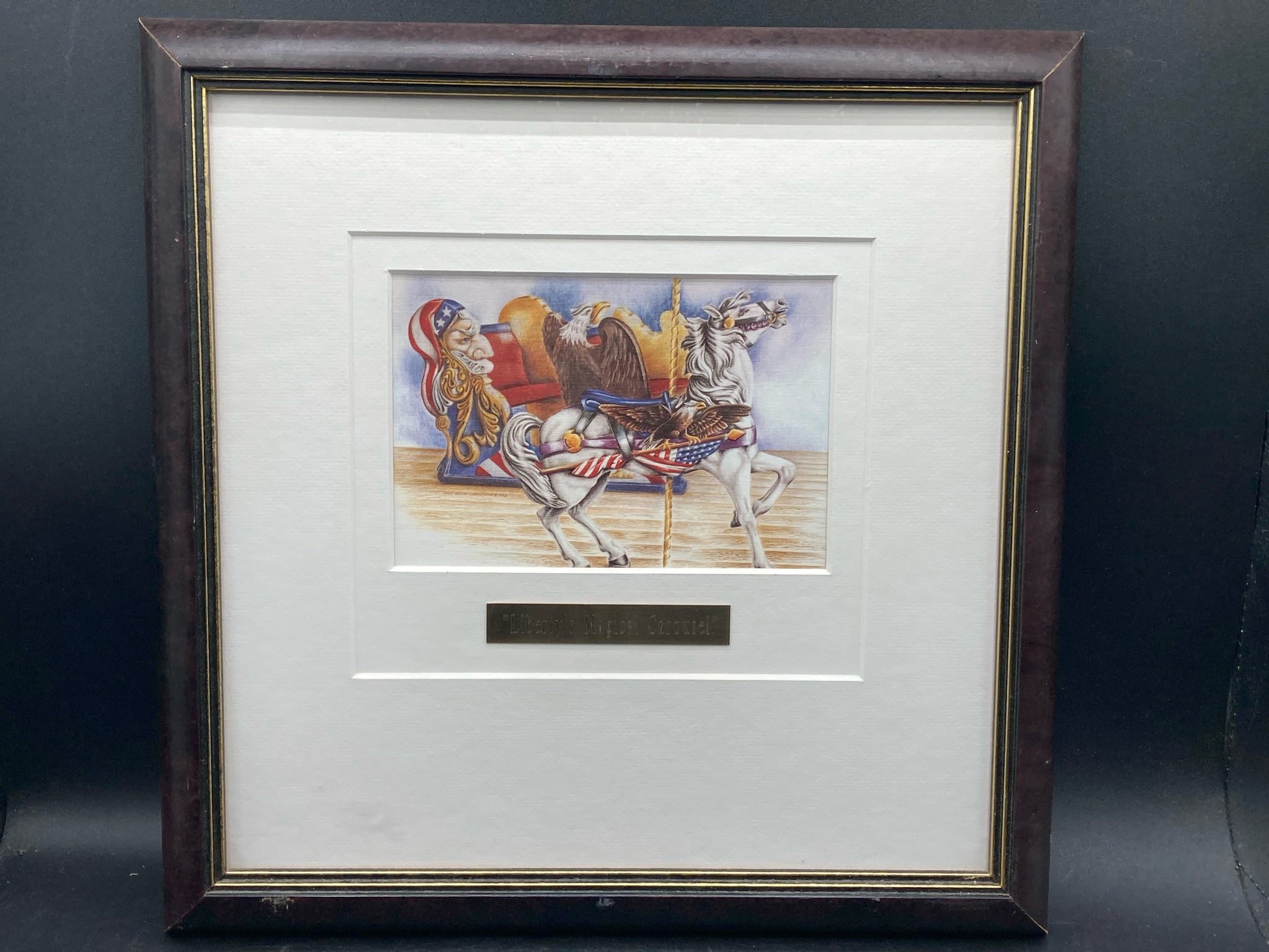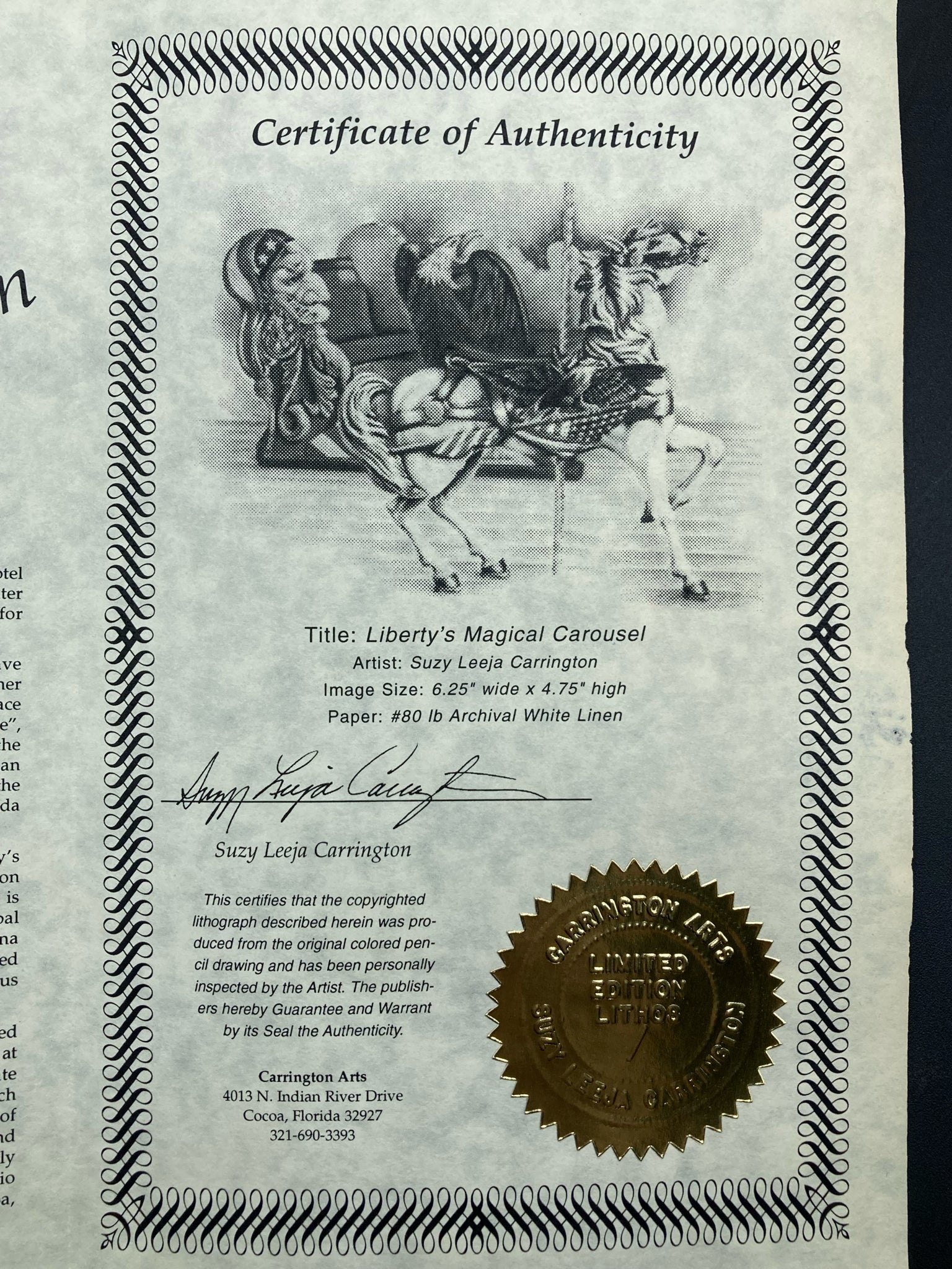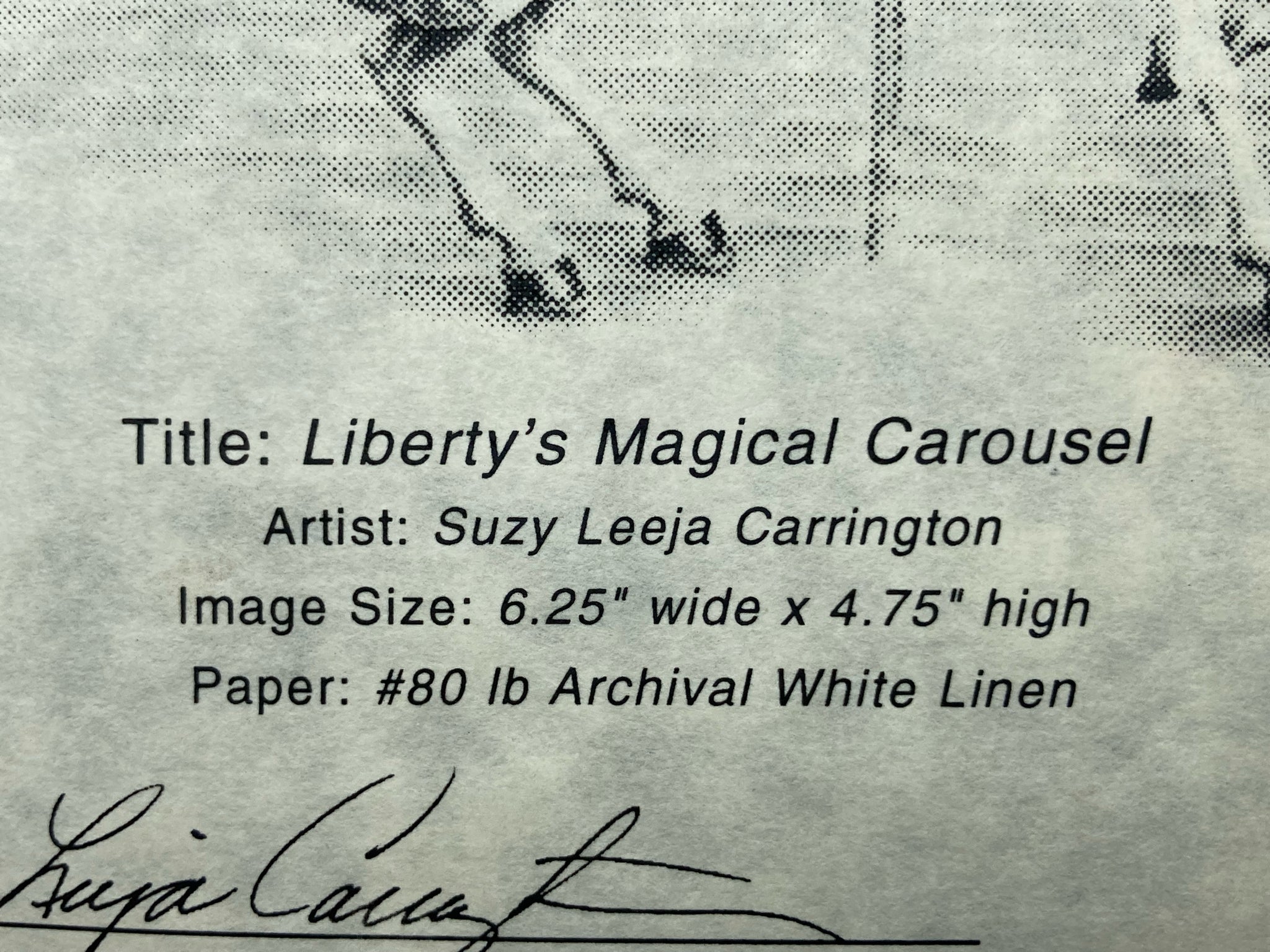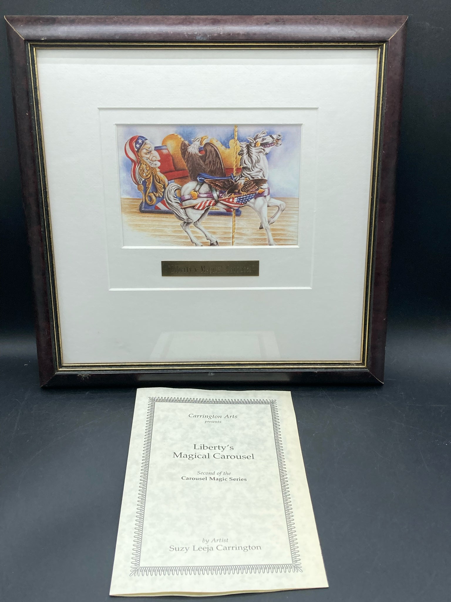 Limited edition framed authenticity matted Suzy Leeja Carrington "Liberty's magic carousel" print with certificate of authenticity. Lithograph on 80 pound linen archival paper. Expressive carousel horse scene with patriotic symbolism and colors. Print measures 6.25" by 4.75", total size with frame is 12" by 13". Comes with certificate of authenticity that features more information on the piece and the artist. Frame has some light scuffs, print itself is in excellent condition.