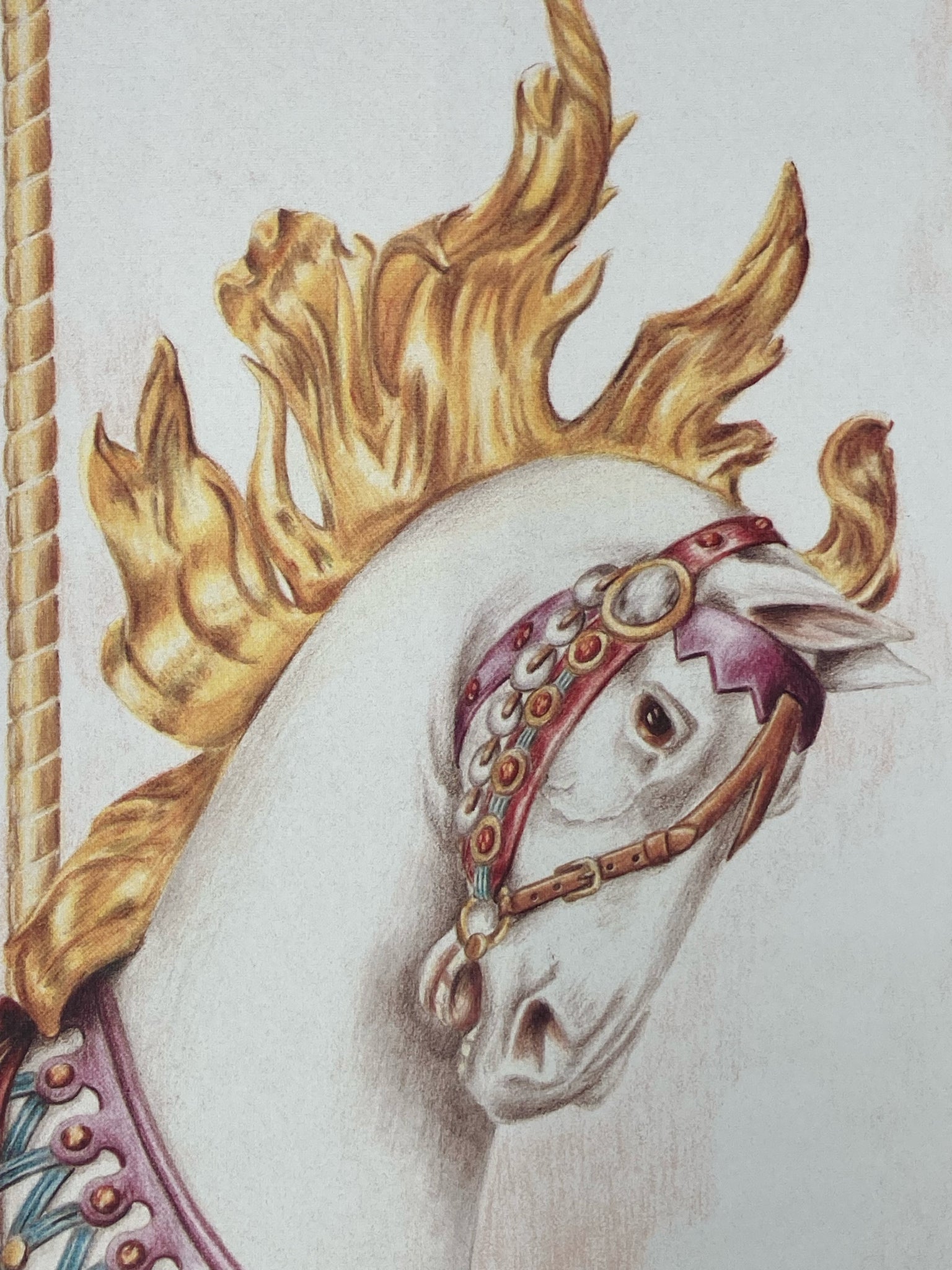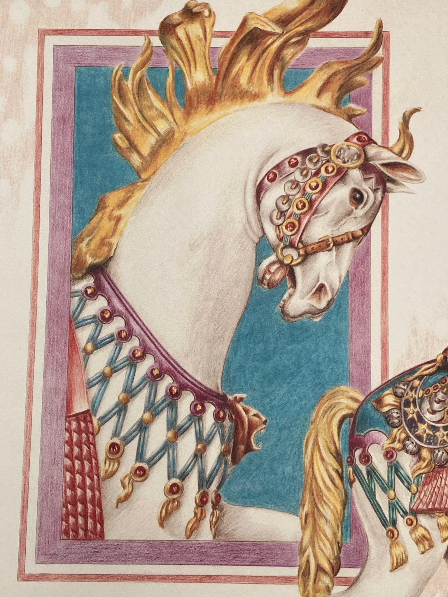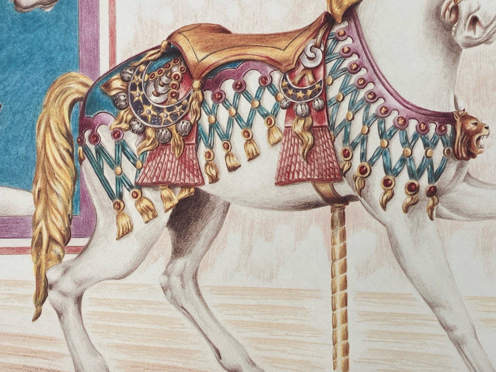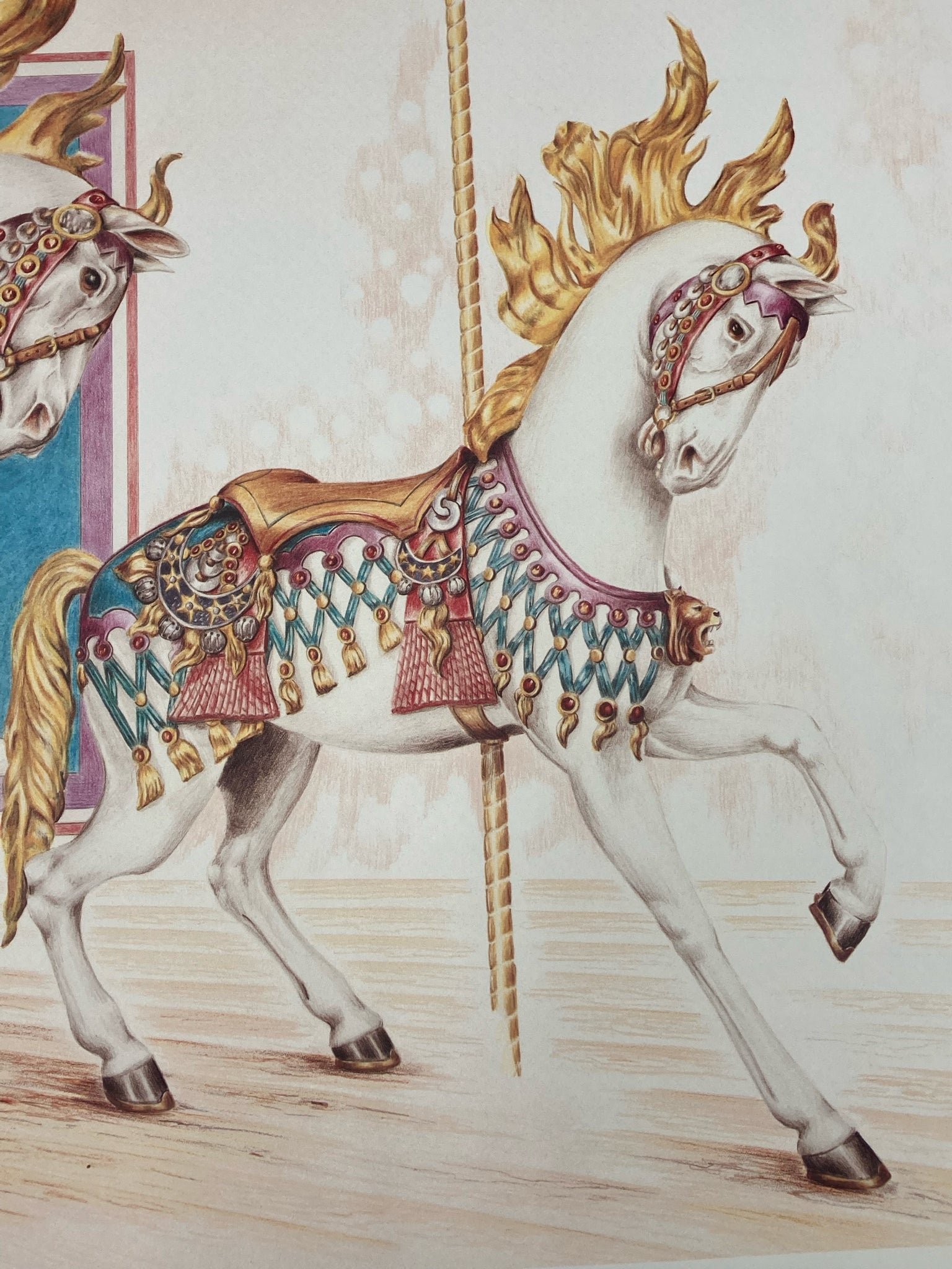 Suzy Lee Carrington signed limited edition "Illion's peek-a-boo magic" print. Lithograph on archival quality 80 pound white linen paper. Print is based on her original colored pencil drawing depicting a vibrantly colored an expressive carousel horse with a doppelganger appearing from a window. Print is signed and numbered by the artist, number 201/1000. Print measures 23" tall by 29" long and is unframed. Print is in excellent condition.