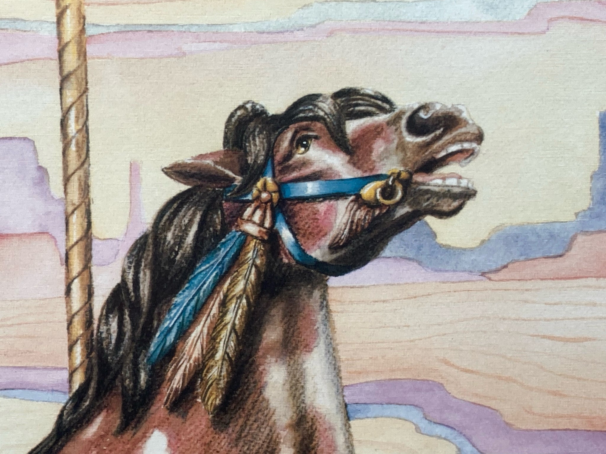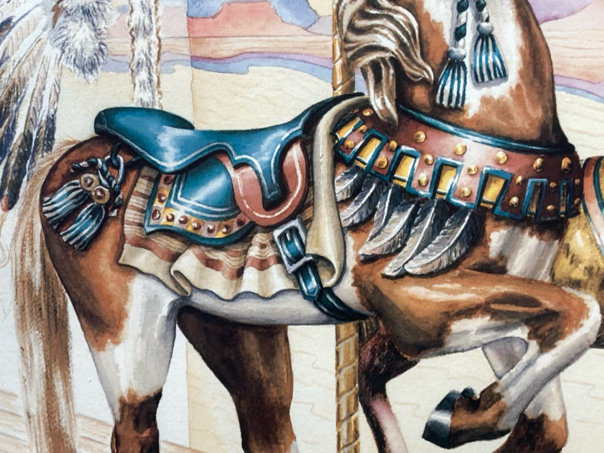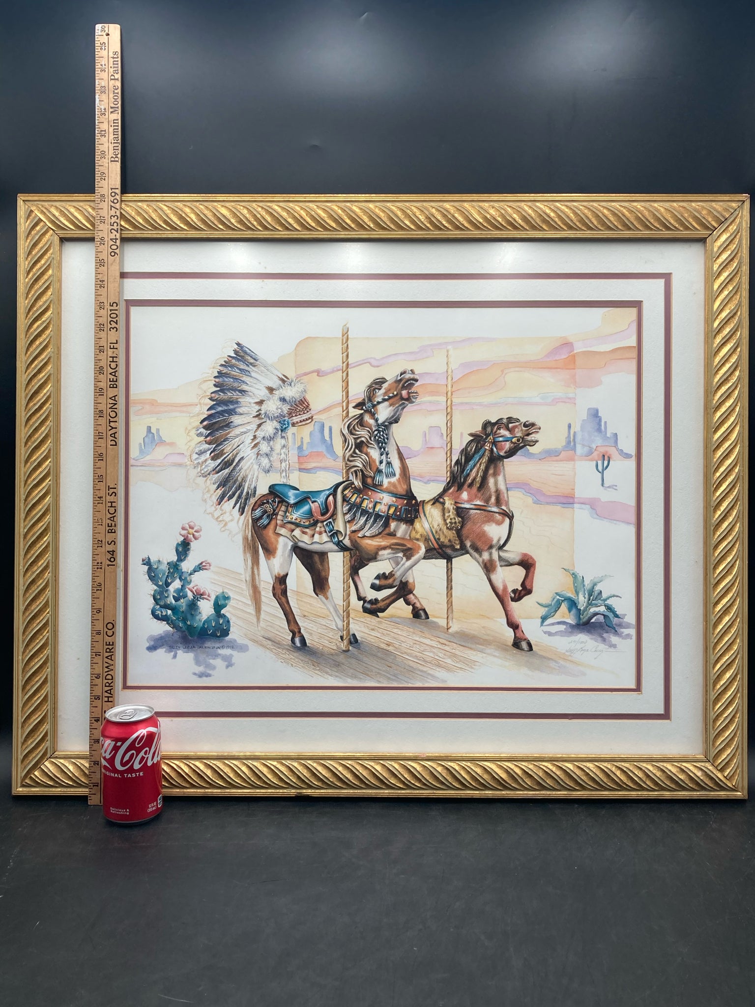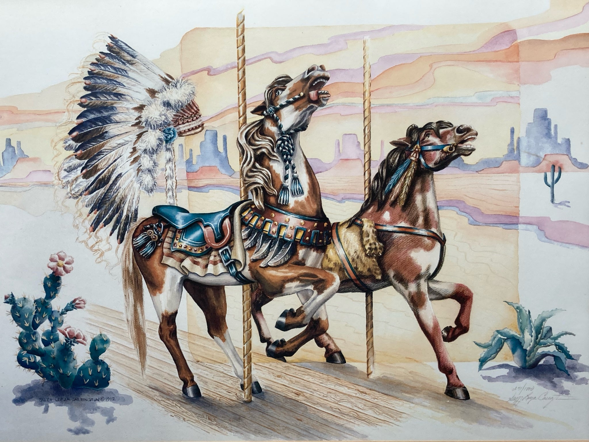 Suzy Leeja Carrington signed "Magic on the Mesa" limited edition print, framed and matted. Lithograph on archival linen paper. Southwestern themed carousel horse scene with native american symbolism using vibrant colors and expressive imagery. Signed and numbered by the artist in the lower left, number 271/1000. Print measures 18" tall by 24" wide, total size with frame is 28" by 34". Some spots are visible on matting, print itself is in excellent condition.