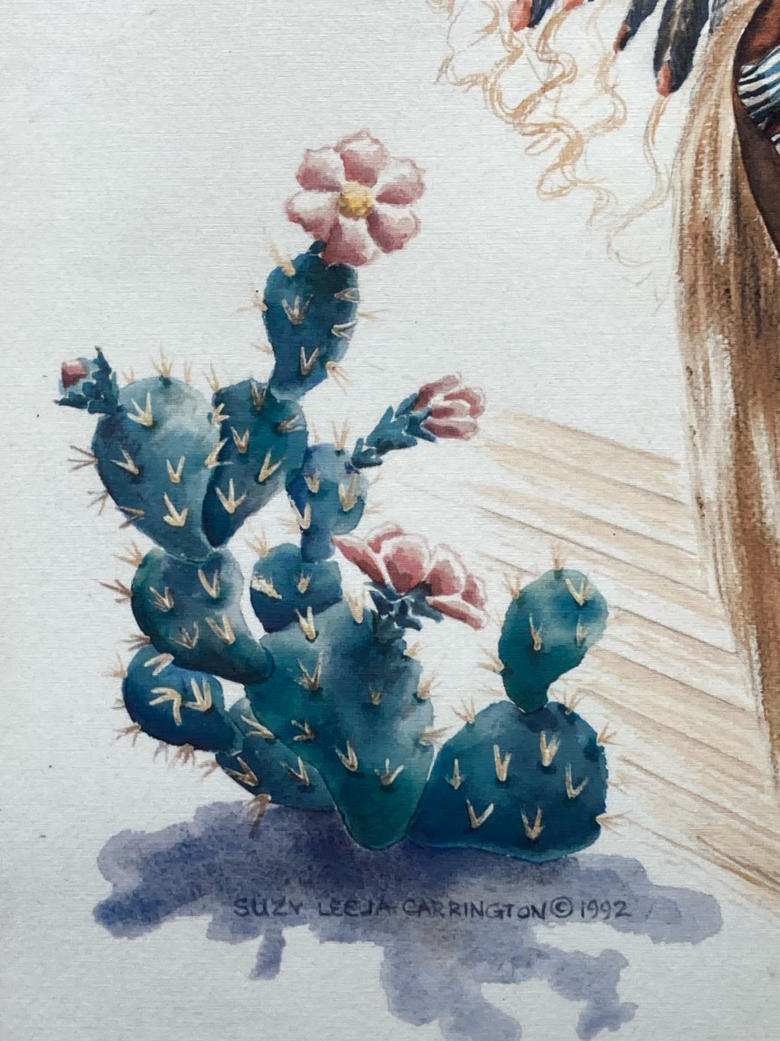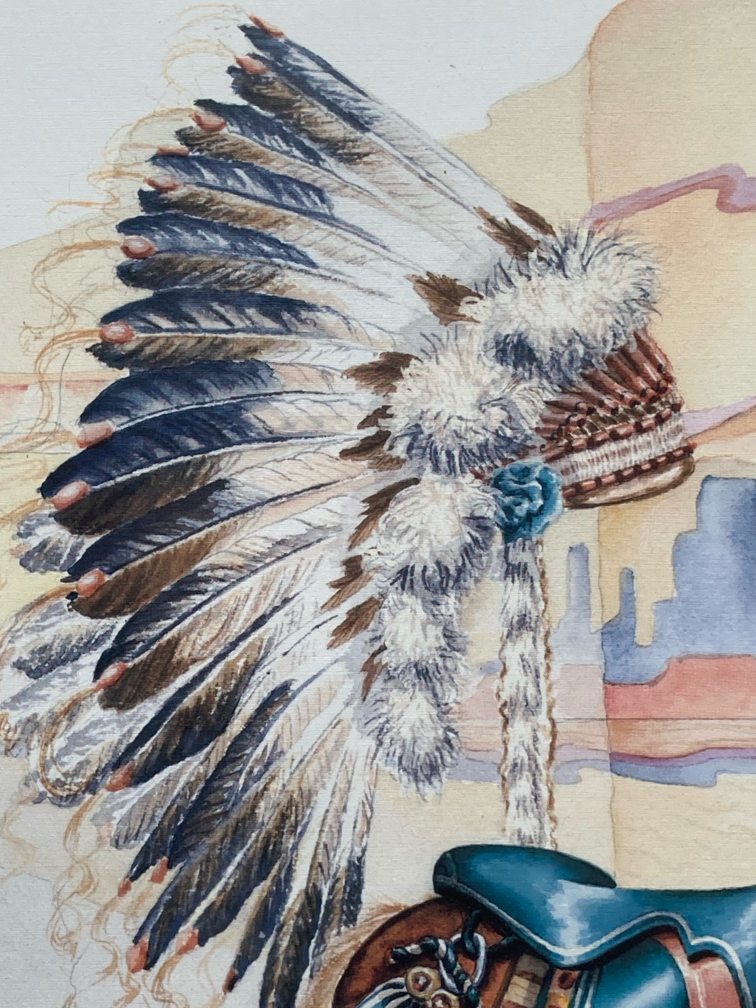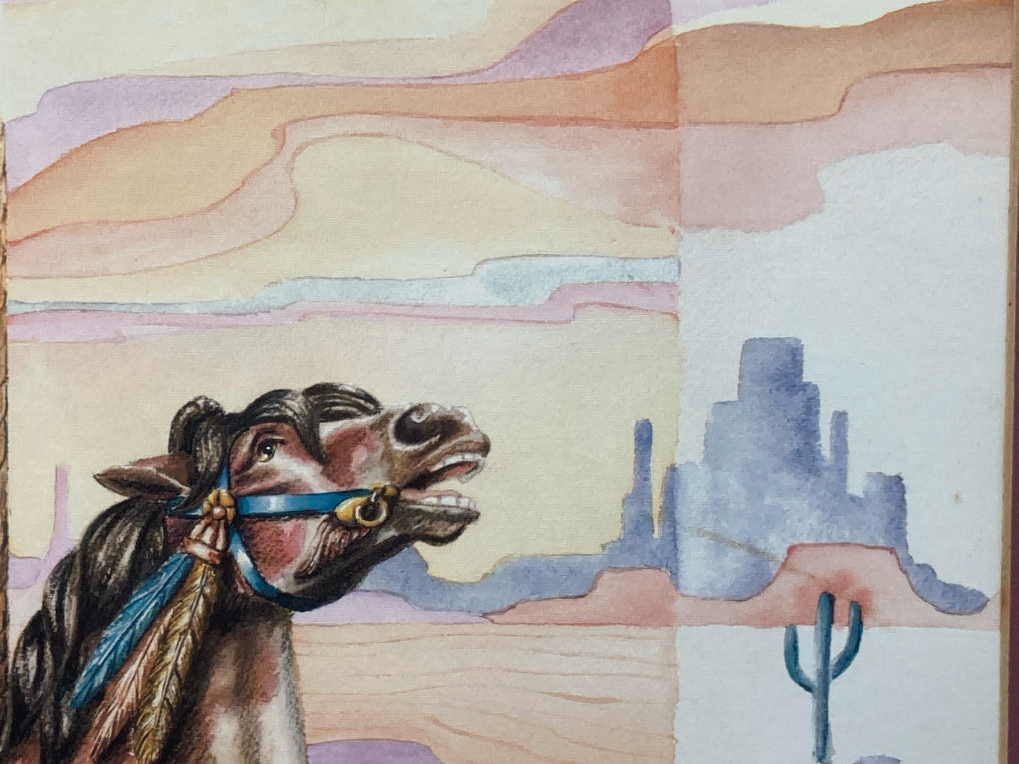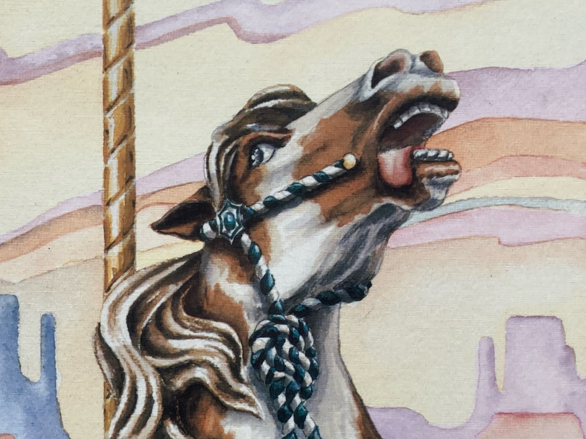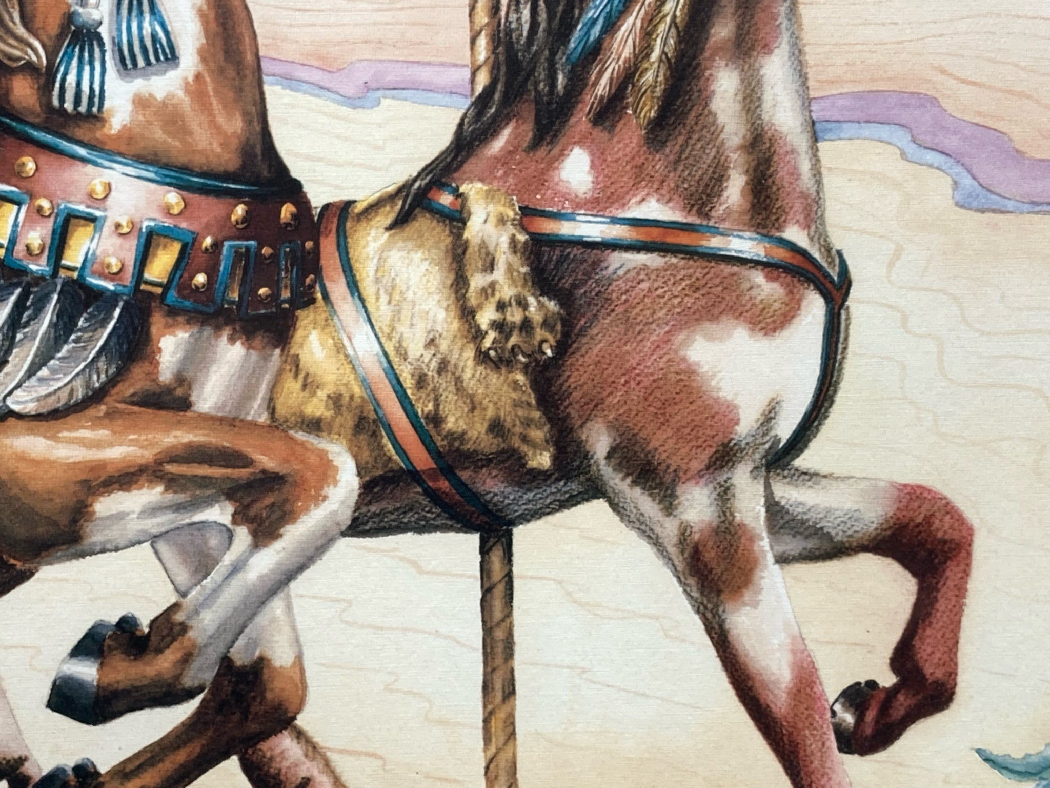 Suzy Leeja Carrington signed "Magic on the Mesa" limited edition print, framed and matted. Lithograph on archival linen paper. Southwestern themed carousel horse scene with native american symbolism using vibrant colors and expressive imagery. Signed and numbered by the artist in the lower left, number 271/1000. Print measures 18" tall by 24" wide, total size with frame is 28" by 34". Some spots are visible on matting, print itself is in excellent condition.