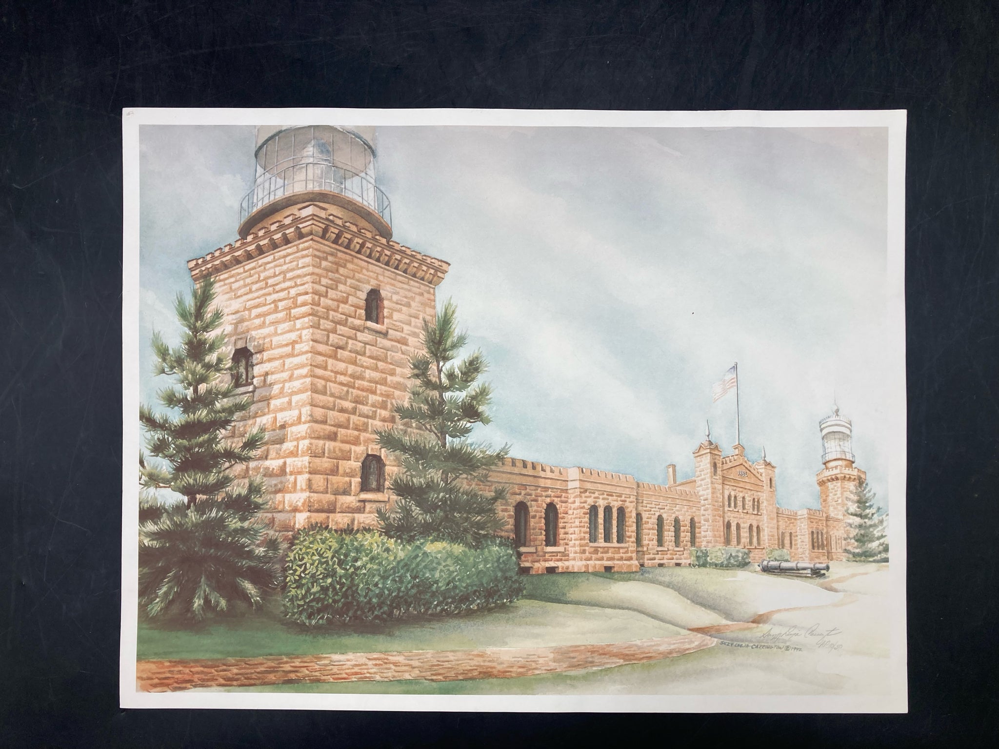 Suzy Leeja Carrington signed "Navesink twin lights lighthouse" artist proof print. Lithograph on archival quality 80 pound linen paper. High quality print based on Leeja's original painting of the famous lighthouse in New Jersey. Print is signed and numbered by Carrington, AP number 10/50. Print measures 18" tall by 24" wide. There are a few wrinkles that are visible upon close examination and are noted in photos, they are hard to see especially if the print is framed for display.