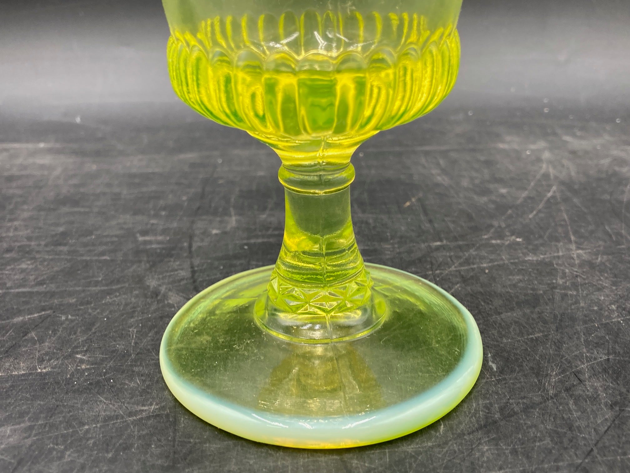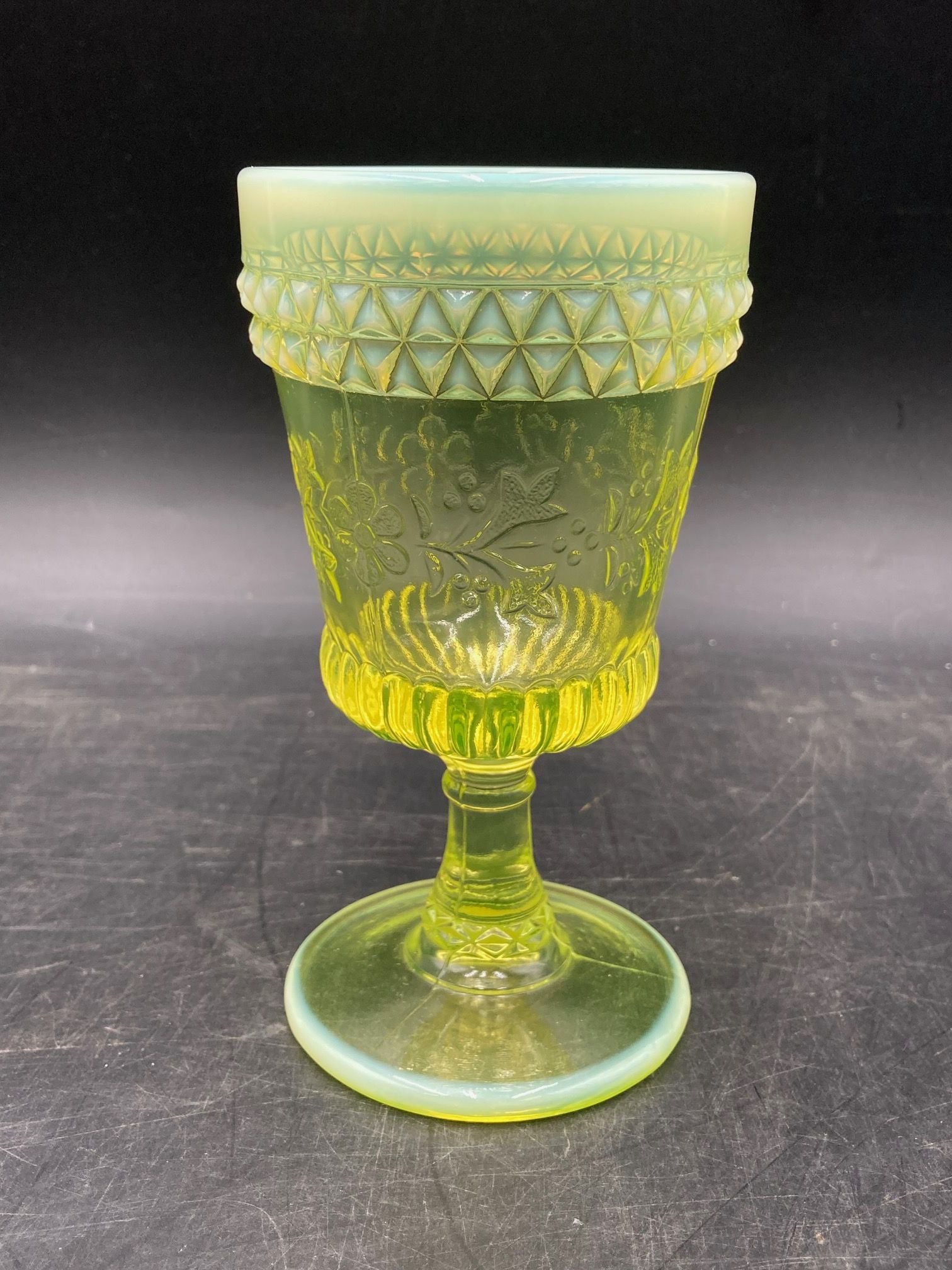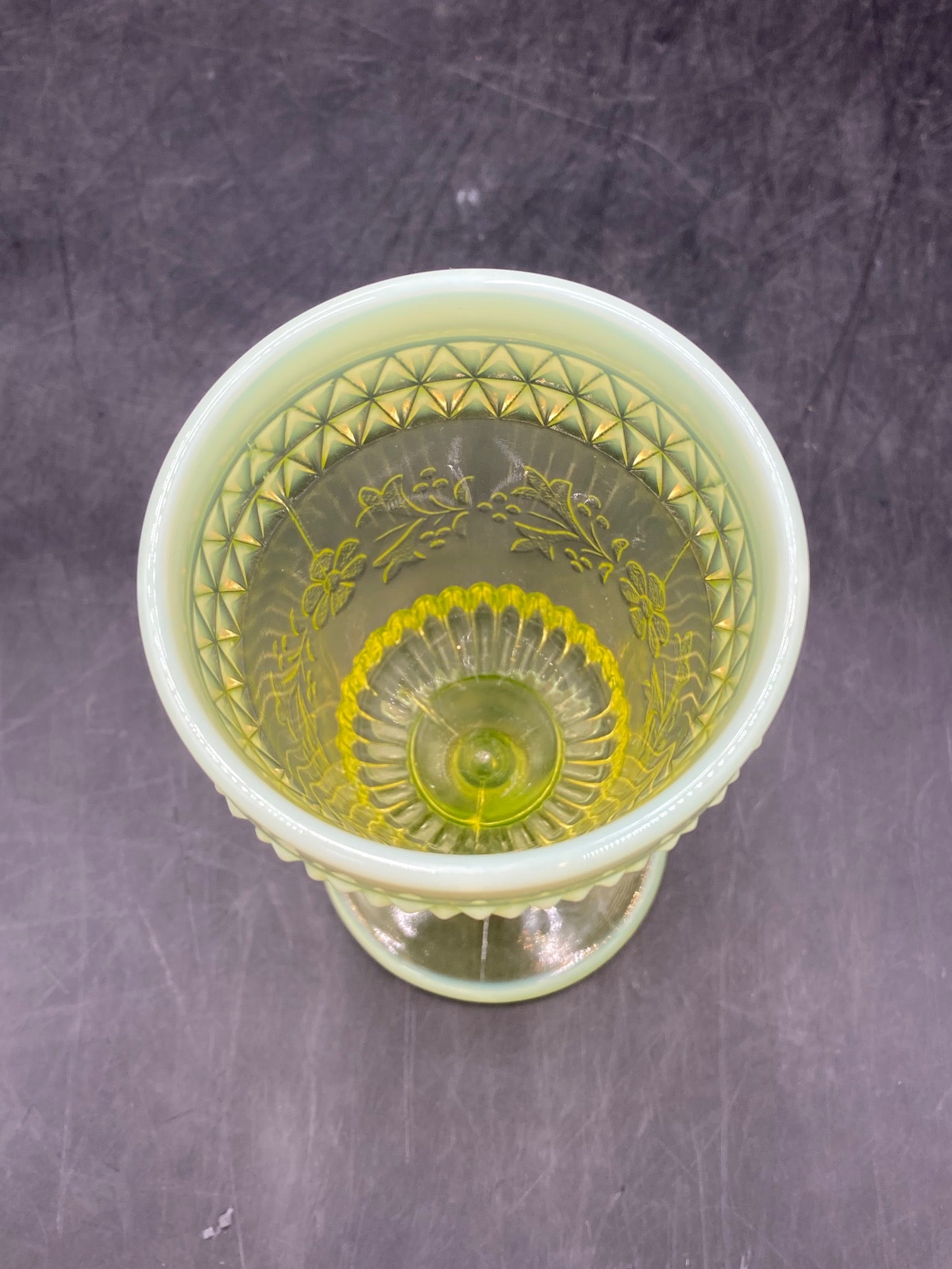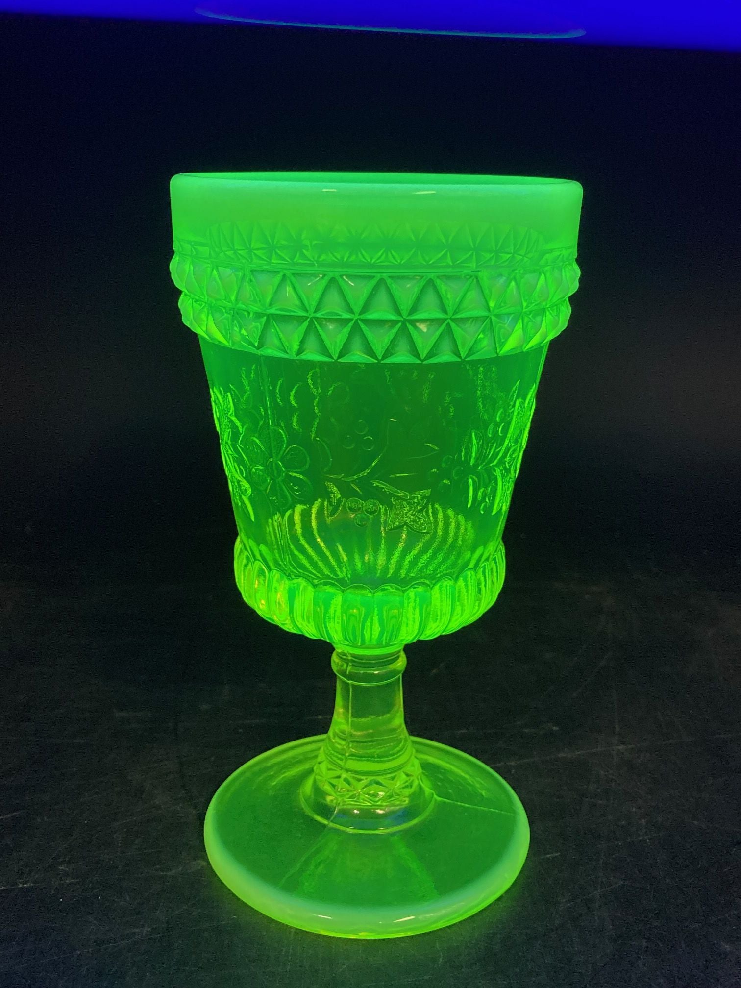 Vintage LG Wright vaseline glass goblet. Circa 1930s or 1940s. Yellow-Green colored glass with floral patterned middle and diamond pattern under rim. Glass glows under UV light. Goblet measures 6" tall. Goblet is in excellent condition with no noted crack