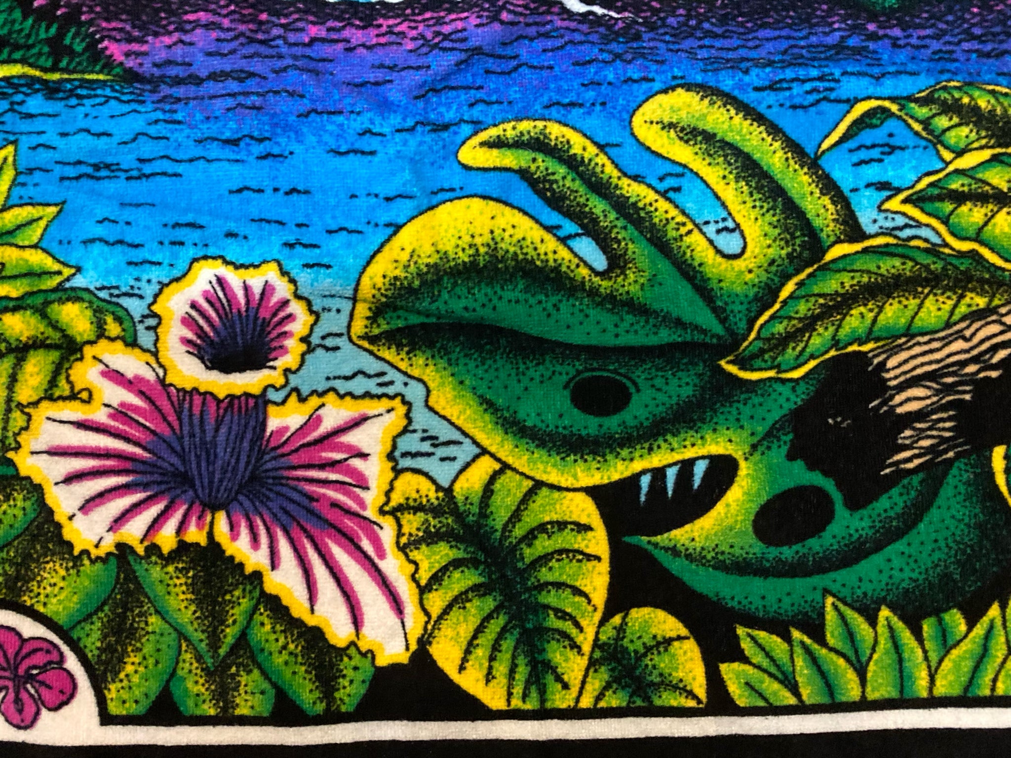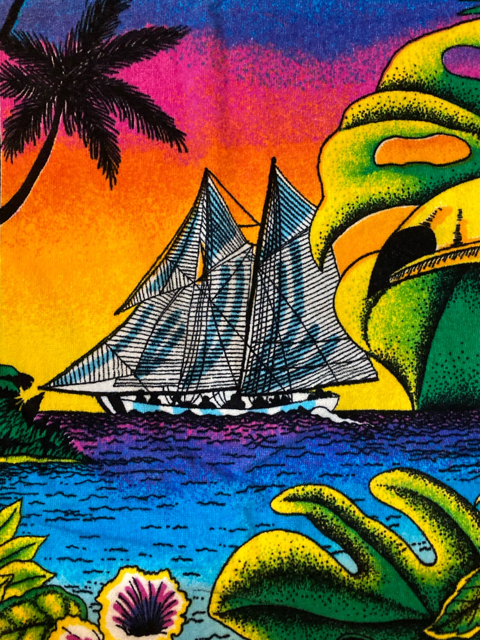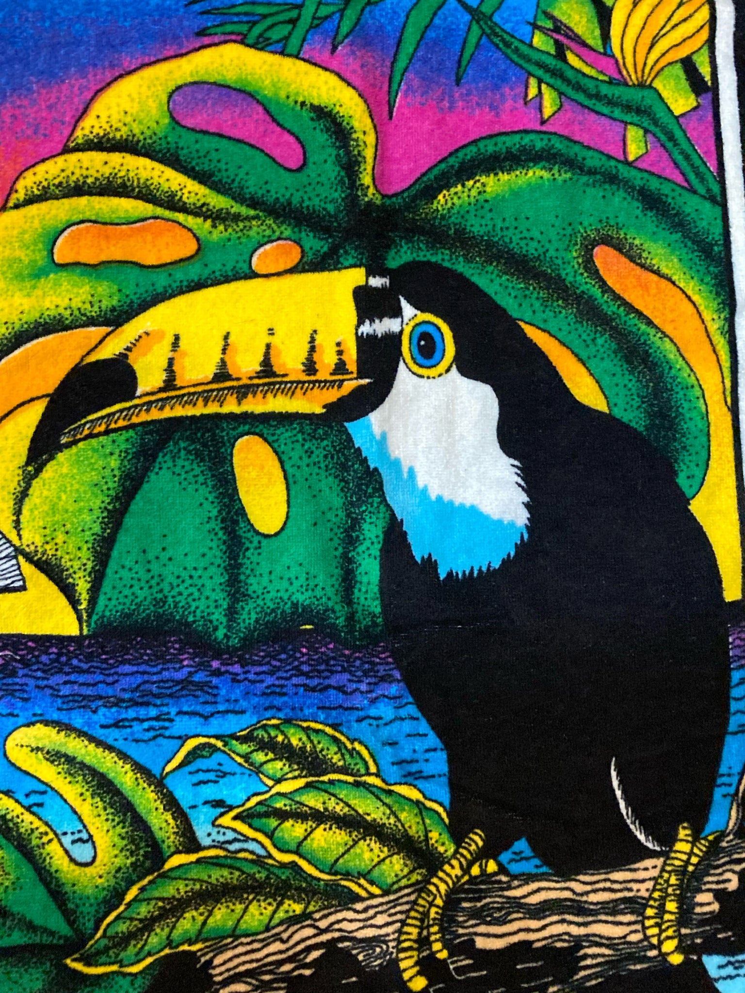 Vintage TRL brand Hawaiian Tropic beach towel. 100% cotton material. Features tropical styled designs with toucan, palm trees and ocean themes and vibrant colors. Towel measures 29" wide and 56" long. Towel is in excellent, like new condition.