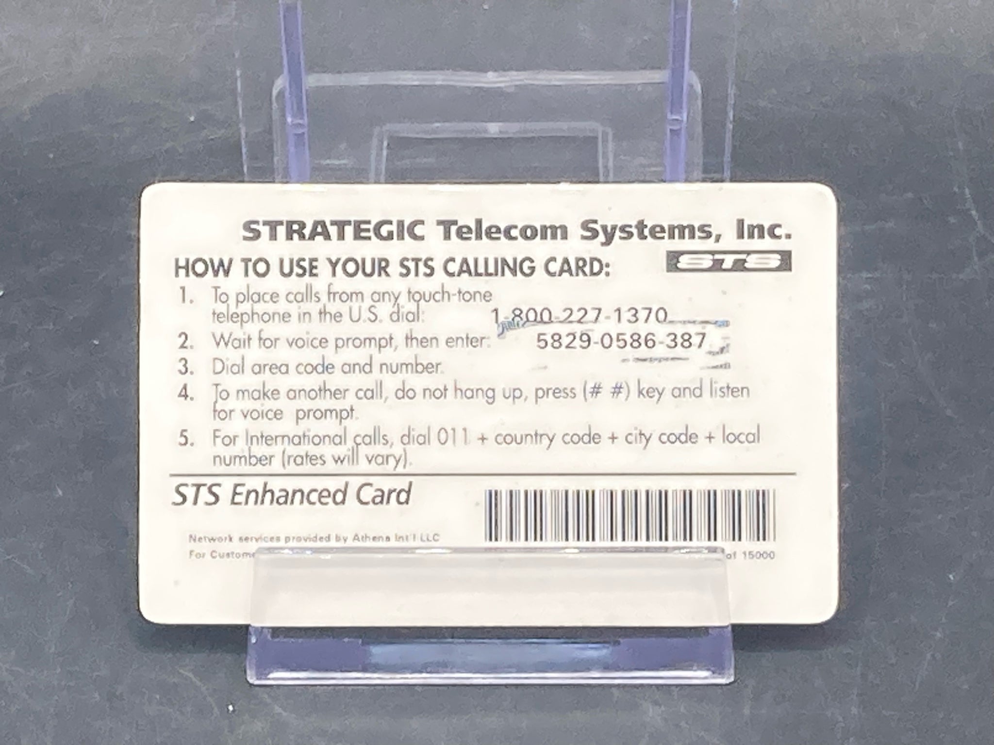 Vintage 1996 Strategic Telecom Systems phone card. 150 minutes calling card with green and black colors. Ungraded, cards are in good condition with some light scratches and smudges visible. Some cards may have activation number stripe rubbed off.