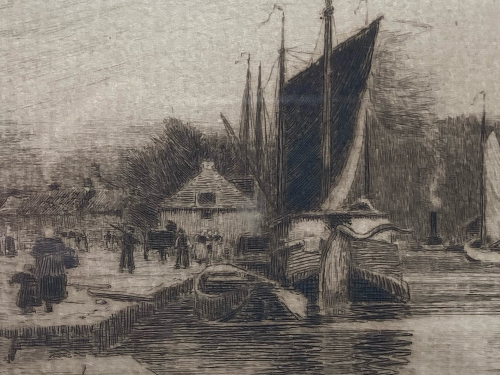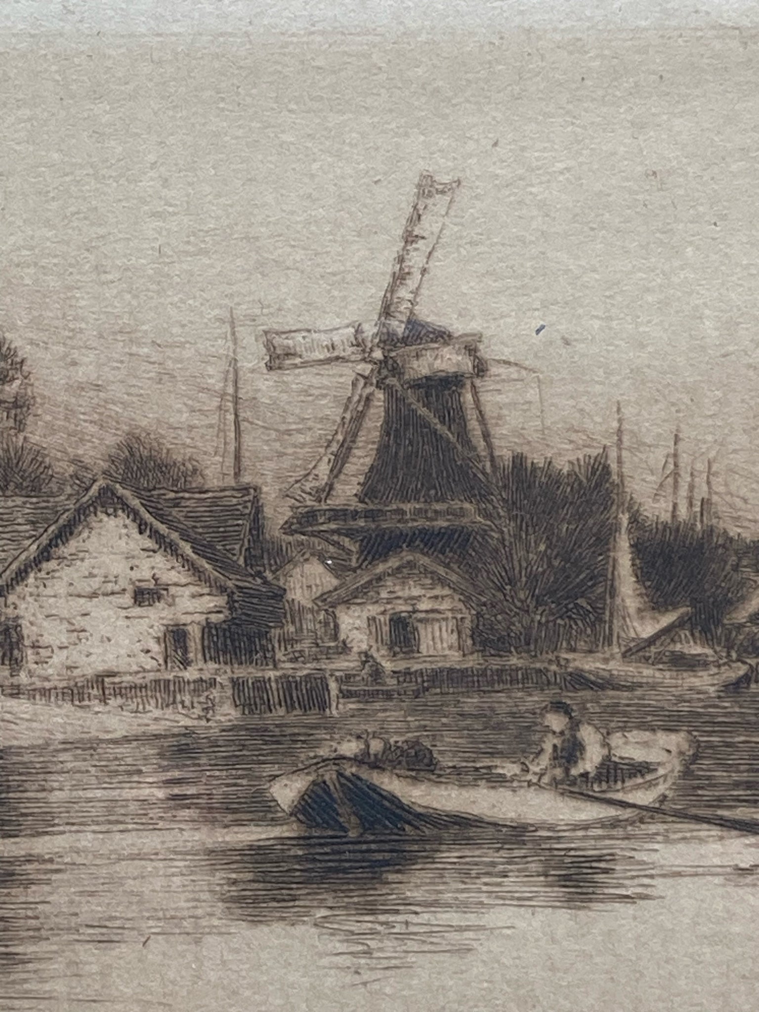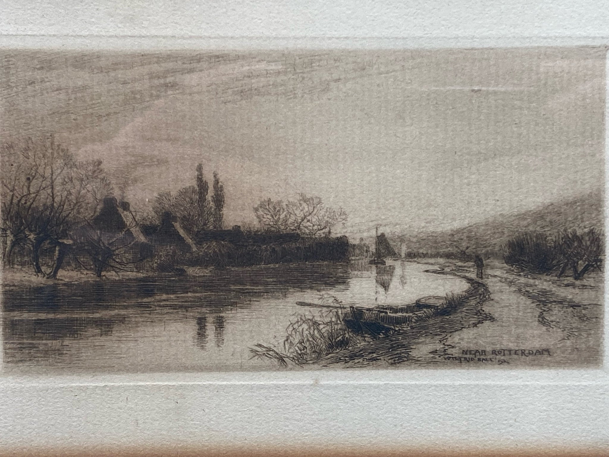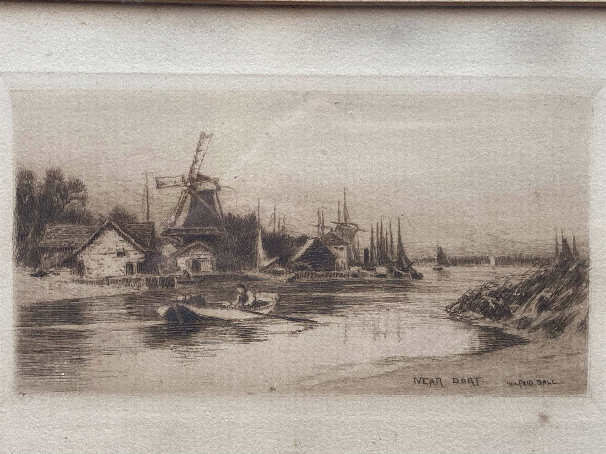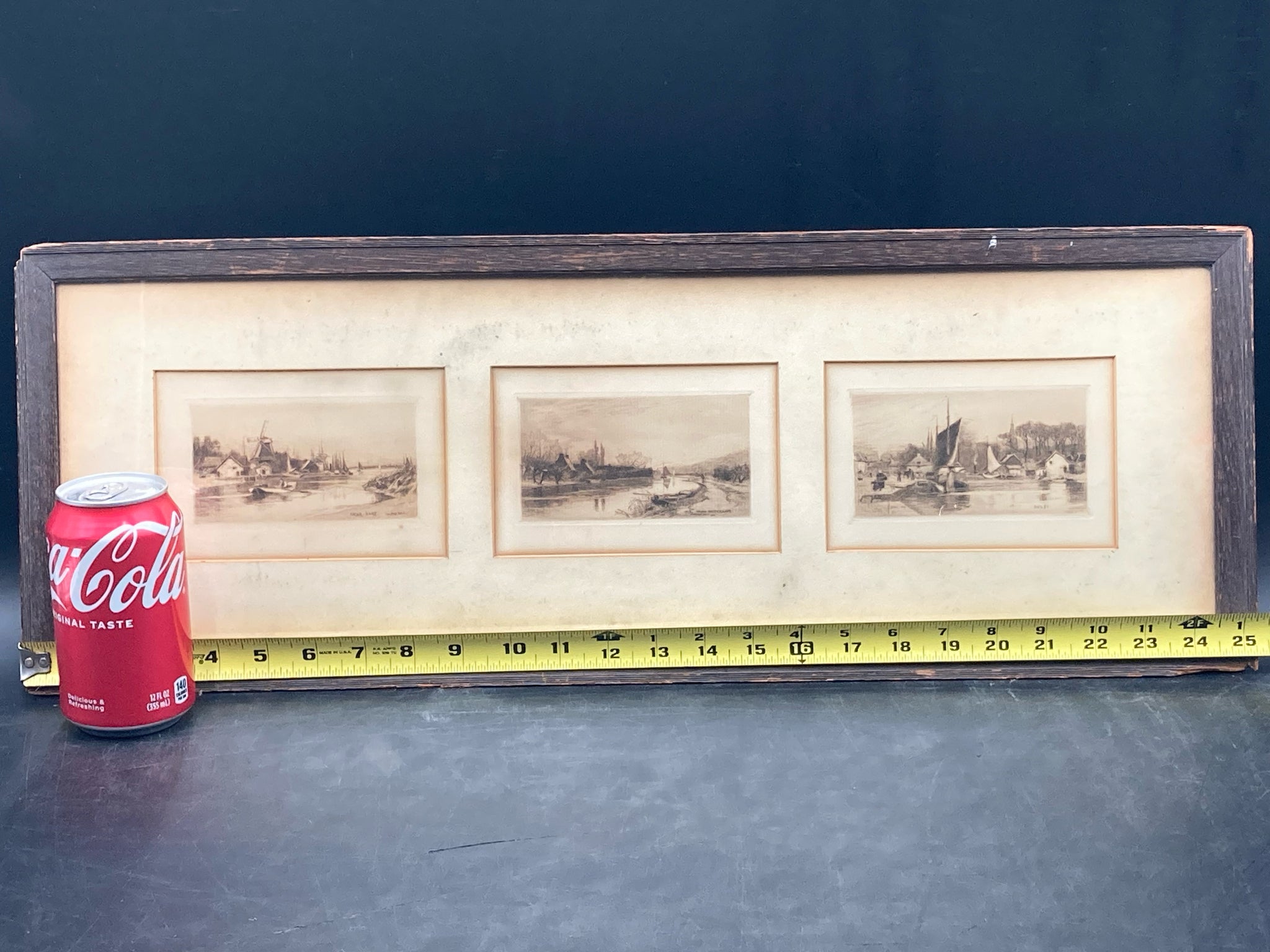 Antique Wilfrid Ball Netherlands engravings. Set of three framed and matted sepia tone engravings of different towns of the Netherlands with characteristic windmills and sailing boats prominently featured. Each engraving measures 3" tall by 5" long, two of which bearing the artists name along with the town depicted. Total size with framing measures 9" tall and 24" long. Some wear to frame and light staining to matting, engravings are in good condition.