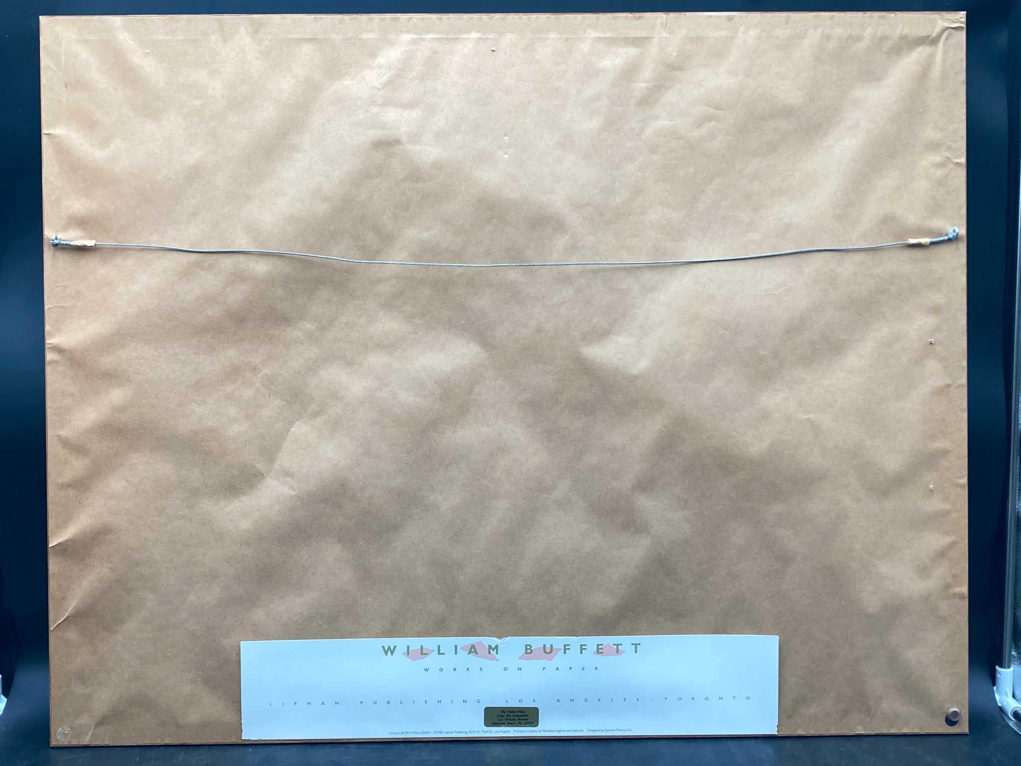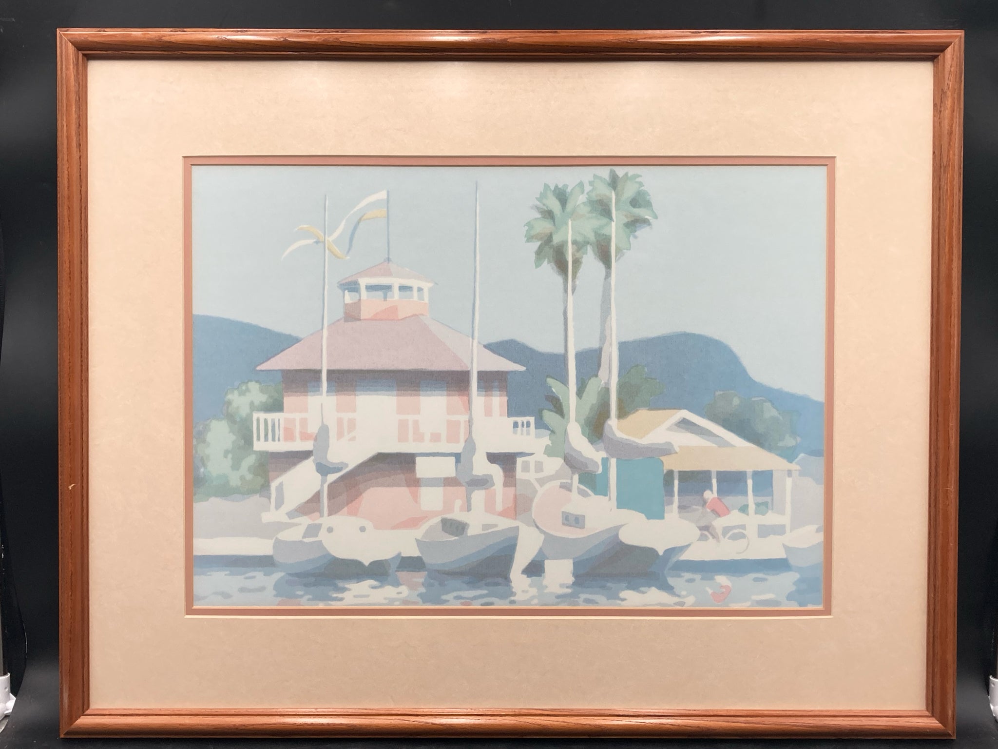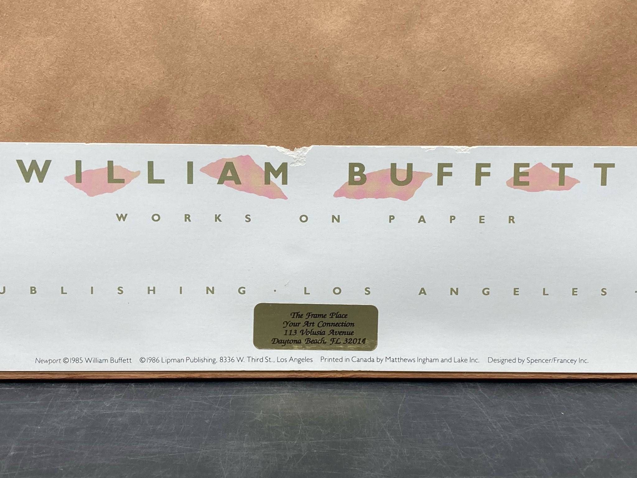 William Buffett "Newport" serigraph print, framed and matted. Print is based on Buffett's original watercolor of the famous harbor with boats in the foreground, done his distinct style with pastel tones. Print measures 16" tall by 24" long, total size with frame is 26" tall and 34" wide. Backside has an informational attachment with the name of the work and when it was printed, done in 1986. Frame has some wear and colors a bit muted, overall print is in good condition.