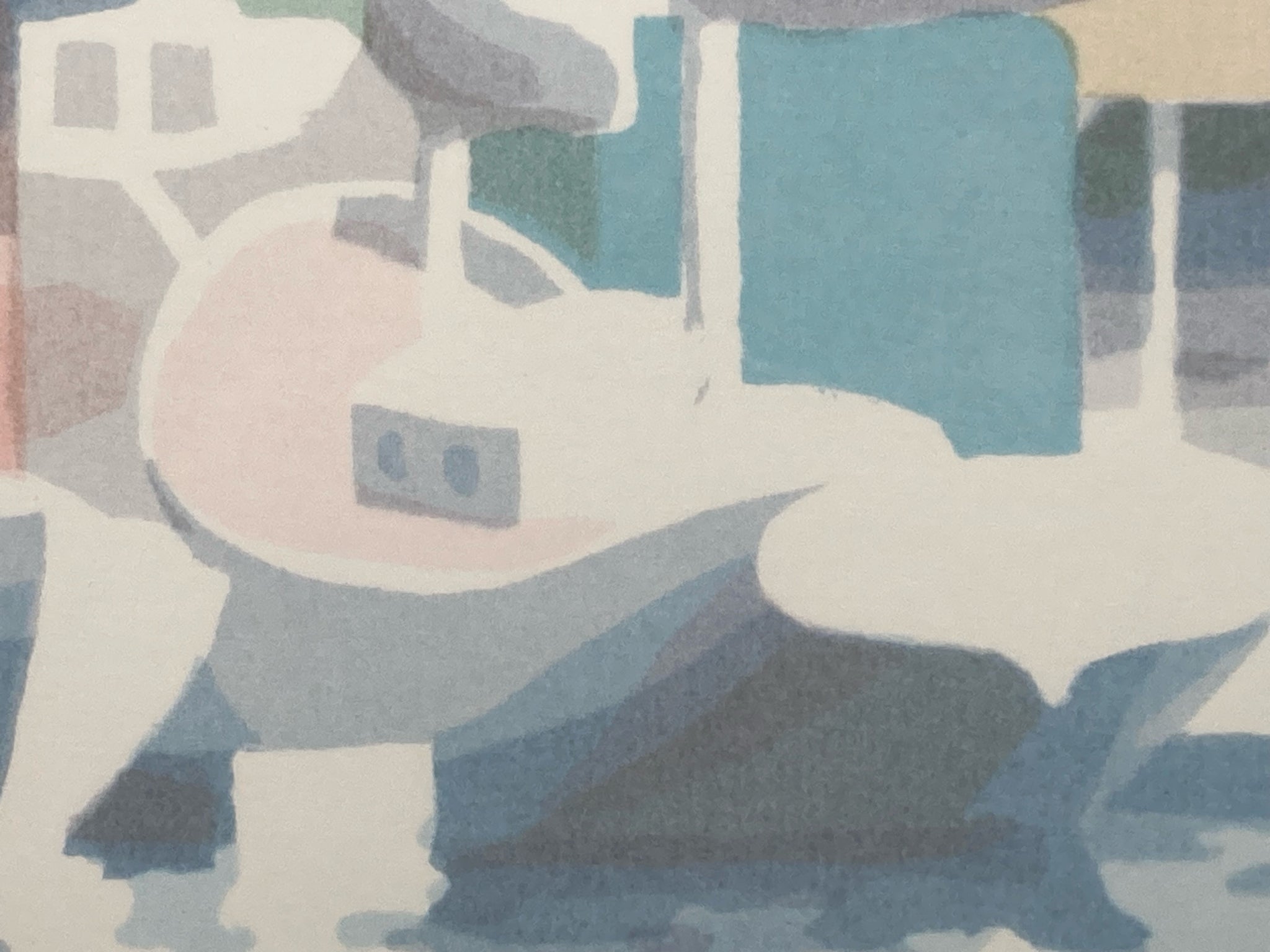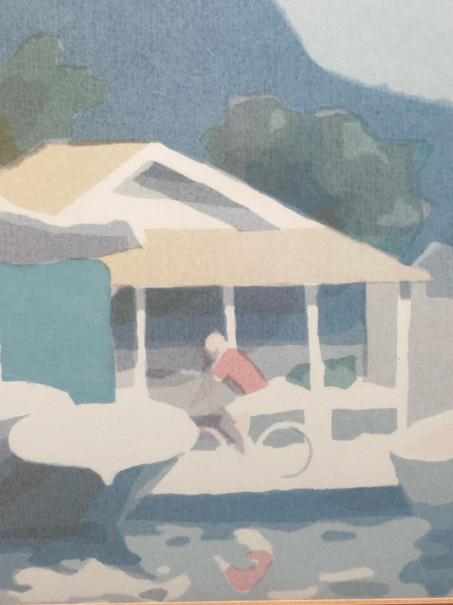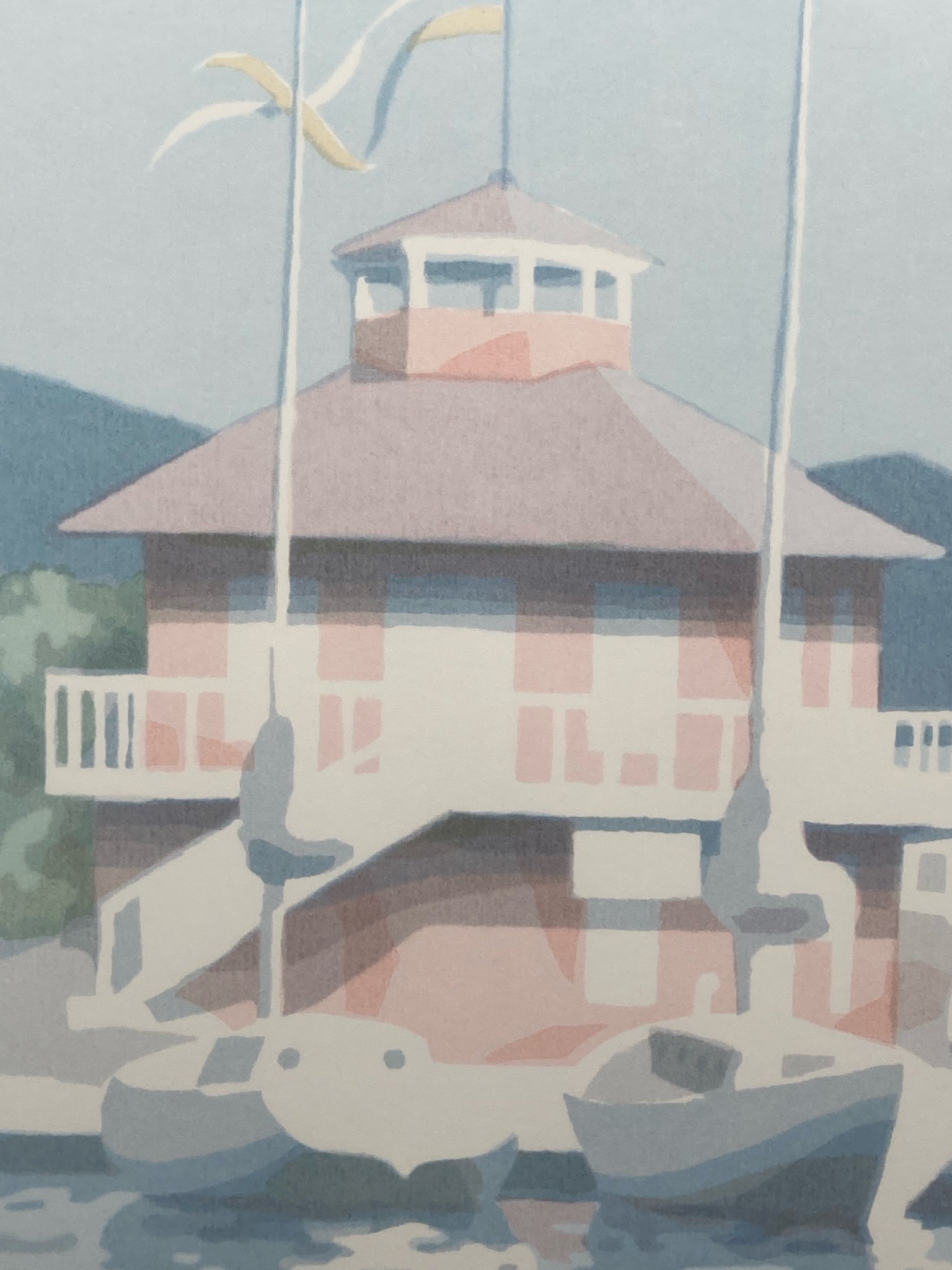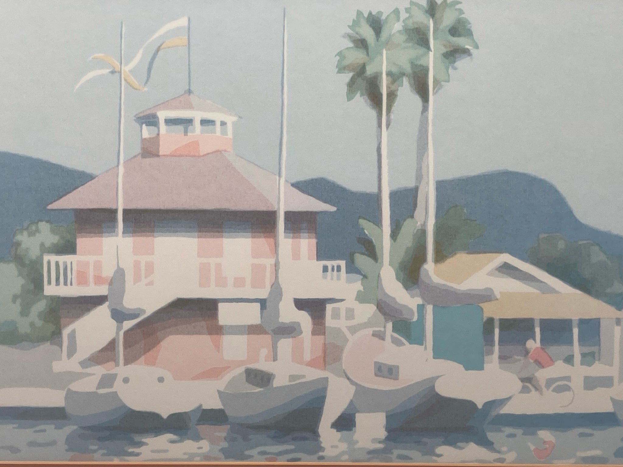 William Buffett "Newport" serigraph print, framed and matted. Print is based on Buffett's original watercolor of the famous harbor with boats in the foreground, done his distinct style with pastel tones. Print measures 16" tall by 24" long, total size with frame is 26" tall and 34" wide. Backside has an informational attachment with the name of the work and when it was printed, done in 1986. Frame has some wear and colors a bit muted, overall print is in good condition.