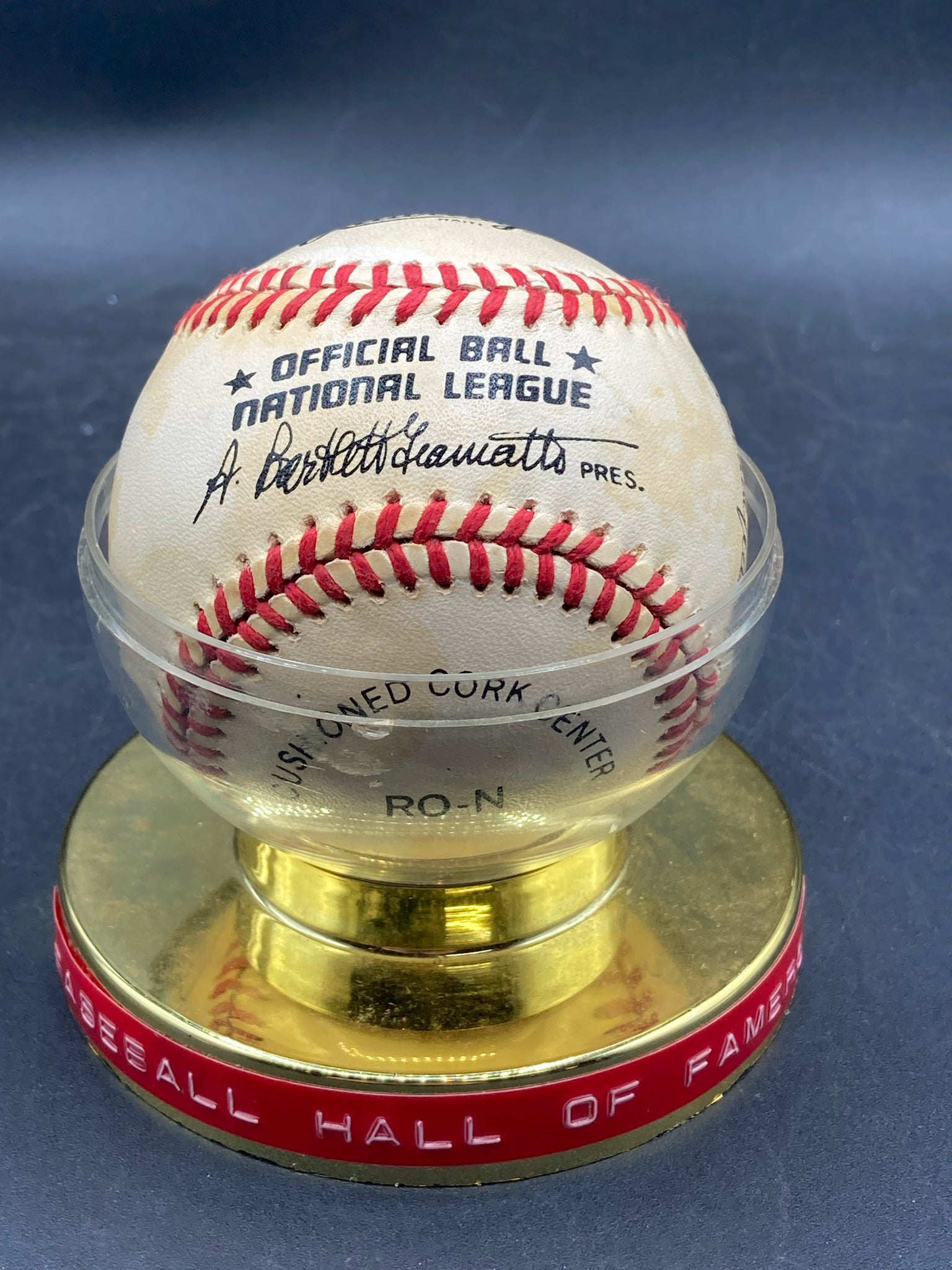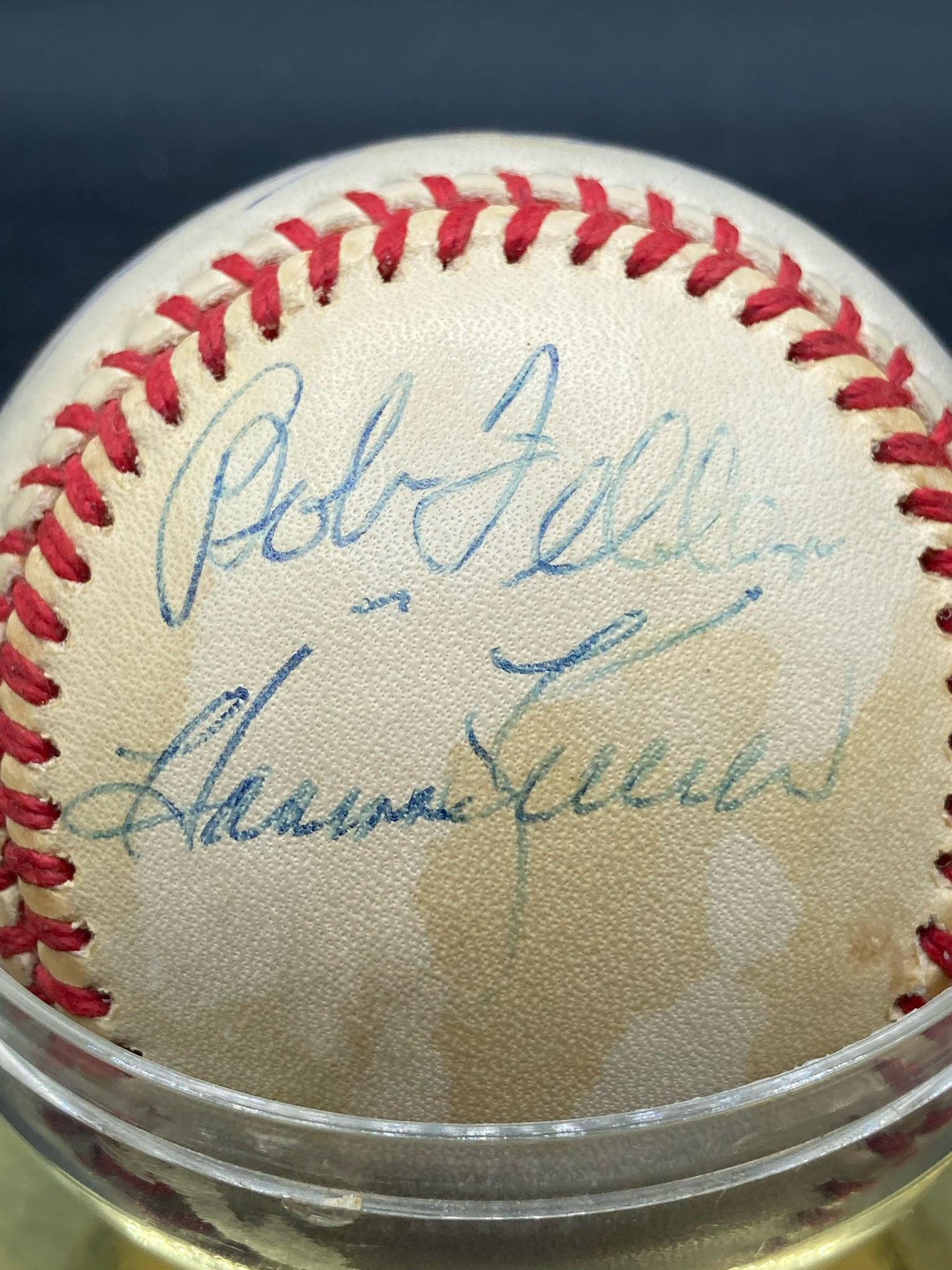 MLB hall of famers multi signed baseball with display case. Ball is signed by eight hall of fame players; Billy Williams, Enos Slaughter, Bob Feller, Duke Snider, Harmon Killebrew, Willie Stargell, Robin Roberts, and Don Drysdale. Ball has some light discoloring from age, signatures are in good, legible condition. Ball overall is in good, display worthy condition. Does not have authentication.