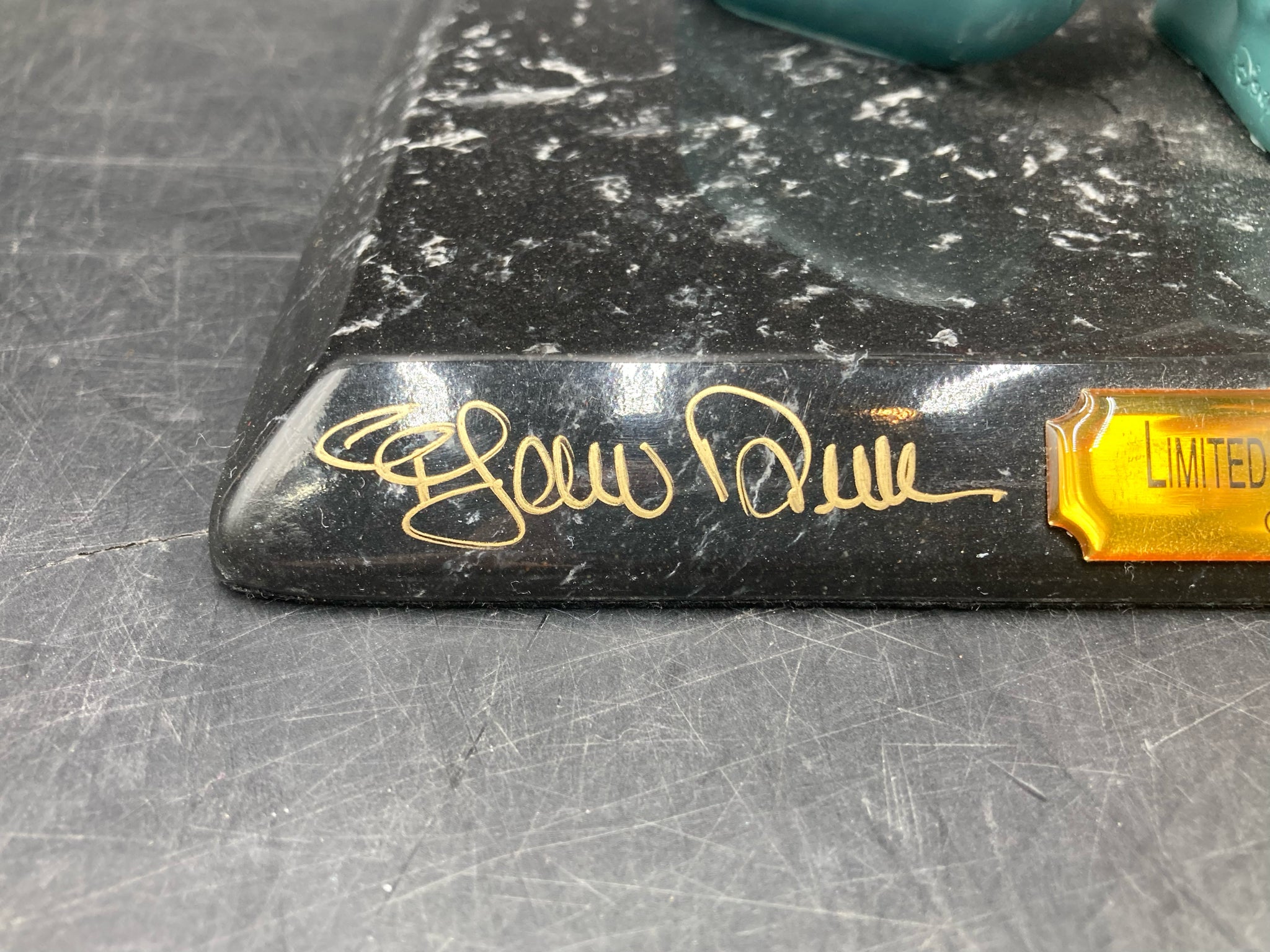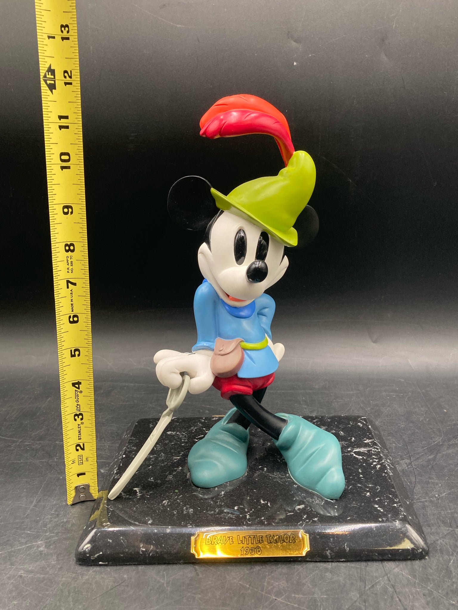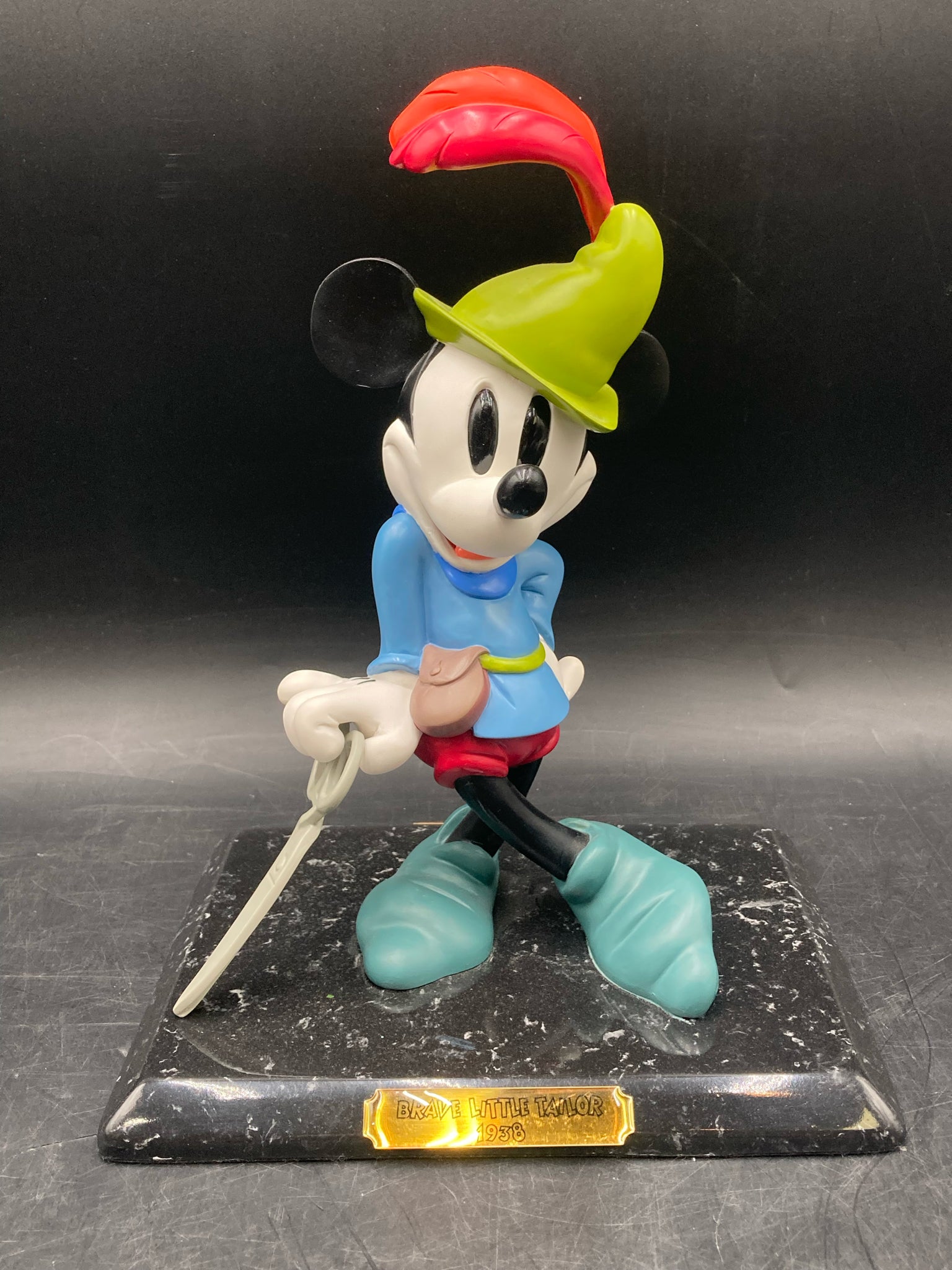Disney 1996 Mickey Mouse "Brave little tailor" signed limited edition statue. Colorful and accurately styled and detailed depiction of Mickey Mouse from a famous scene of the 1938 cartoon of the same title. Statue is mounted to a black colored sold marble base. Statue is signed and dated by Disney artist Marc Delle, dated 9/3/1996. Statue is from a very limited run of only 1500 pieces. Statue measures roughly 12" tall and 9" wide. Statue is in excellent condition.