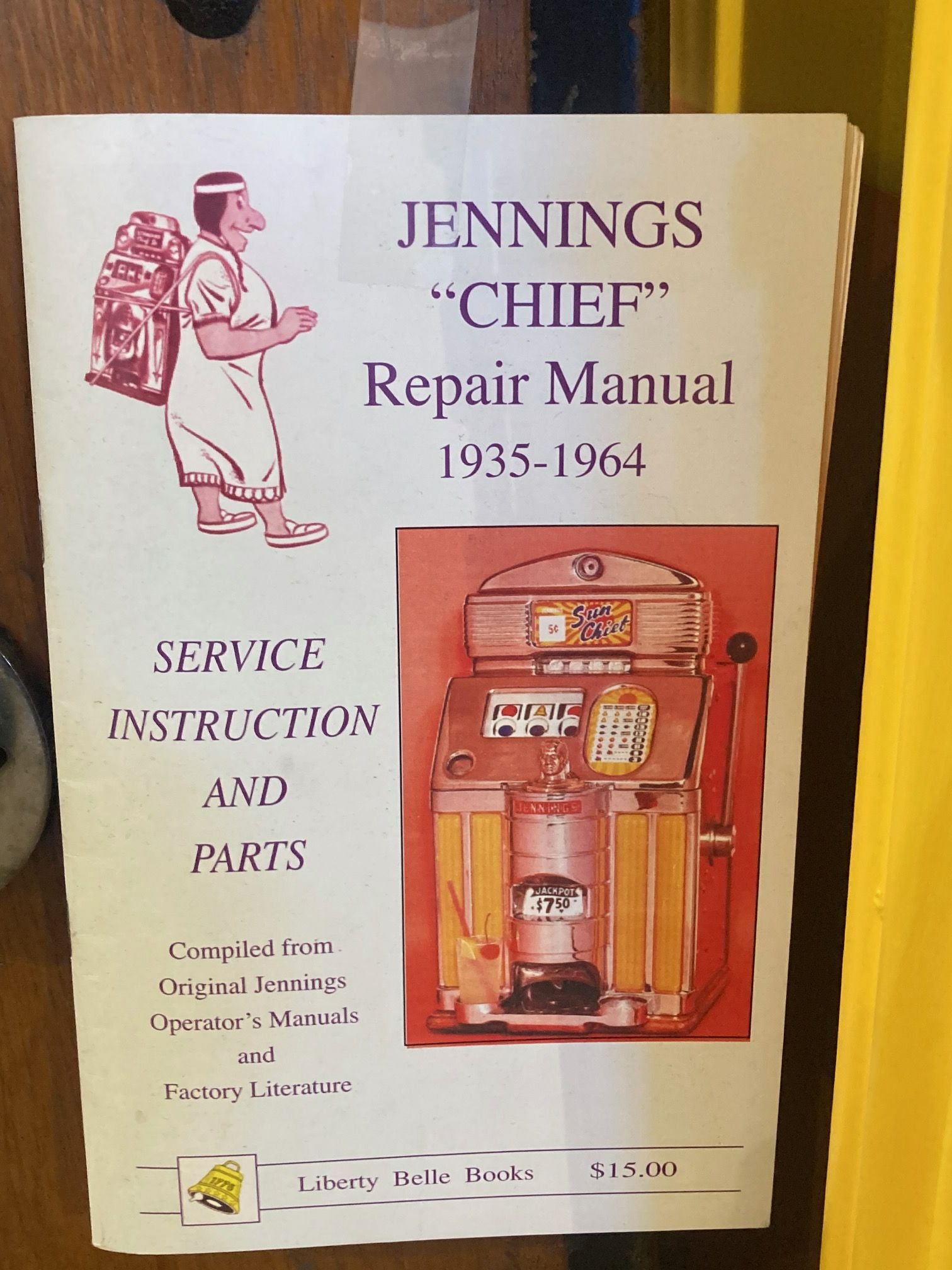 Vintage 1940s Jennings Standard Chief 10-Cent Slot Machine with original owner's manual. Brass metal and wood panels. Slot machine currently does not spin the slots when the handle is pulled, and there is some general wear and scuffs to the metal and wood. Graphics are in good condition and retain nice, vibrant color. Excellent for a restoration project!