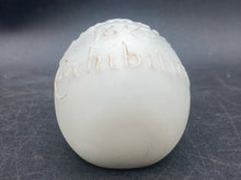 Antique 1893 World's Fair Columbian exhibition Mt. Washington egg shaped salt shaker. Frosted white glass body with gold tone painted world's fair lettering and screw off iron shaker top. Flat base for resting on table tops. Measures 3" long. Coloring on lettering is faded and there is some corrosion to metal head, otherwise item is in good condition with no damage to glass body.