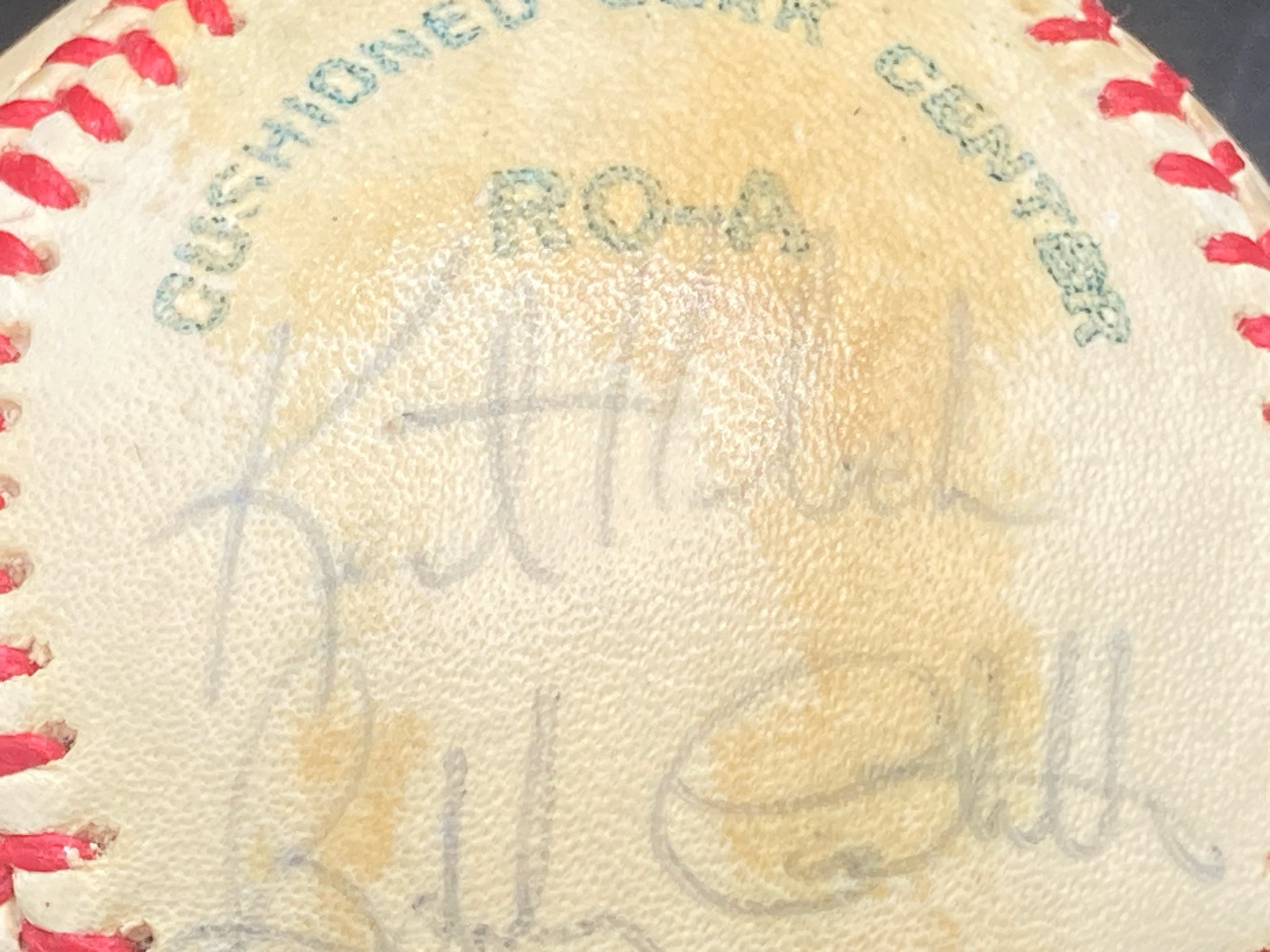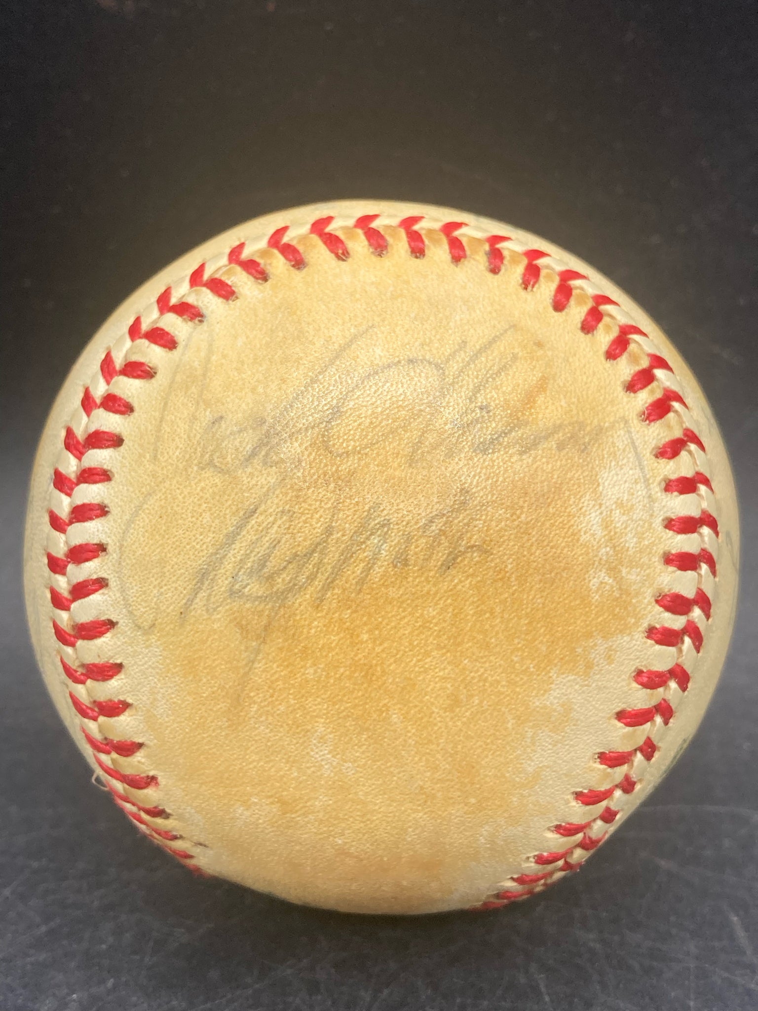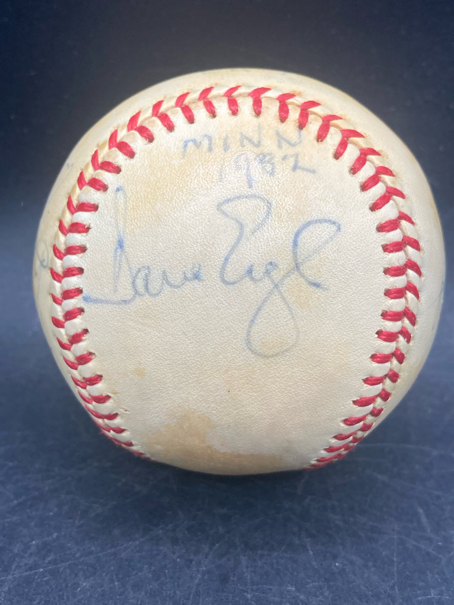 1982 Minnesota Twins team signed baseball. Ball was signed by the players during spring training in Vero Beach, Florida. Ball features eight signatures from members of the 1982 Twins team including key autographs from kent Hrbek and Dave Engle. Ball has some areas of yellowing, otherwise it is in good physical condition. Signatures are clear and legible, though a couple have some fading. Ball is not authenticated.