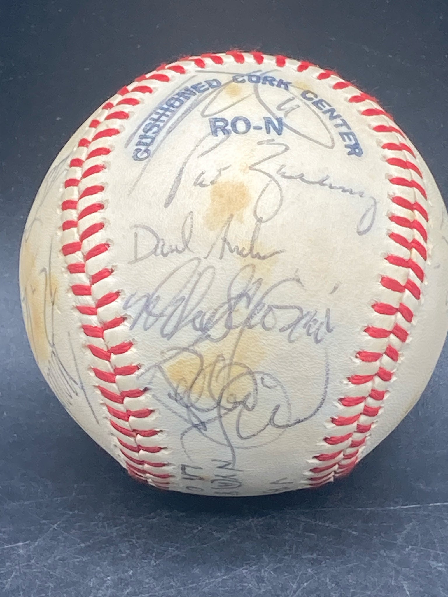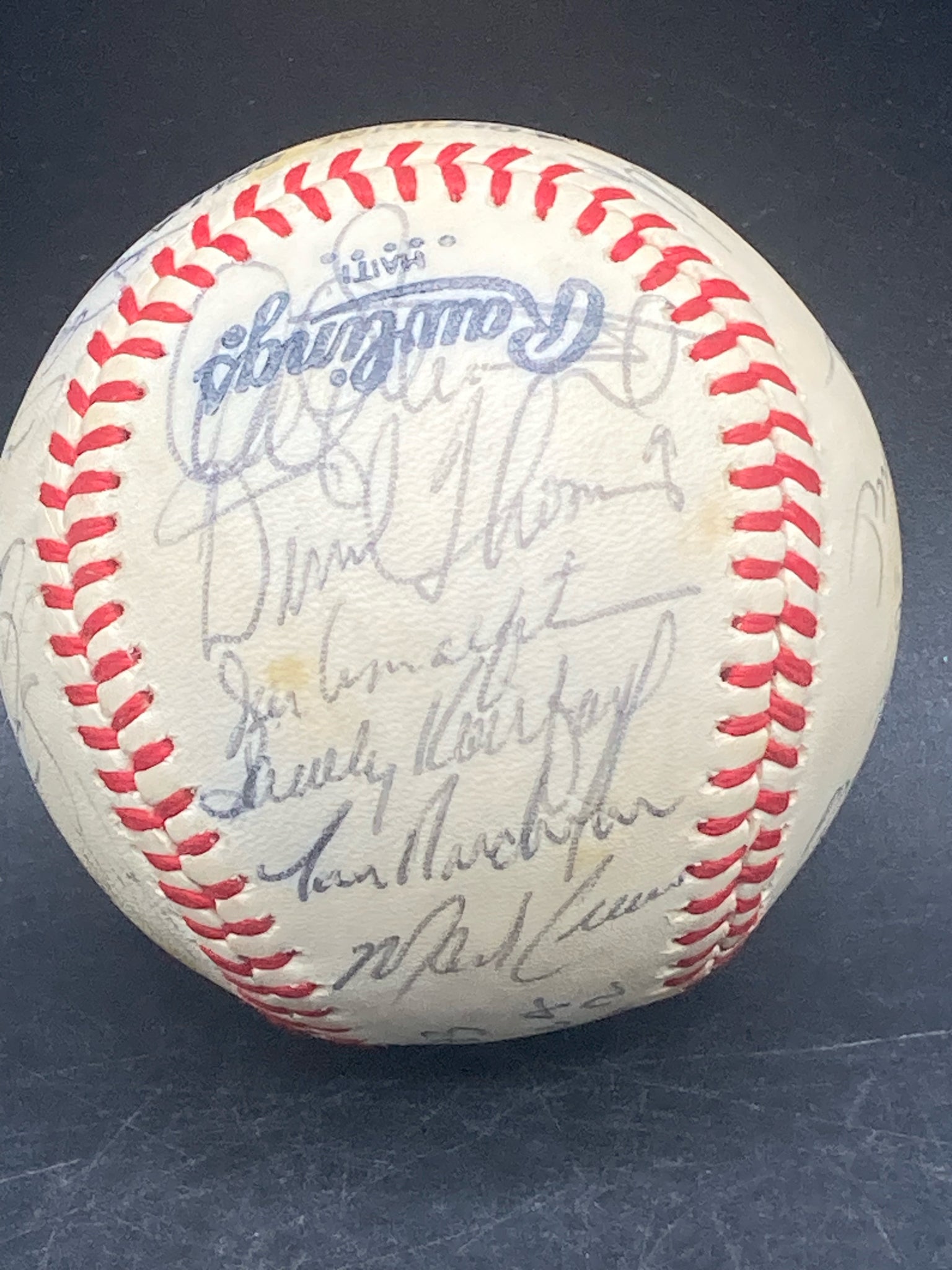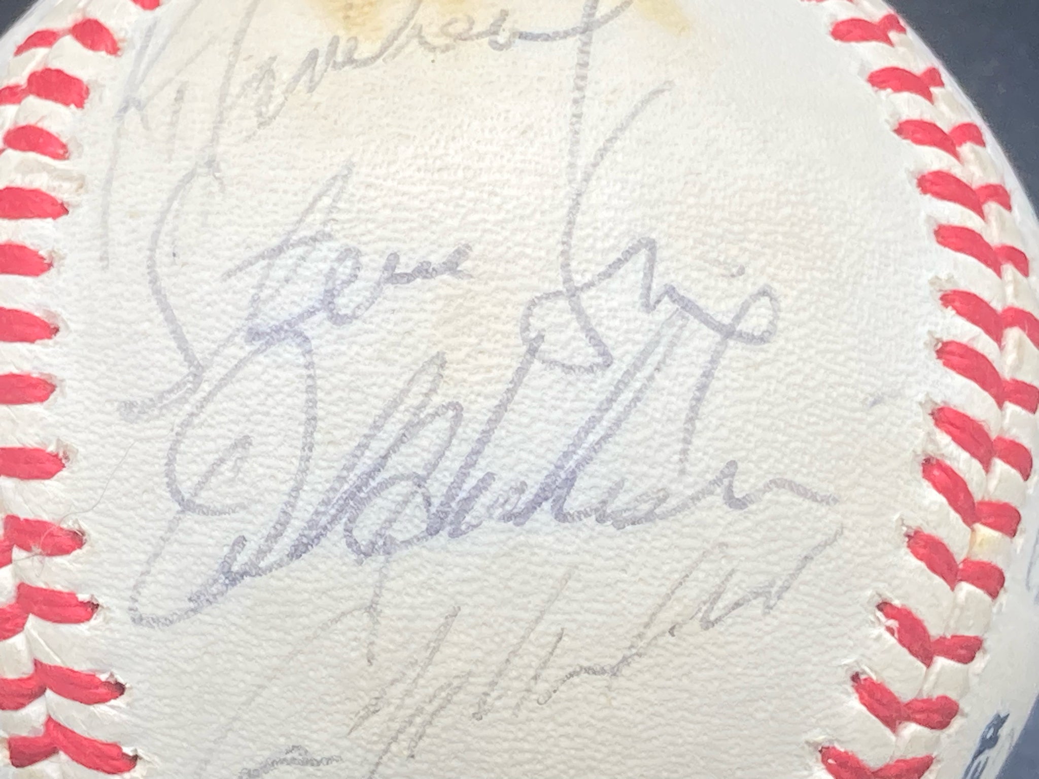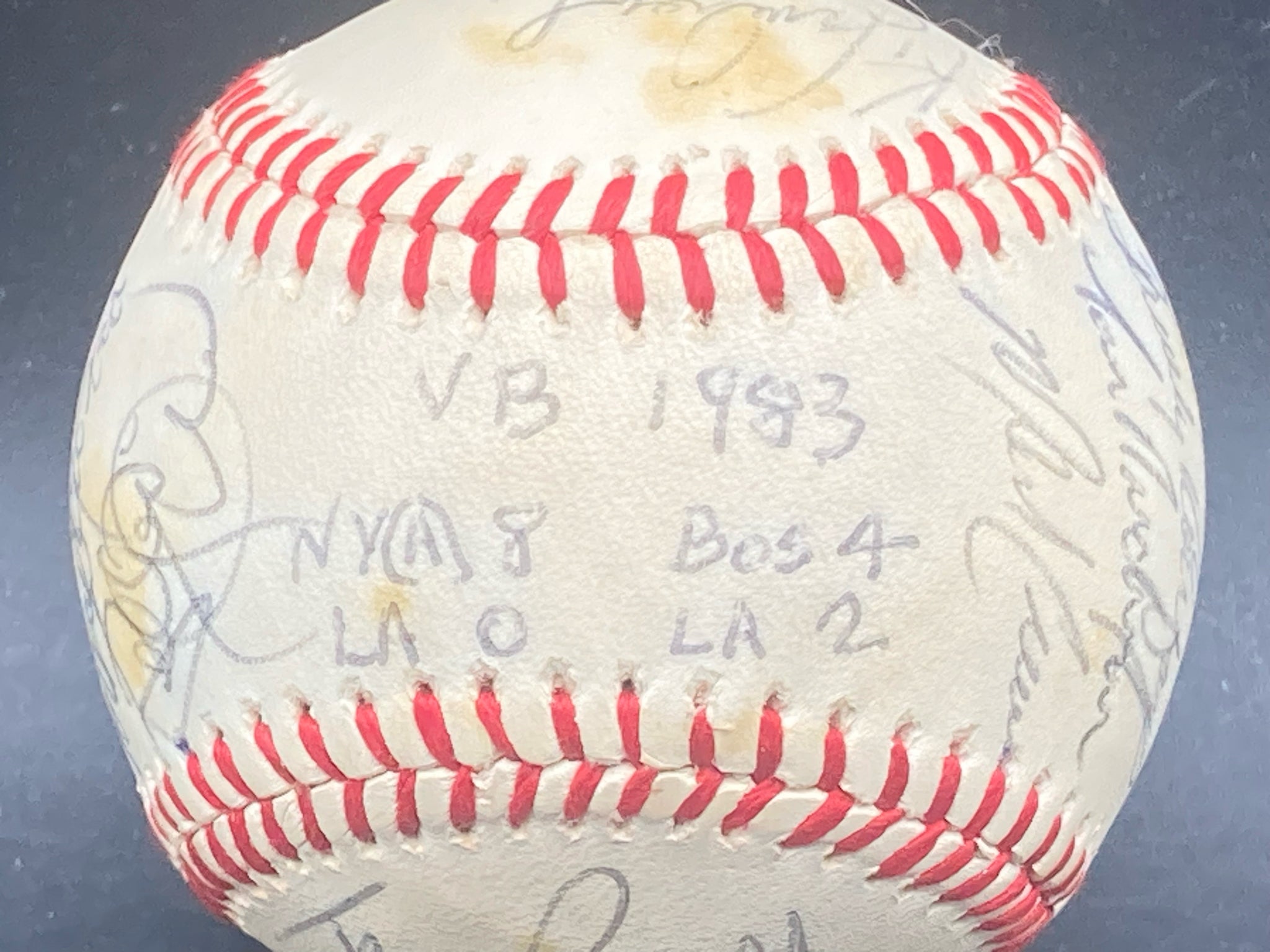 1983 Los Angeles Dodgers team signed baseball. Ball was signed by the players during spring training in Vero Beach, Florida with game scores from the day inscribed on the sweet spot. Ball features twenty two signatures from the 1982 Dodgers team with key autographs from Orel Hershier, Steve Sax, Sandy Koufax and Dusty Baker. Ball is in excellent condition with only slight areas of yellowing. Signatures are all clear and legible and are free from marks, smudges and fading. Ball is not authenticated.