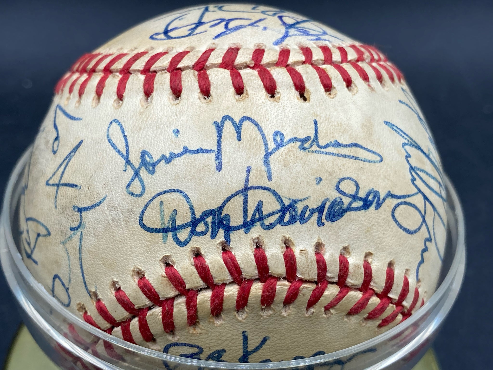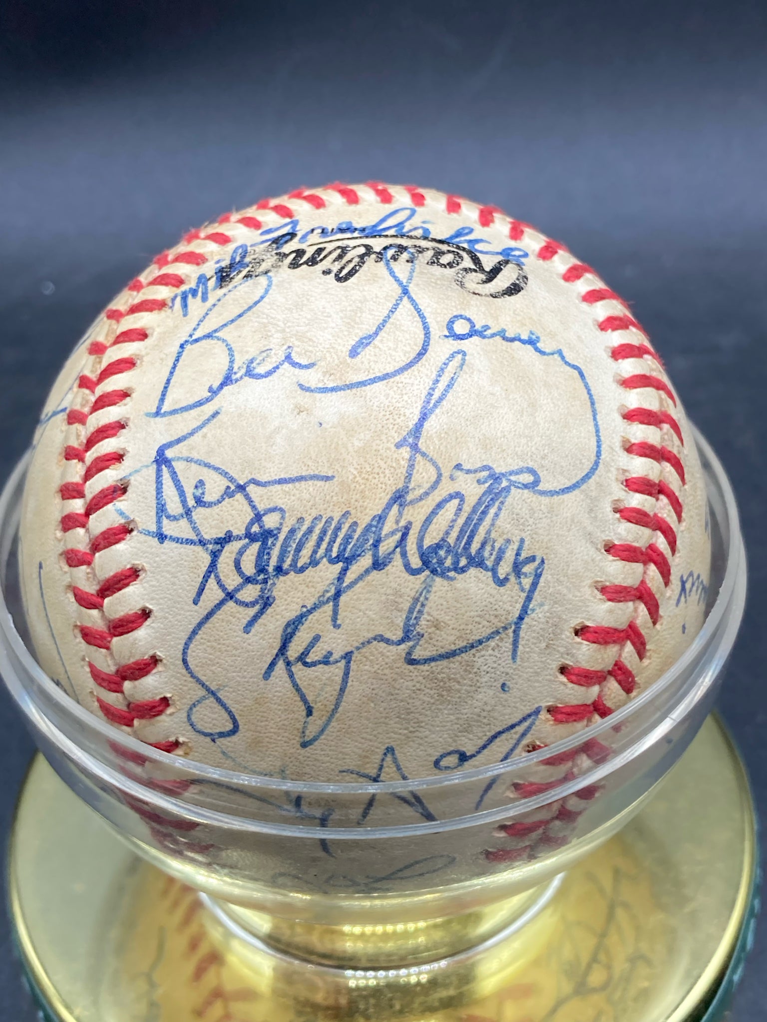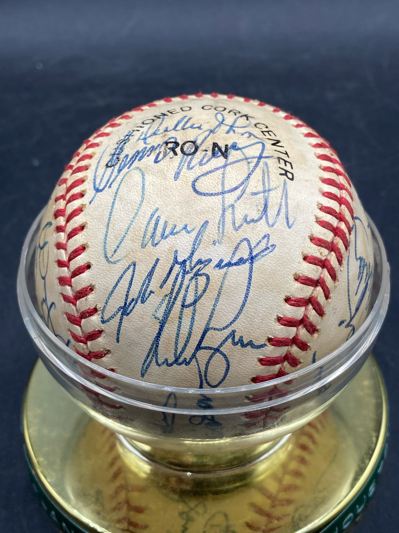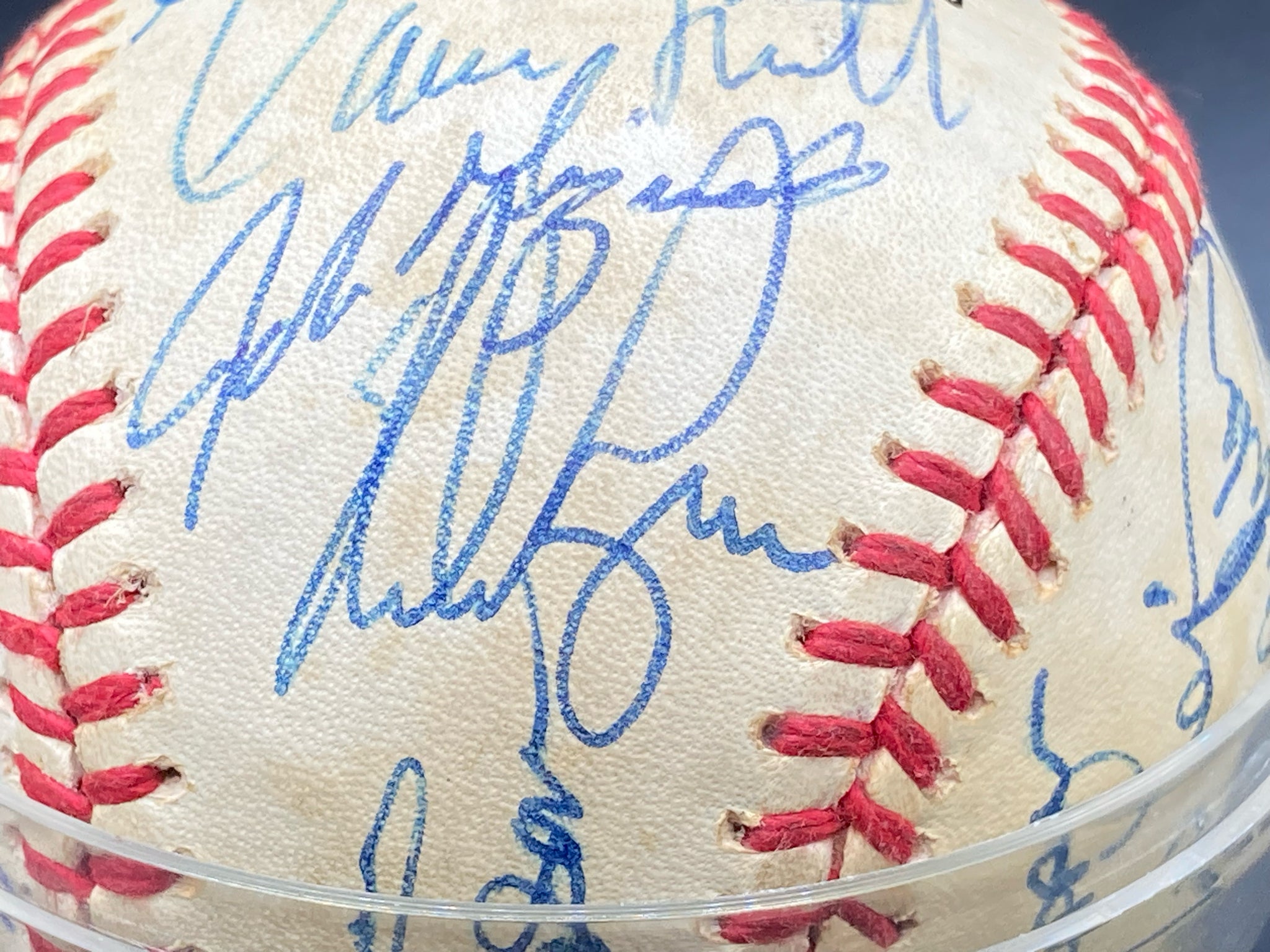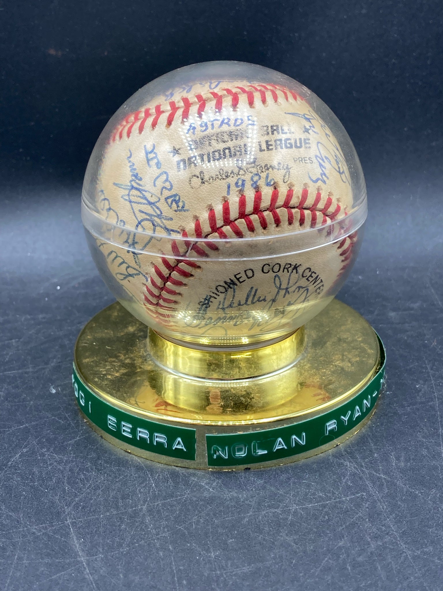 1986 Houston Astros team signed baseball. Ball features twenty eight signatures from the National League championship team including key signatures from Nolan Ryan, Yogi Berra, Billy Hatcher and others. Signatures are in good, legible condition though a few have some light smudging. Ball is in good condition showing only light wear and is display worthy.