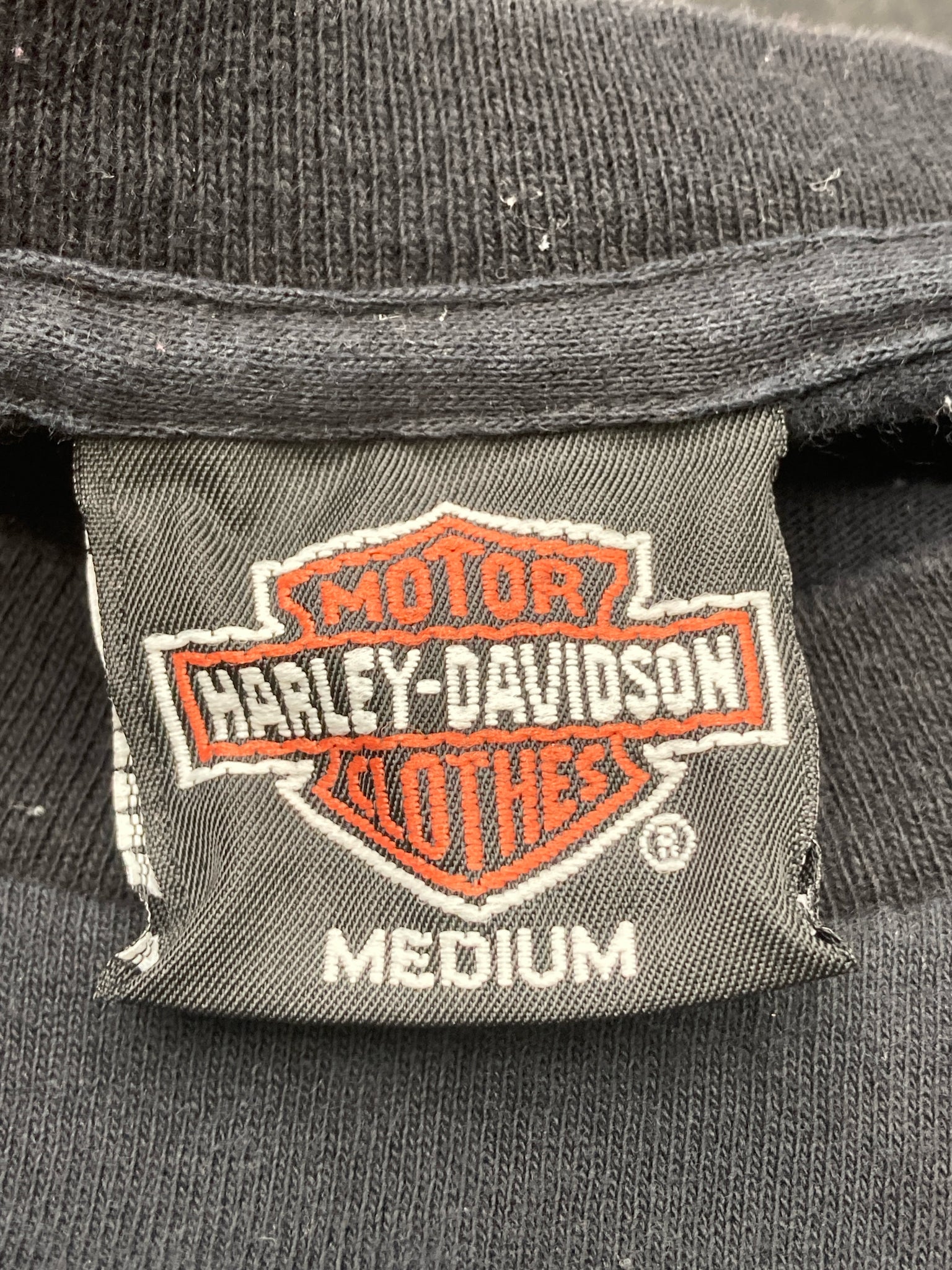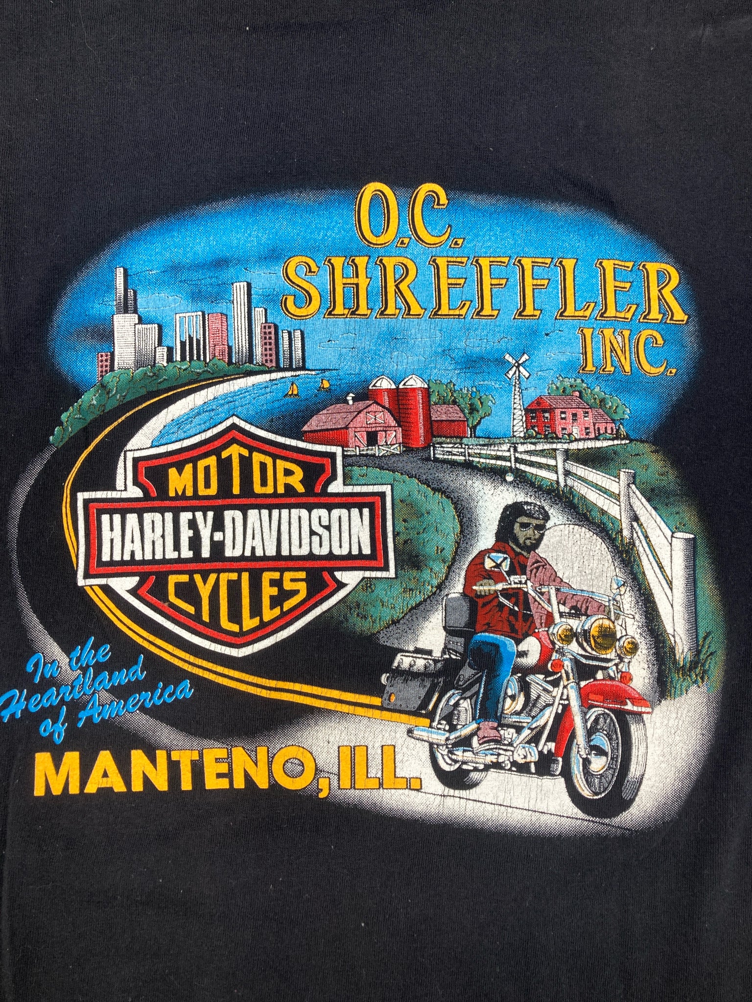 Vintage 1989 Holoubek single stitch O.C. Shreffler Harley-Davidson of Manteno, Illinois "Unleash the legend" eagle shirt. 100% cotton. Black color with front and back graphics and single stitch construction. Medium size. Shirt is in good condition.