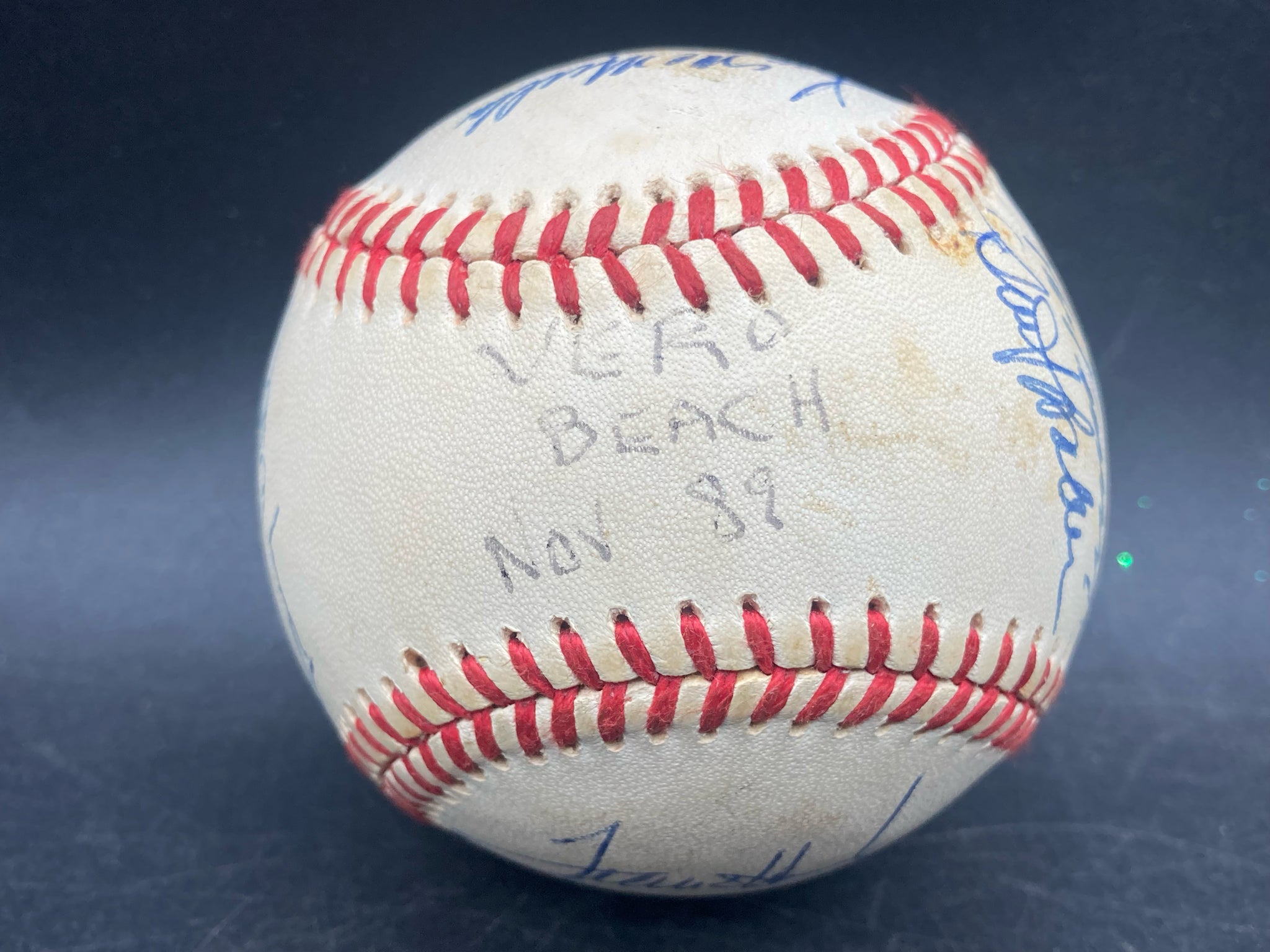 1989 Los Angeles Dodgers fantasy camp signed baseball. Baseball features signatures from Dodgers legends and hall of famers and was signed in November 1989 in Vero Beach, Florida during the Dodgers fantasy camp event. Ball features fourteen total signatures; Ken McMullen, Ron Cey, Frank Howard, Wes Parker, Davy Lopes, Carl Erskine, Preacher Roe, Bill Russell, Dusty Baker, Ralph Branca, Ron Perranoski, Sandy Amoros, Clem Labine and Don Williams. Ball is in very good condition with only very slight yellowing and no scuff. Signatures are all clean and legible. Date and location are inscribed on the sweet spot. Ball is not authenticated.