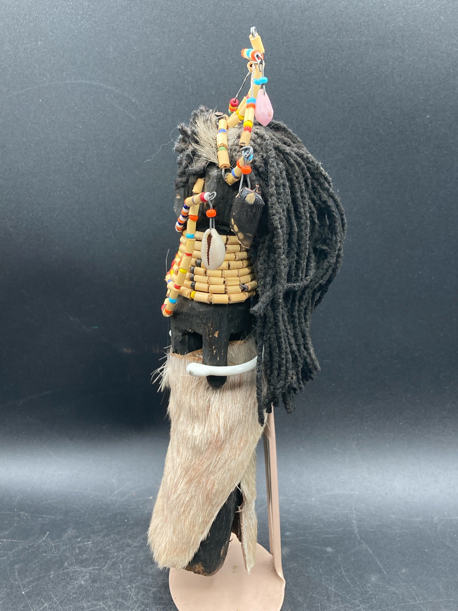 African beaded wood turkana fertility doll. Hand made wooden doll with natural goat hide skirt, beaded headress with shells, and yarn hair. Measures 9" tall. Two missing shells on headress, otherwise item is in good condition.