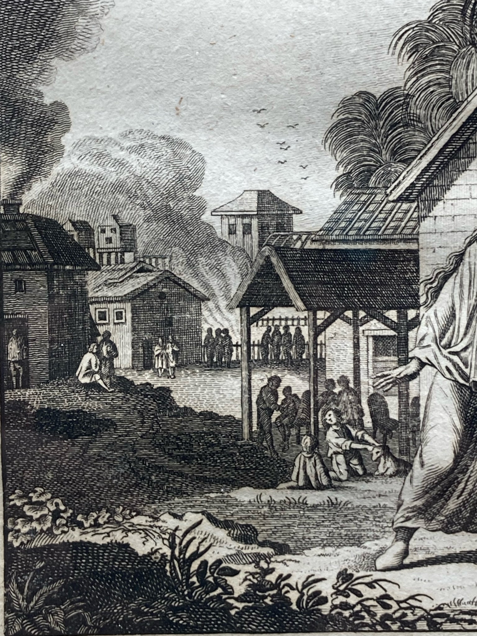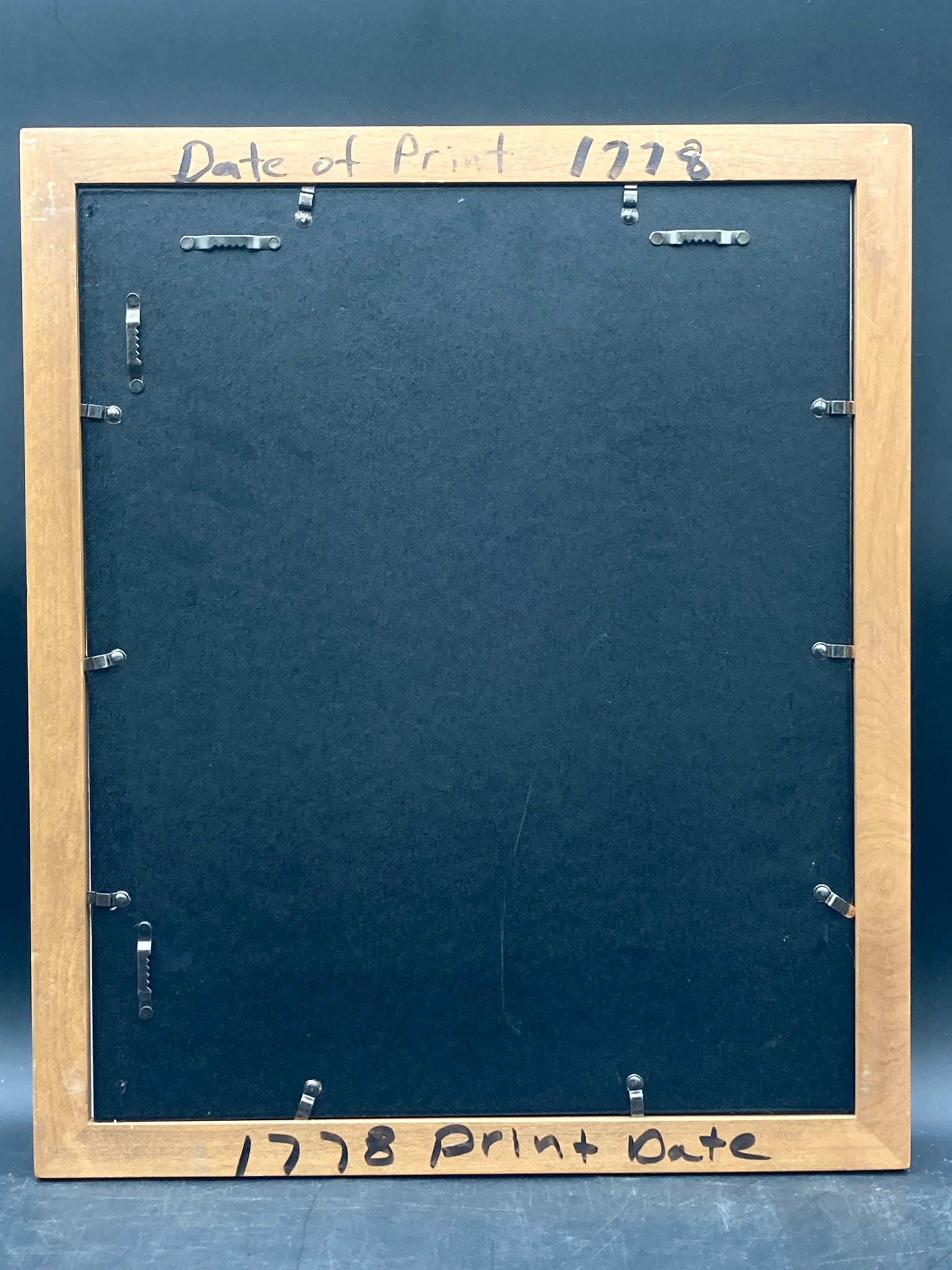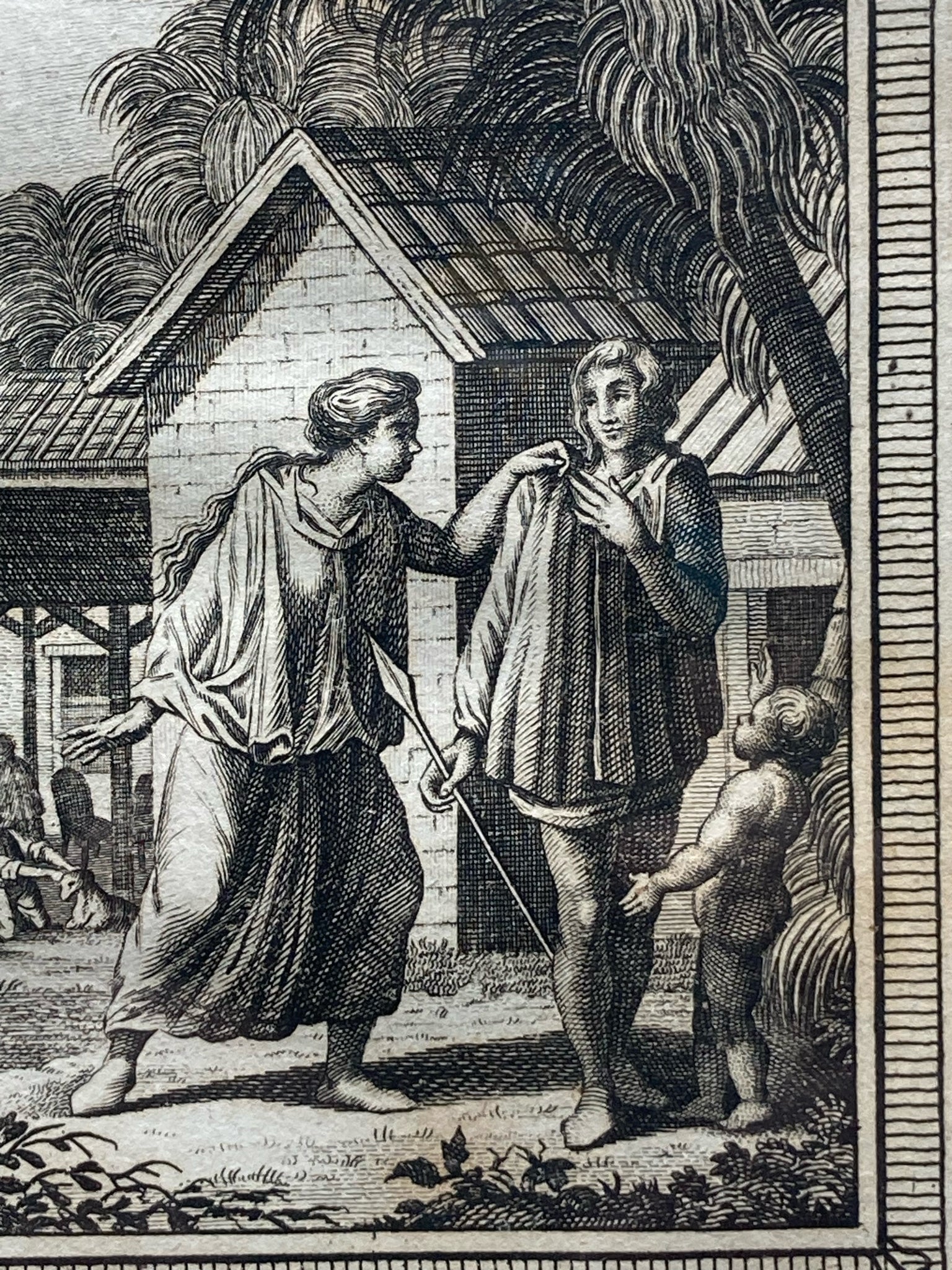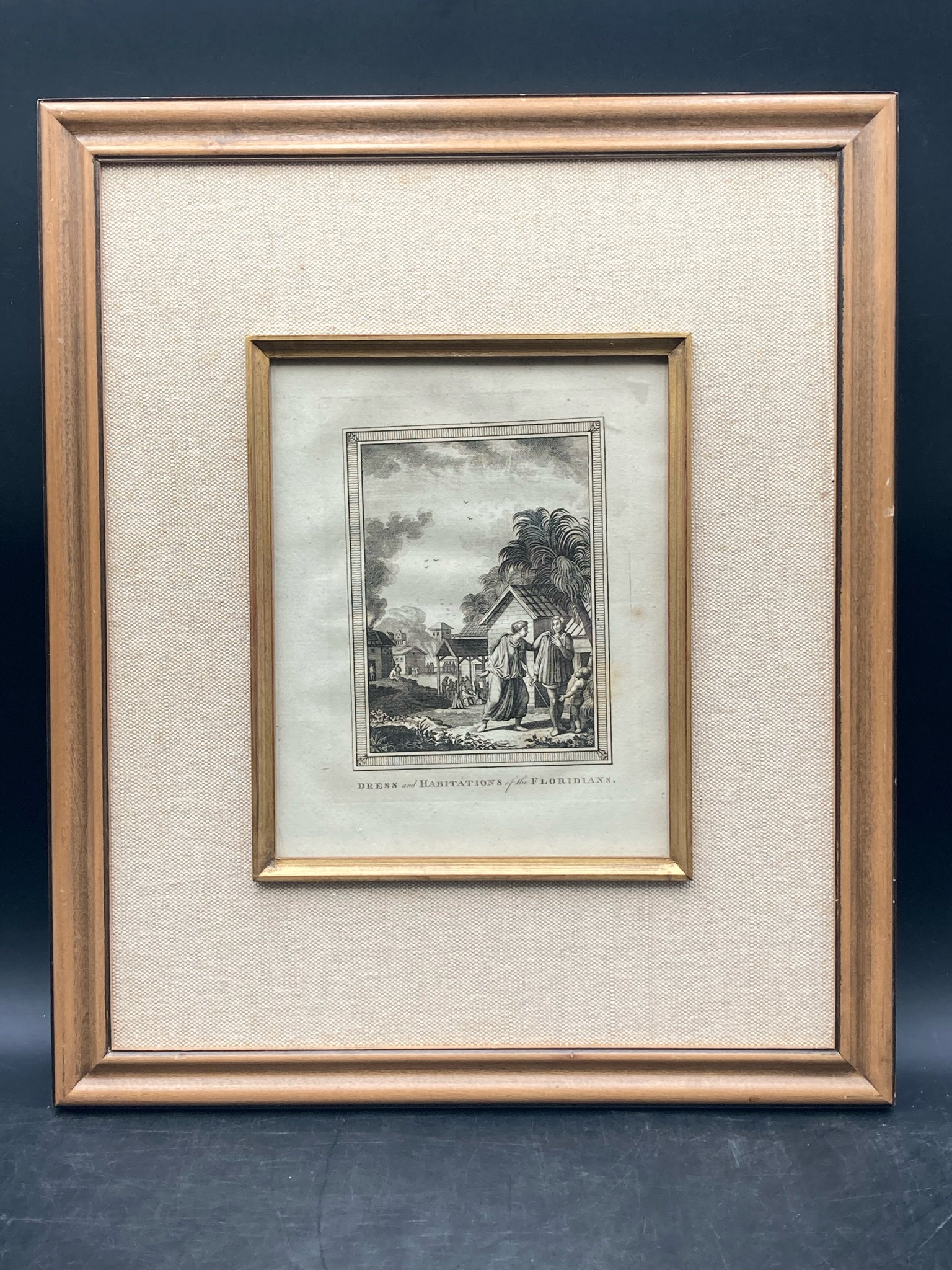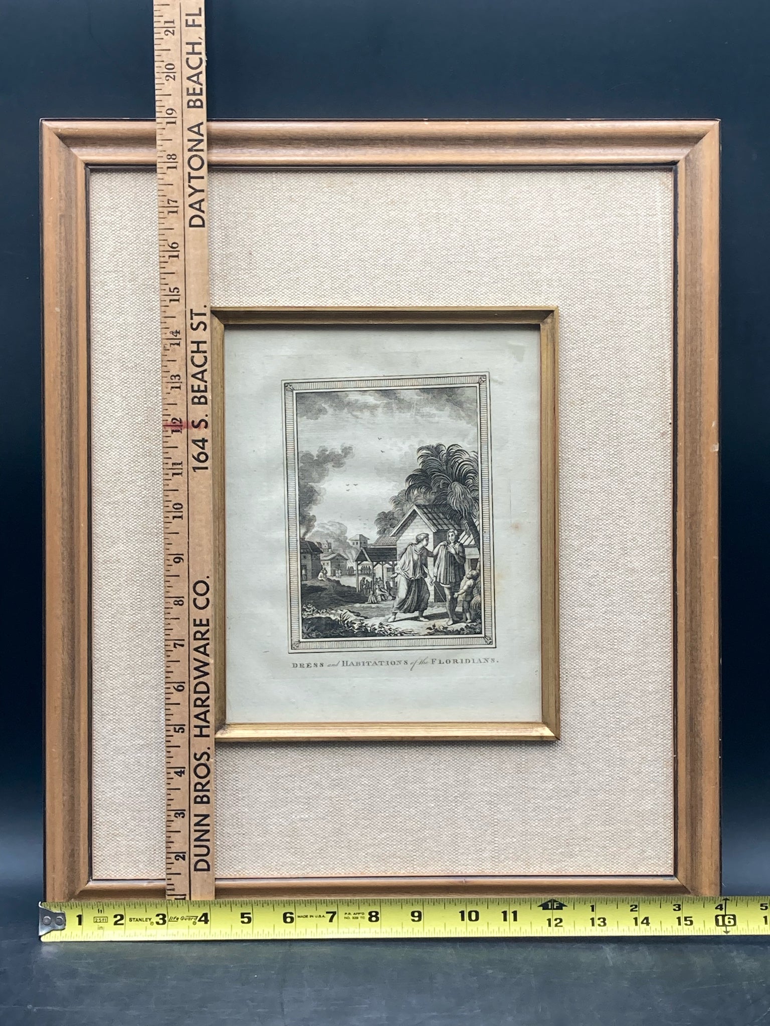 Antique 1778 "Dress and habitations of the floridians" engraving print, framed and matted. Antique depiction of old Florida showing natives and their dwellings in a swampy landscape. Print measures 8" wide by 10" tall, total size with frame is 16" by 19". Print is slightly off center in frame, otherwise it is in good condition.
