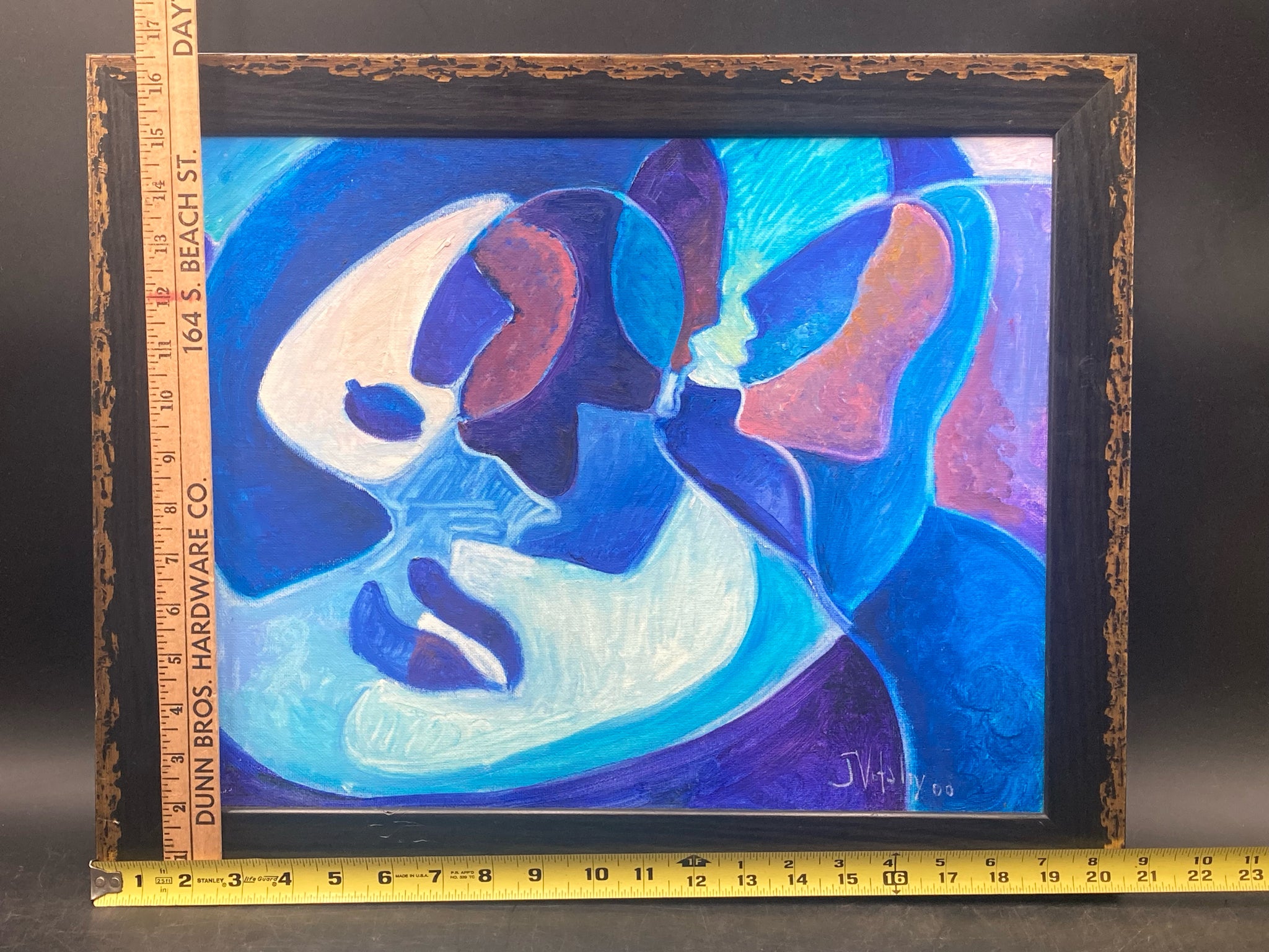 Original artist signed and dated contemporary abstract painting. Acrylic on canvas board. Abstract design with faces visible in the pattern work using blue and violet color tones. Painting is signed and dated in the lower left corner by the artist, dated 2000. Name is difficult to discern. Painting measures 13" tall by 17" long and is given a black and gold colored wood frame. Total size with frame is 17" by 21". Painting is in good condition, frame has some light scuffs.