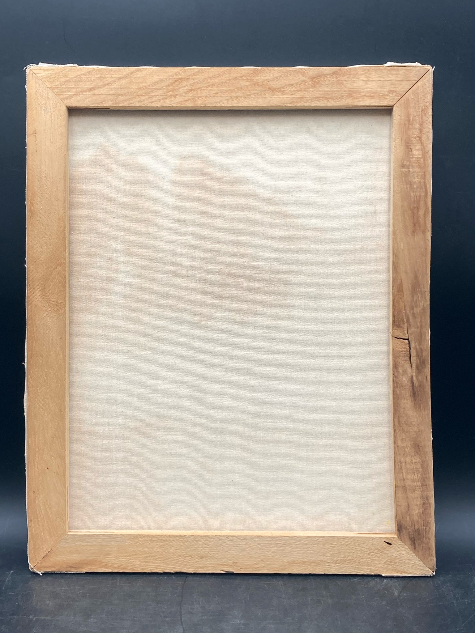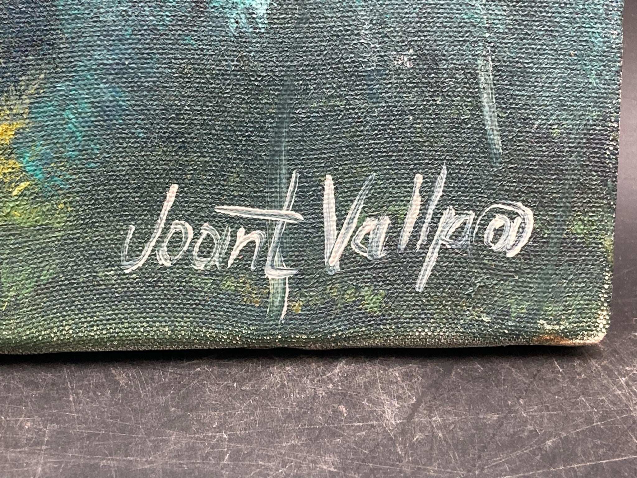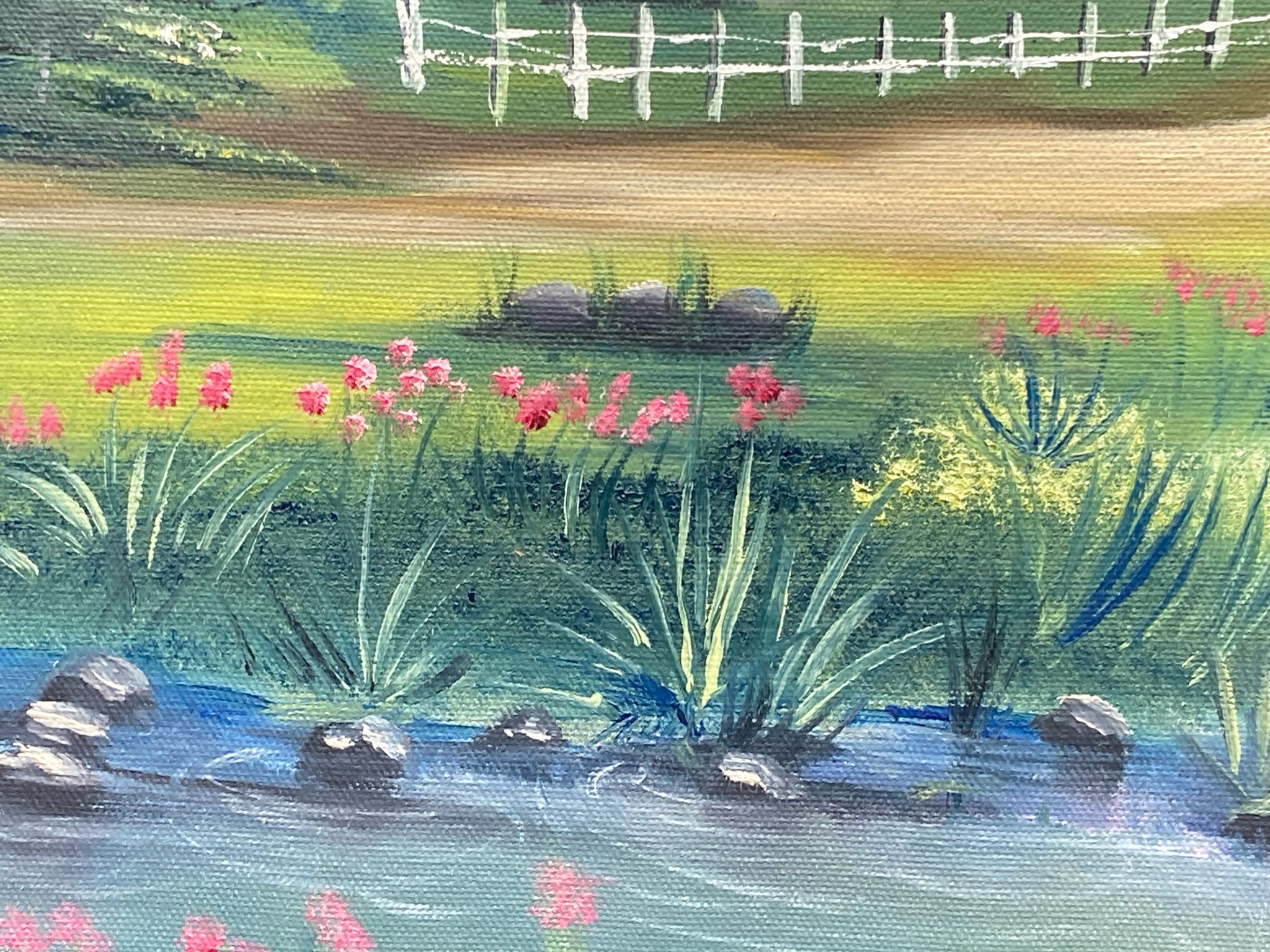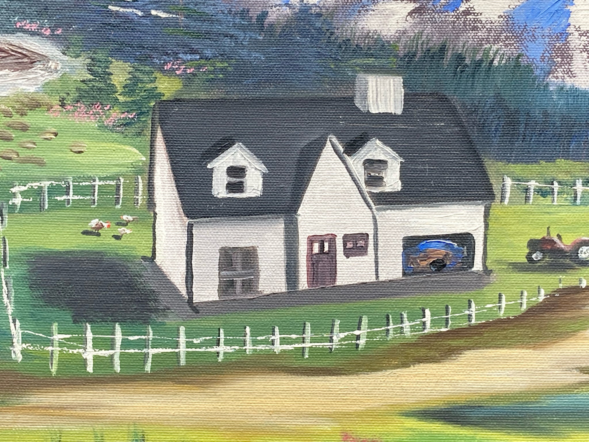 Artist signed country mountain landscape painting. Acrylic on canvas. Beautiful country scene with a cabin and farmland, lush plants, a mountain in the background and a violet toned sunset sky. Painting is signed in the lower left corner by the artist. Painting measures 16" wide by 20" tall and is unframed. Painting is in good condition.
