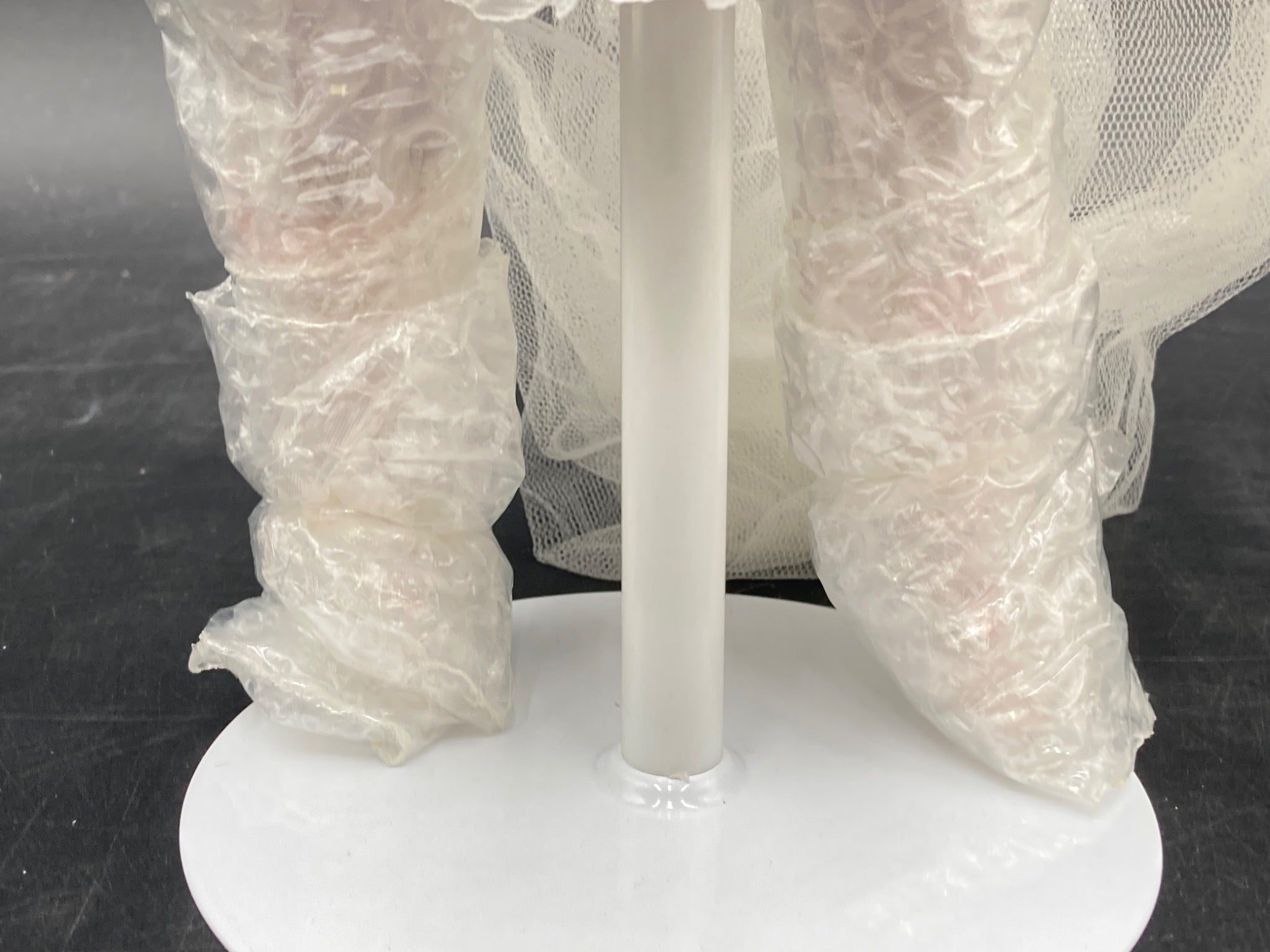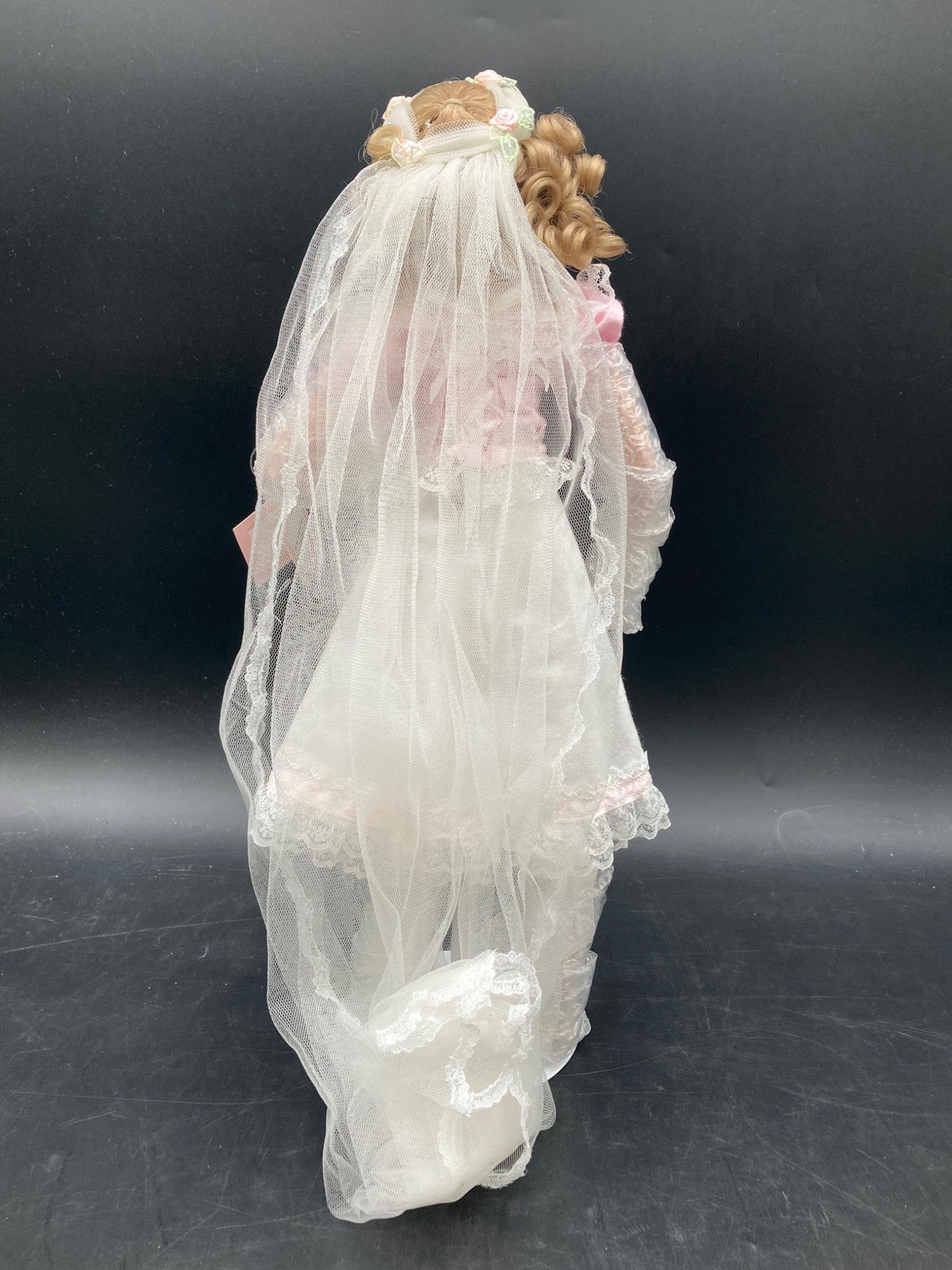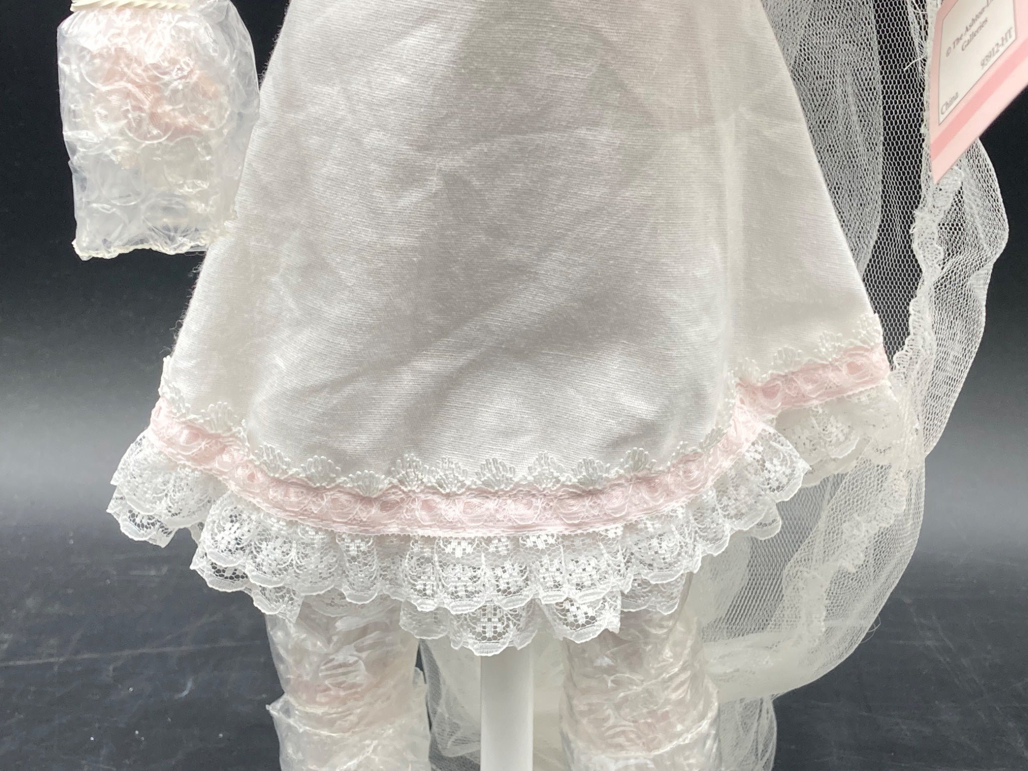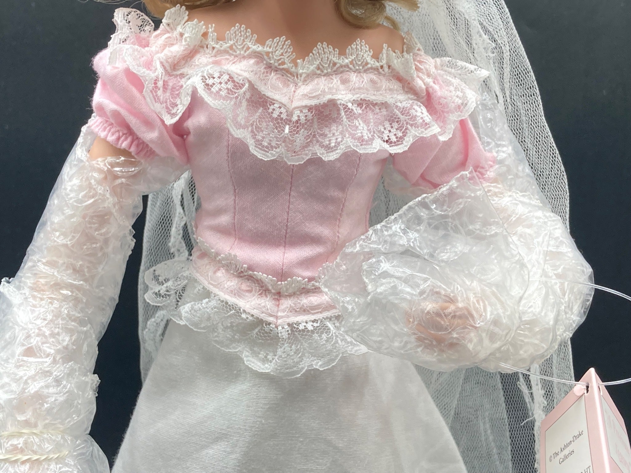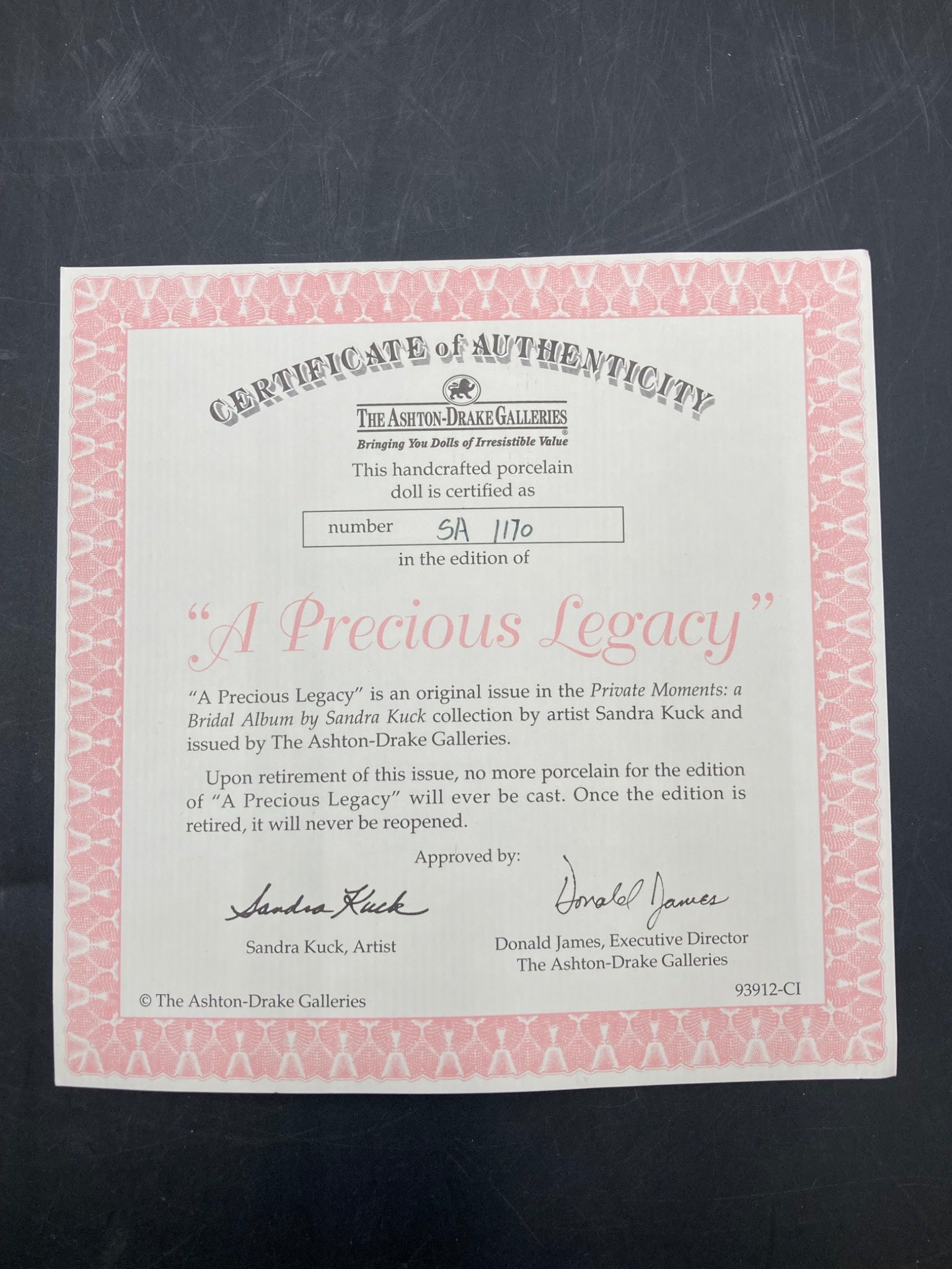 Ashton-Drake Galleries "A precious legacy" doll, new in box with extra outfit and certificate of authenticity. Hand made doll features porcelain head, legs and arms with hand crafted outfit and extra wedding gown outfit. Doll measures 17" tall and comes with doll stand. Doll is in like new condition, only removed from box for display photos.