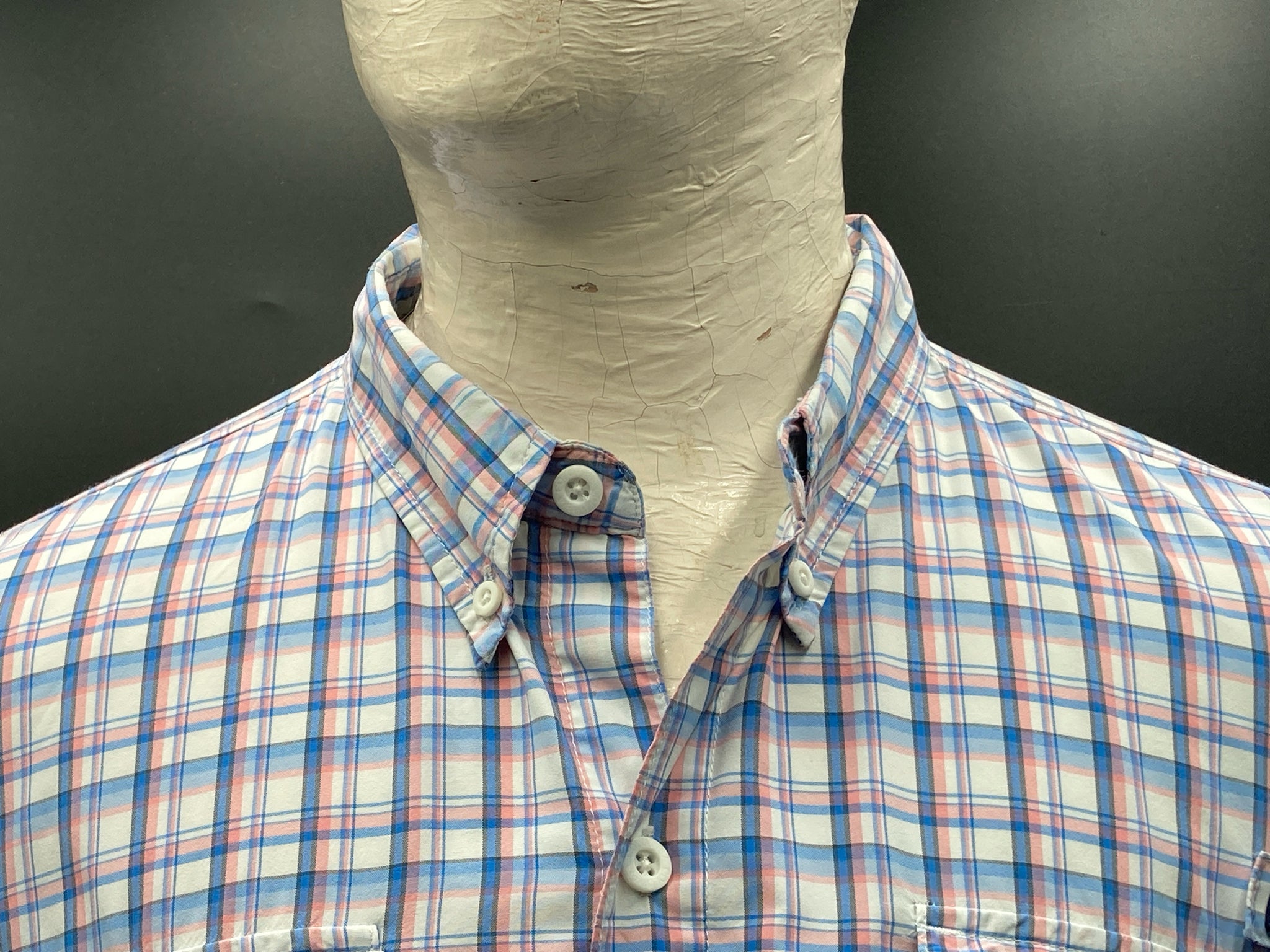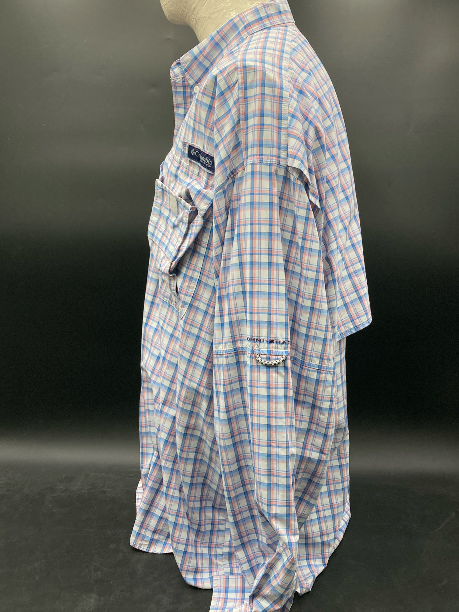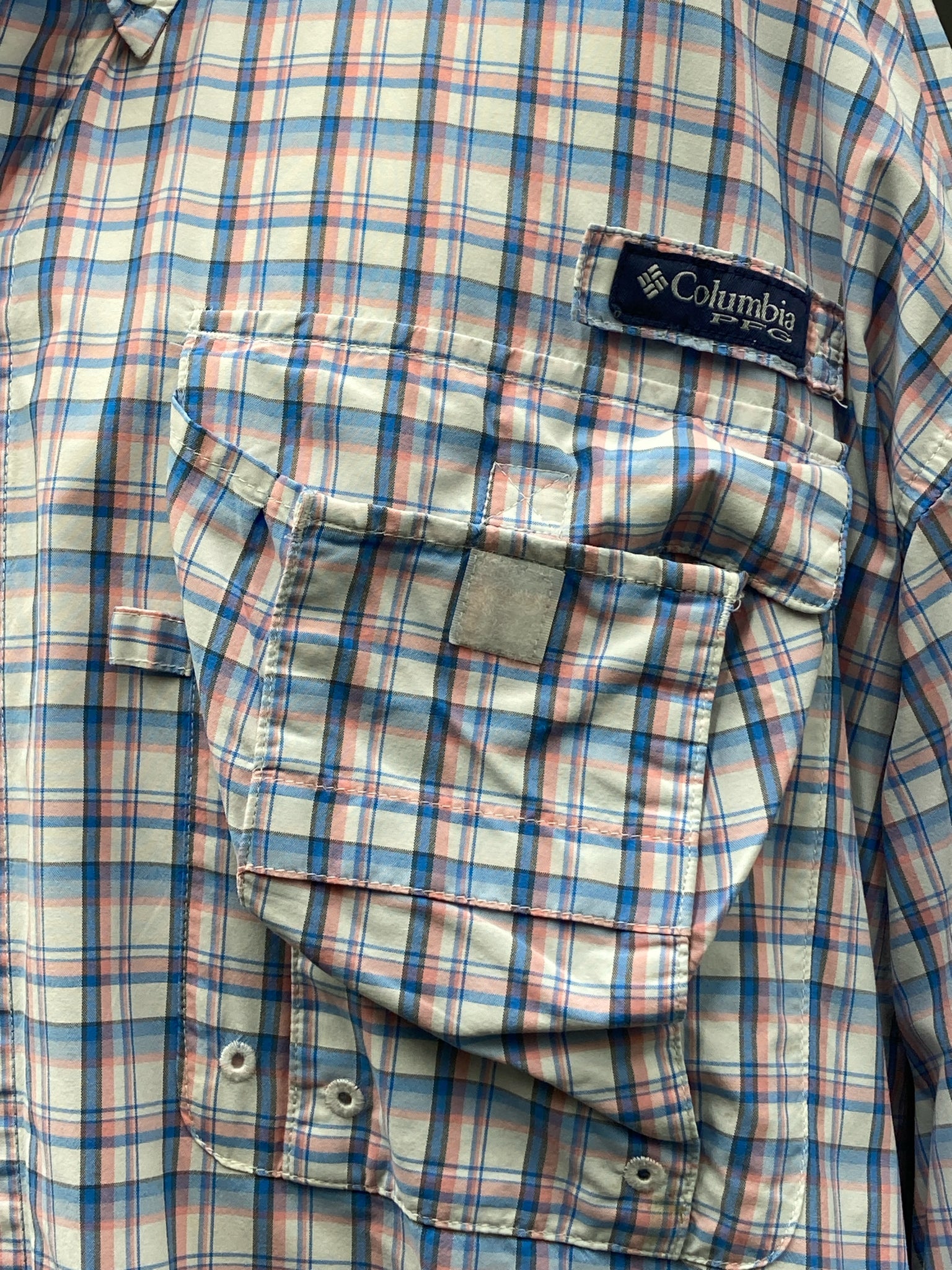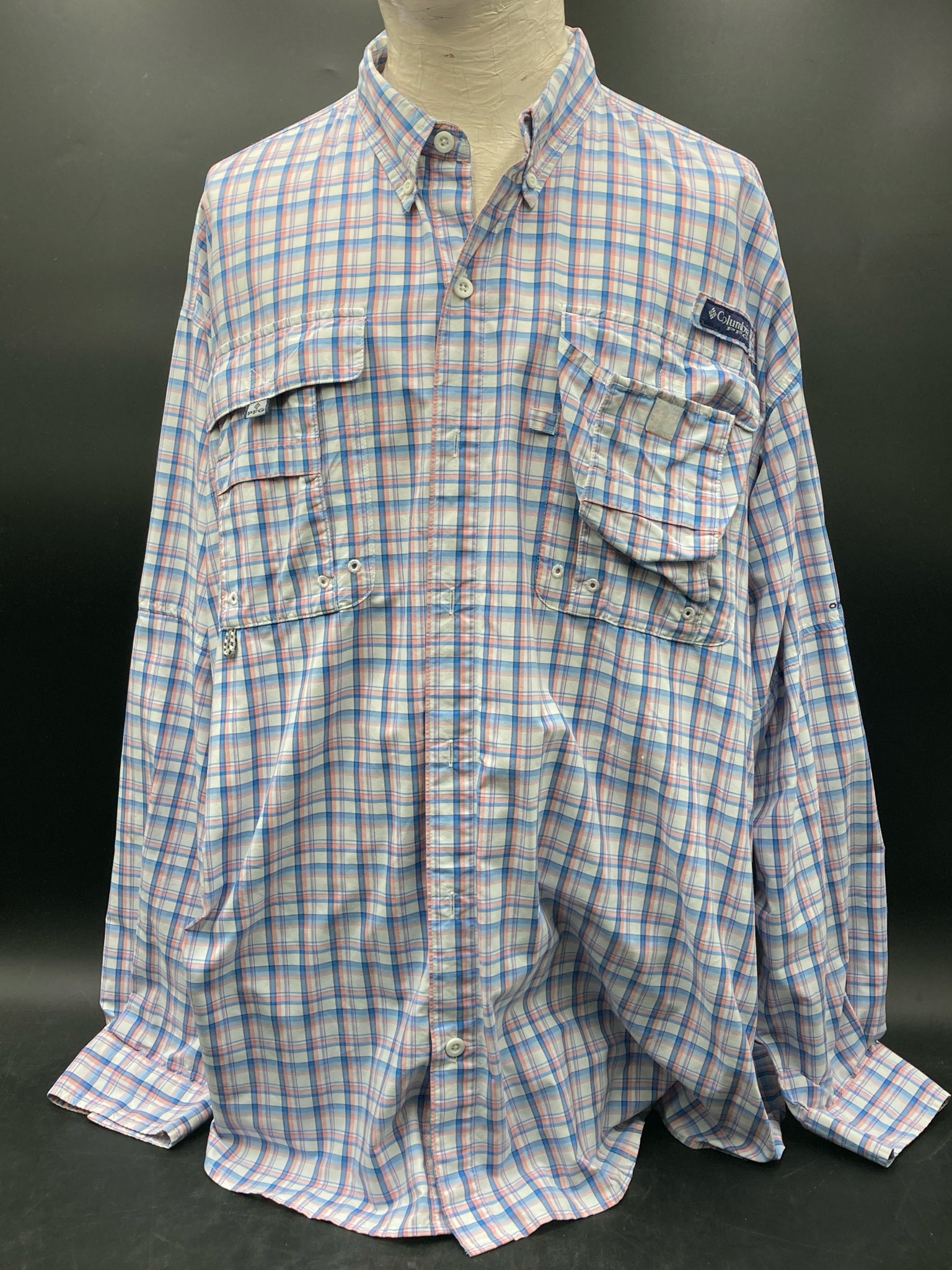 Columber super Bahama men's fishing shirt. Long sleeve button up collard shirt with multiple pockets and venting. Pink and blue plaid color. Extra large size. Shirt is in excellent condition.