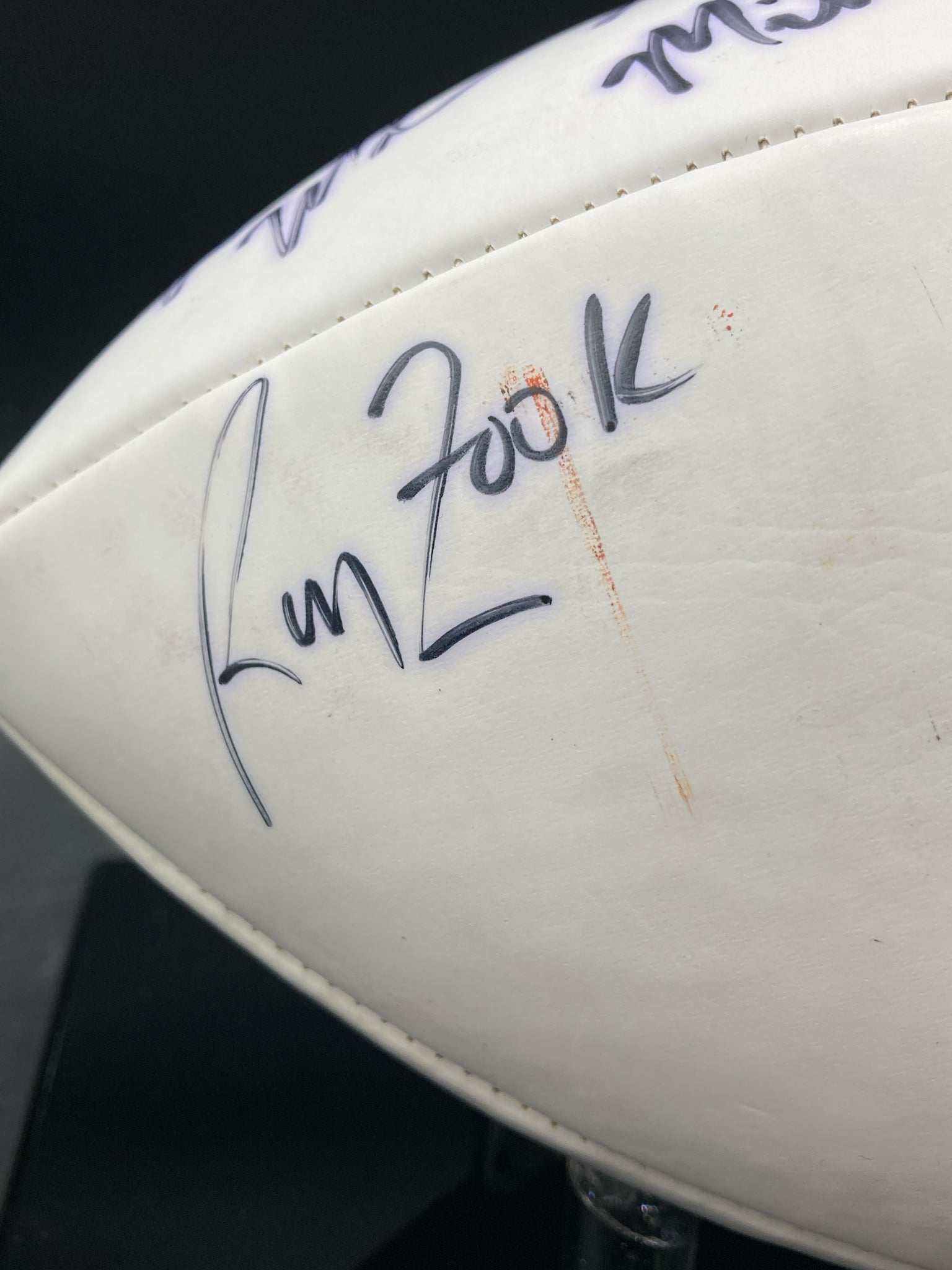 Daytona Beach quarterback club multisigned Wilson autograph football. Football features ten signatures including Mike Bianchi, Lee Corso, Ron Zook and Steve Shaw. Ball has some minor marks and one signature has a smudge, otherwise ball is in good condition. Display stand is not included, used for listing photo purposes.
