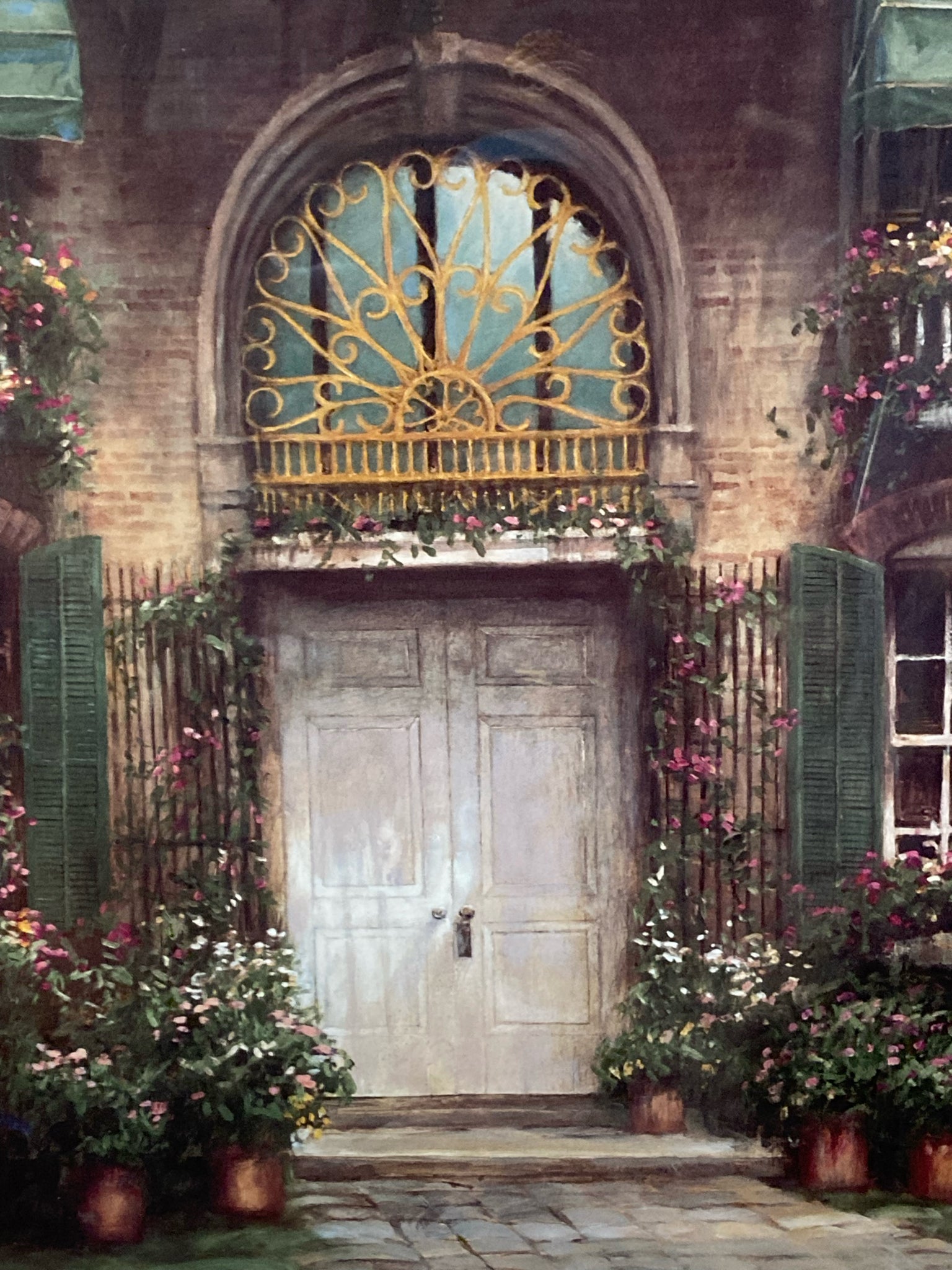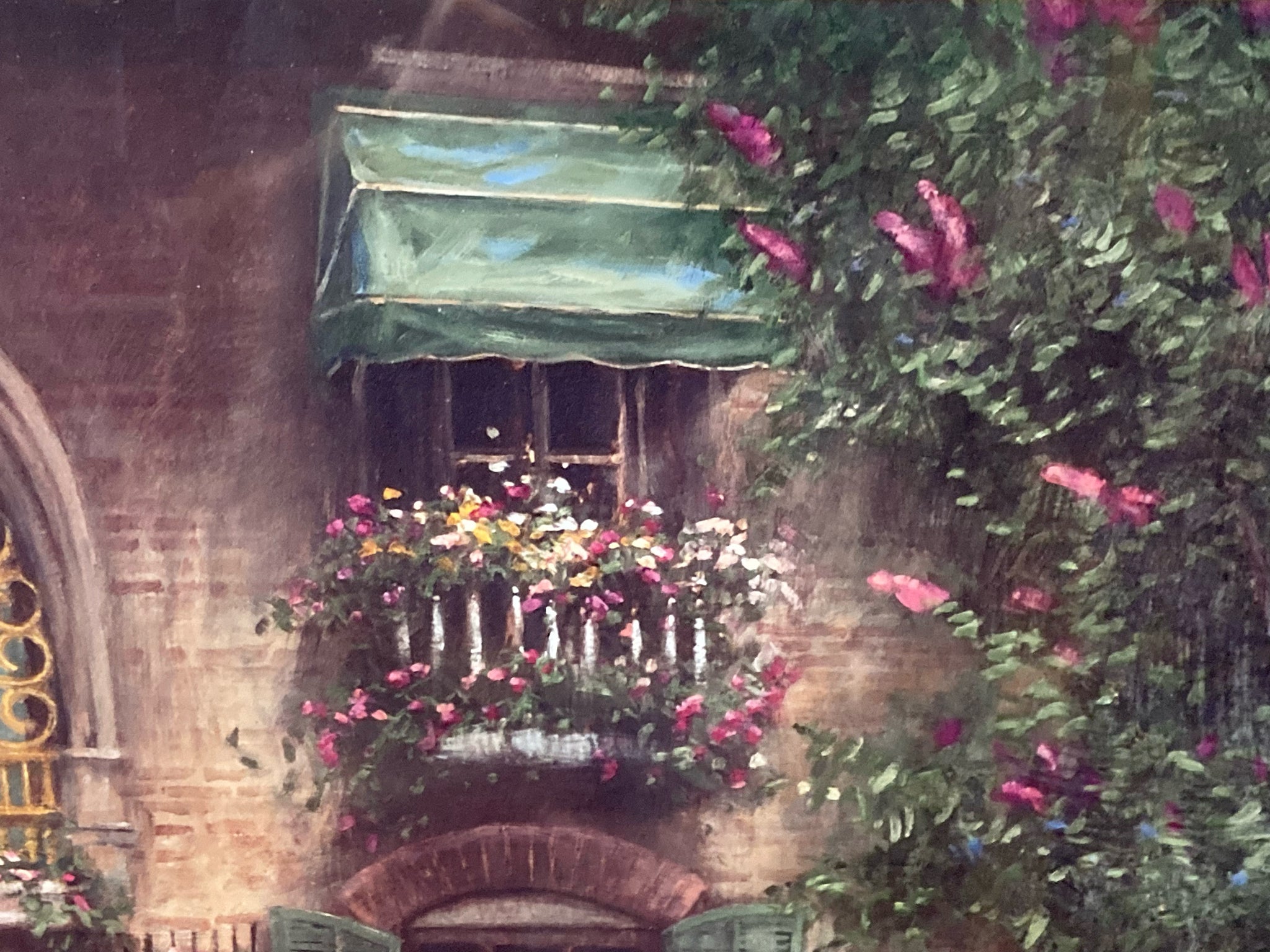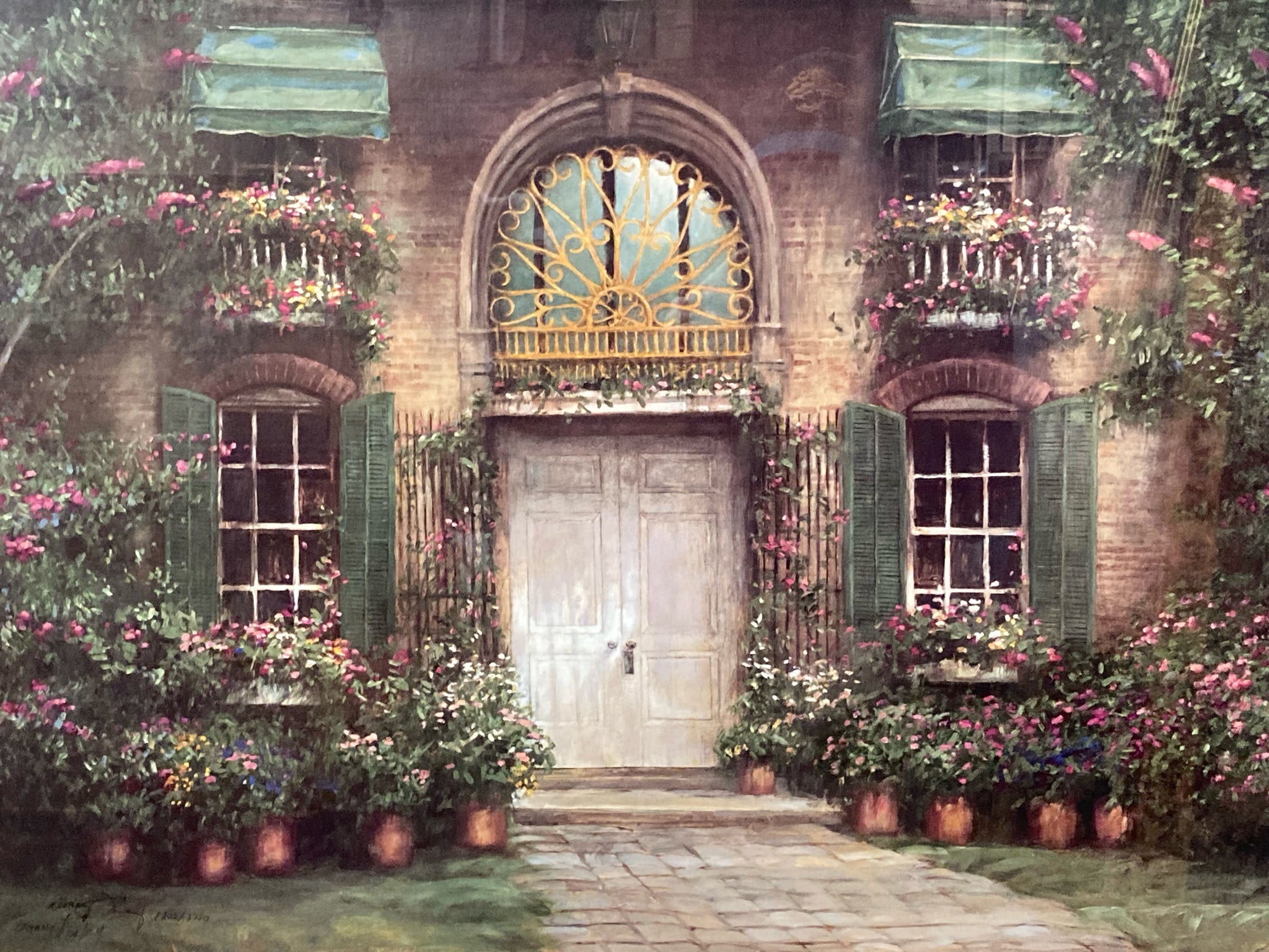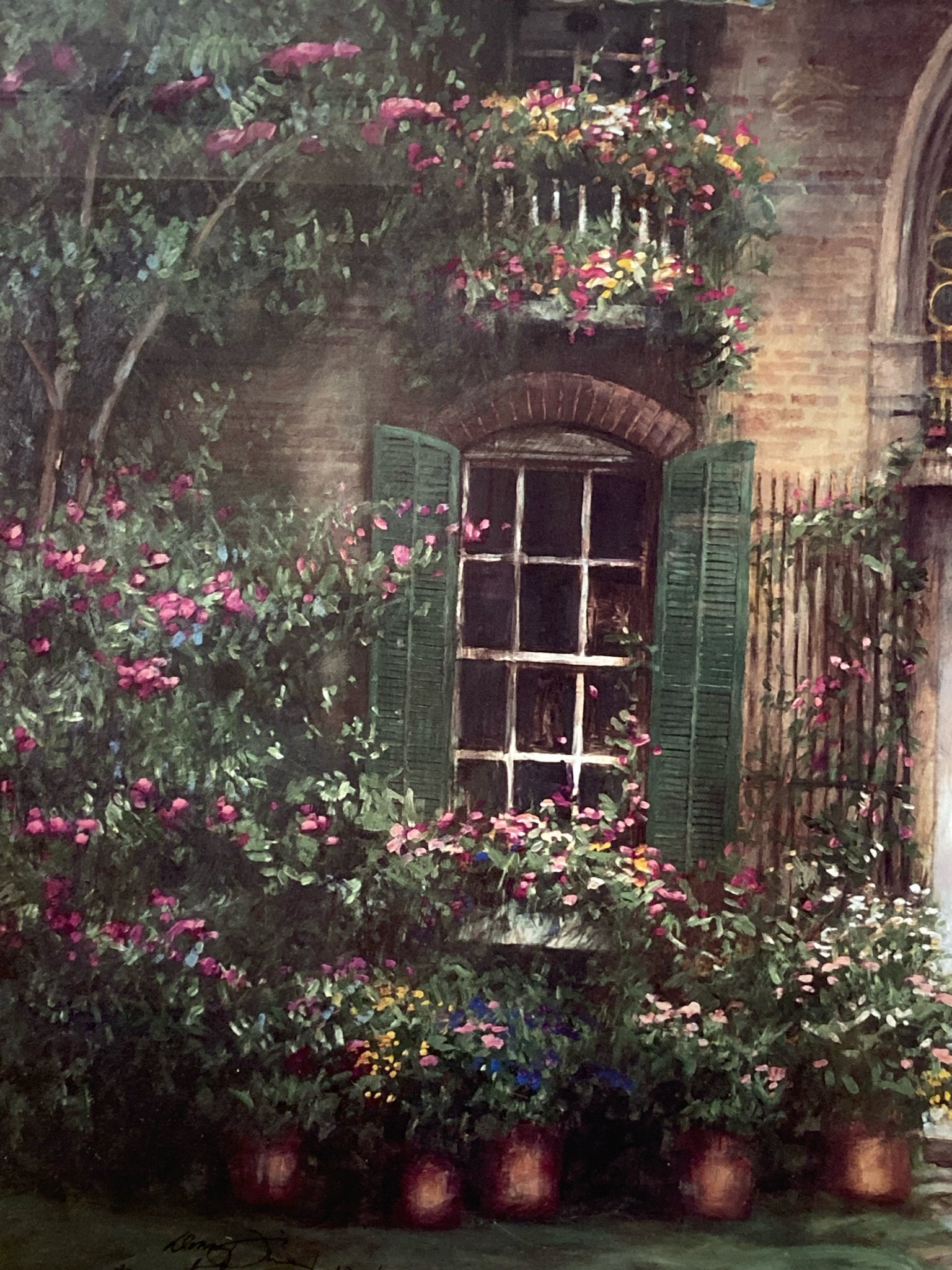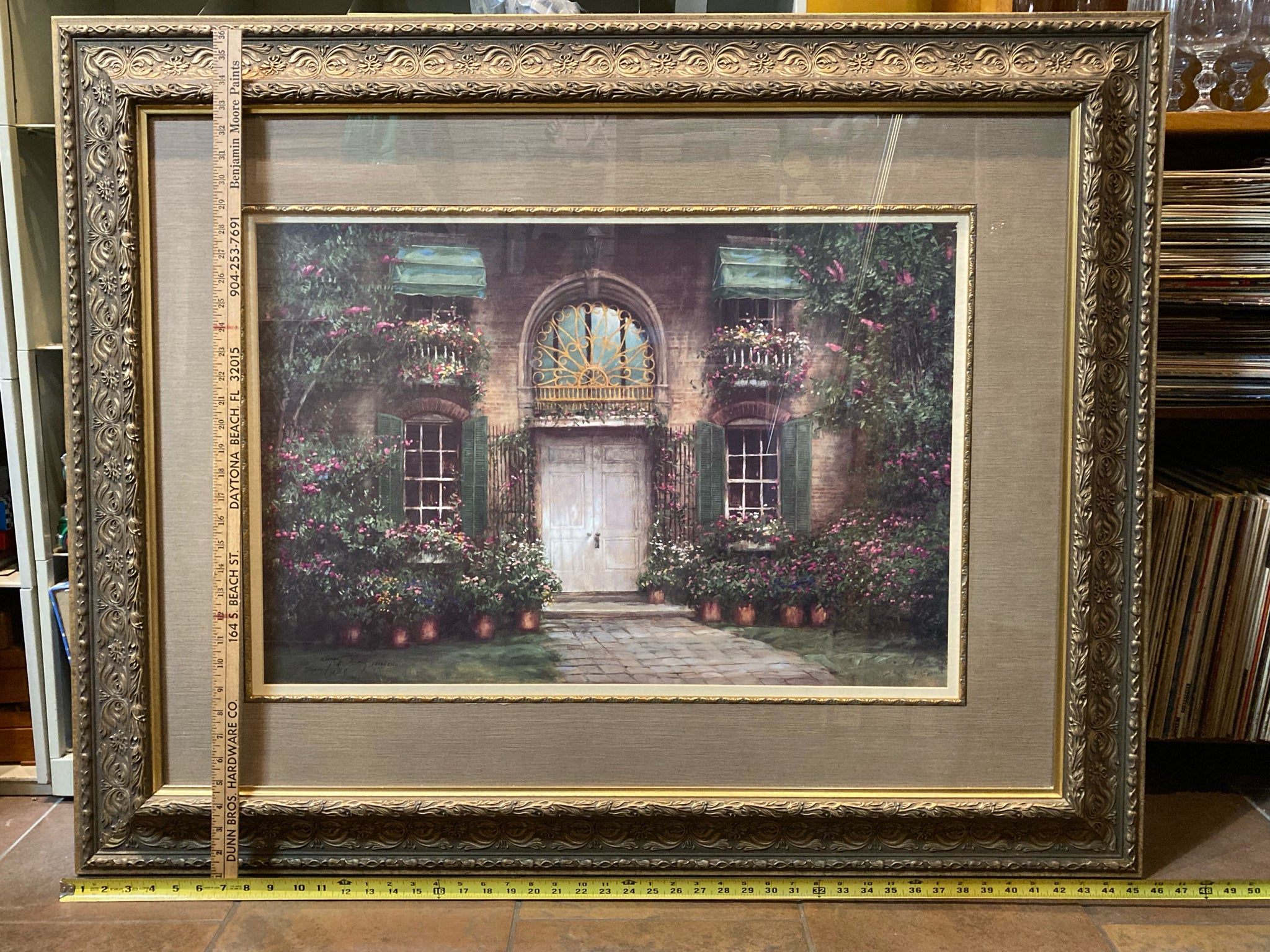 Donny Finley singed and number "Inner Light" print, framed and matted. Lithograph on paper. Floral garden courtyard scene with vibrant colored flowers and detailed architecture. Print is signed in the lower left corner by the artist Donny Finley and numbered, 1205/3750. Print measures 20" tall by 30" long and is given a large ornate wood frame with complimenting matting. Total size is 36" by 46" and weighs 20 pounds. Print is in excellent condition.