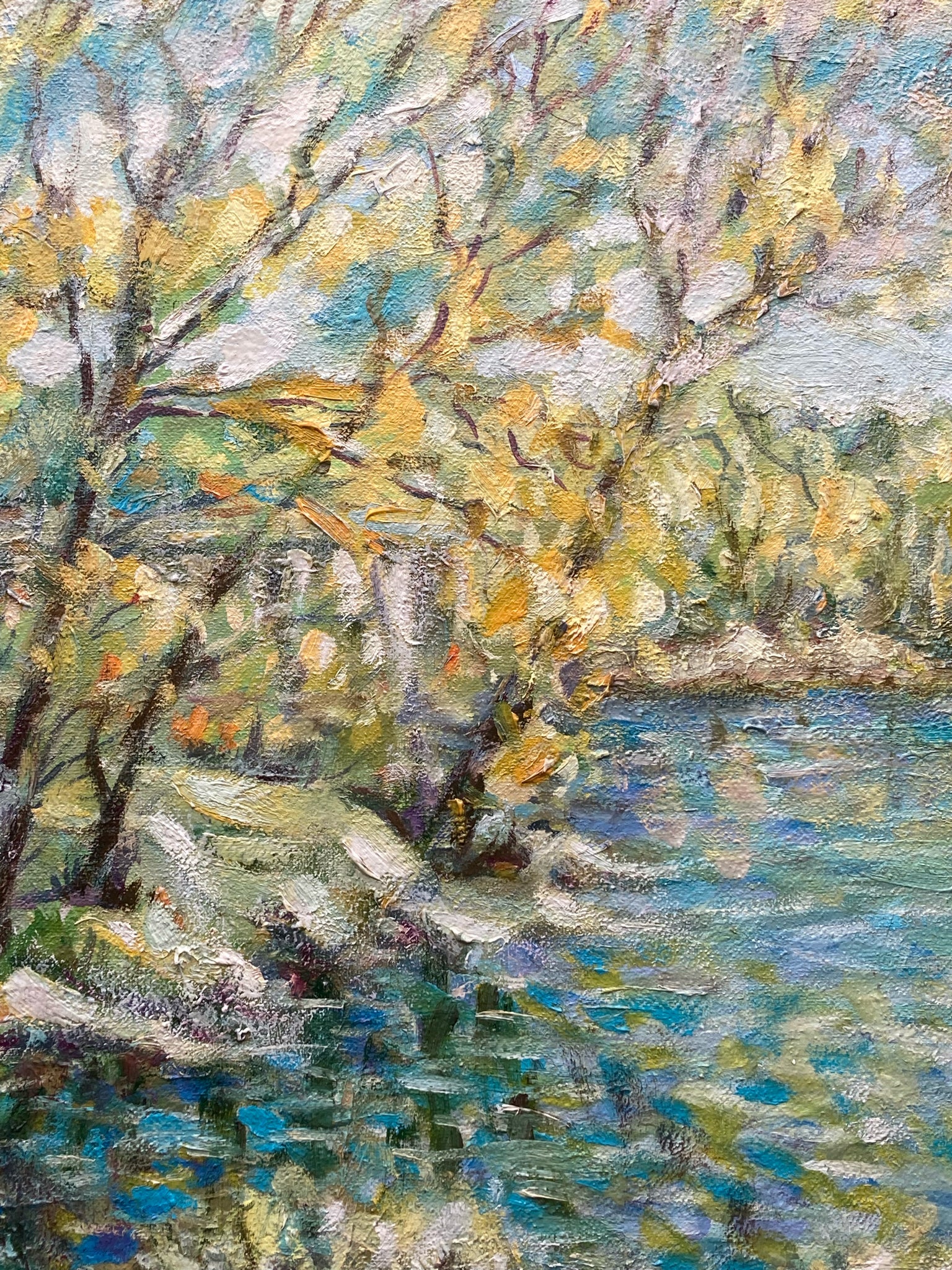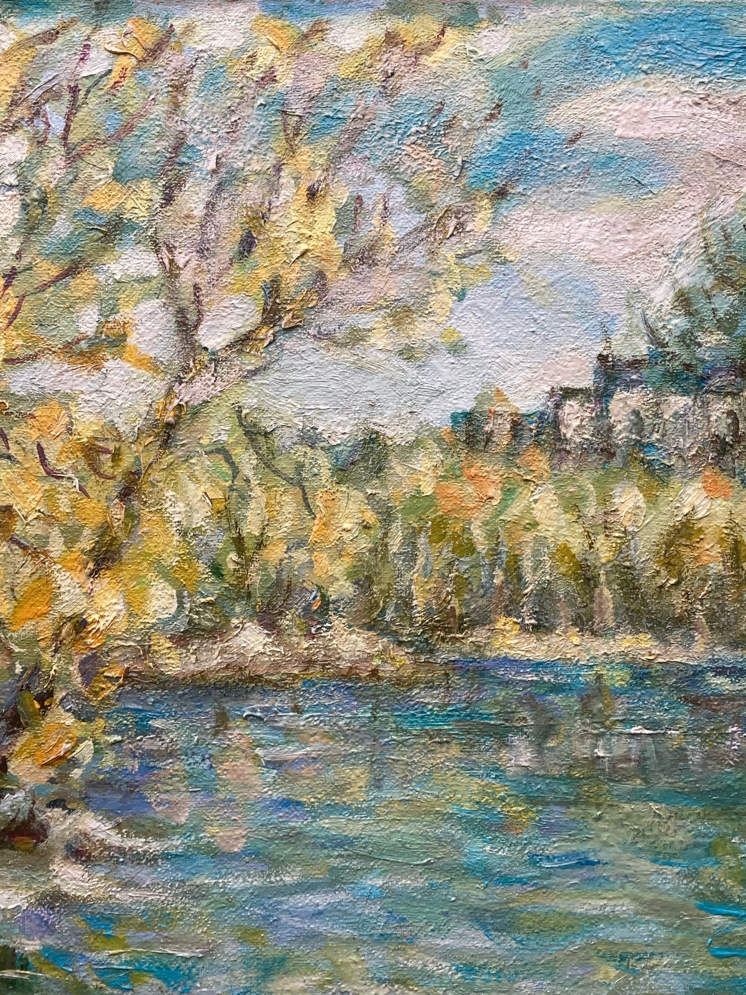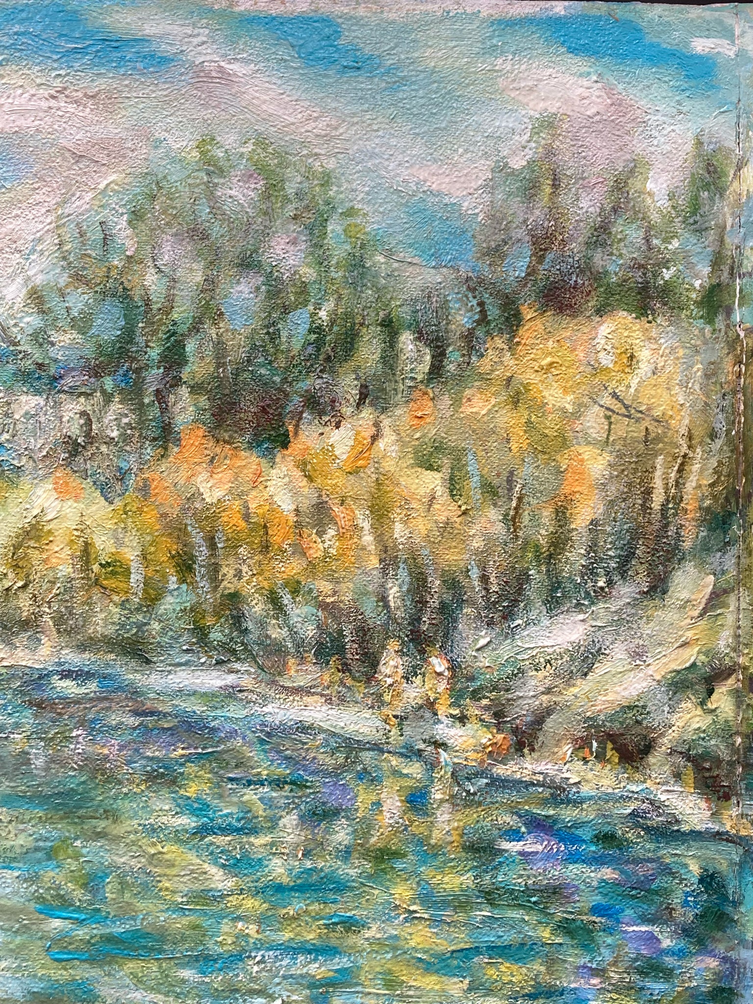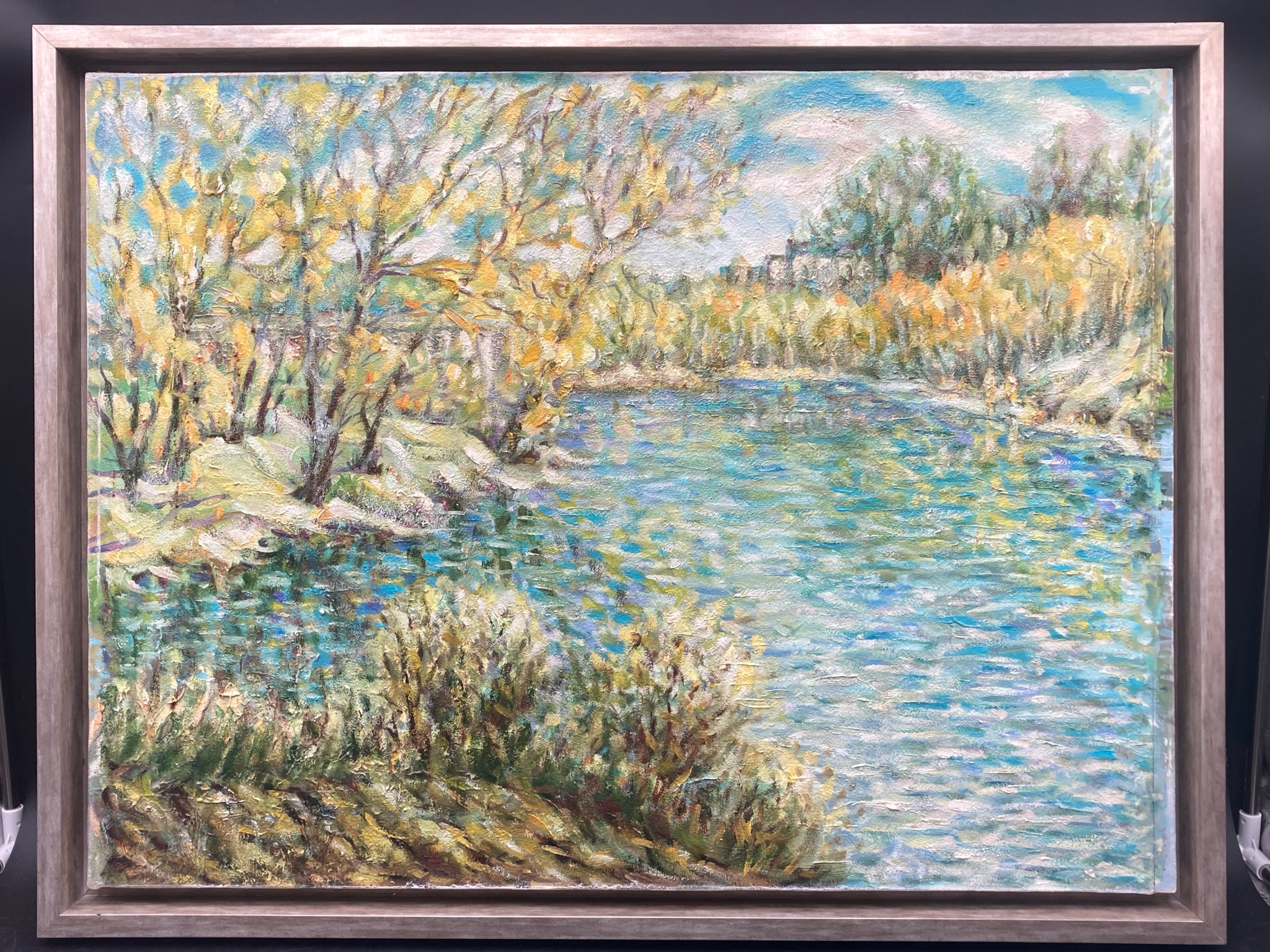 Framed original 23x30" Ivan Shapoval "On Psla, Landscape" painting. Oil on canvas. Expressionist spring time Ukrainian lake and forest scene. Artist information on backside of canvas, obscured by framing paper on back. One area of cracking of canvas on left side is noted in photos.