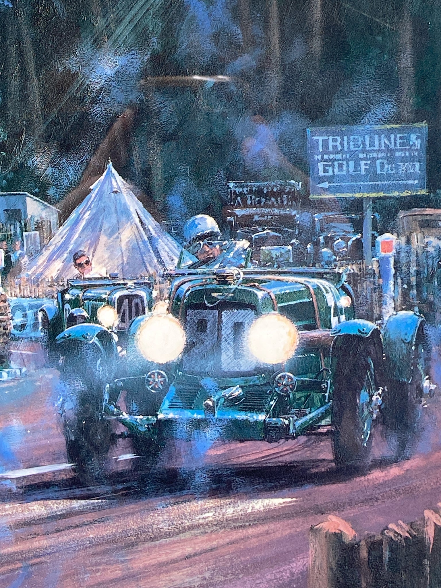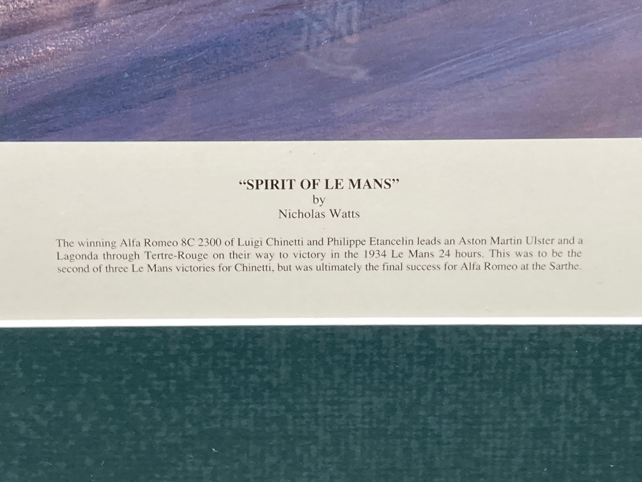 Framed Nicholas Watts "Spirit of Le Mans" print. Print based off of Watts original painting of the winning Alfa Romeo driven by Luigi Chinetti. Print measures 21x28", total size is 27x34". Crack in glass in upper left corner noted in photos, print is in good condition.