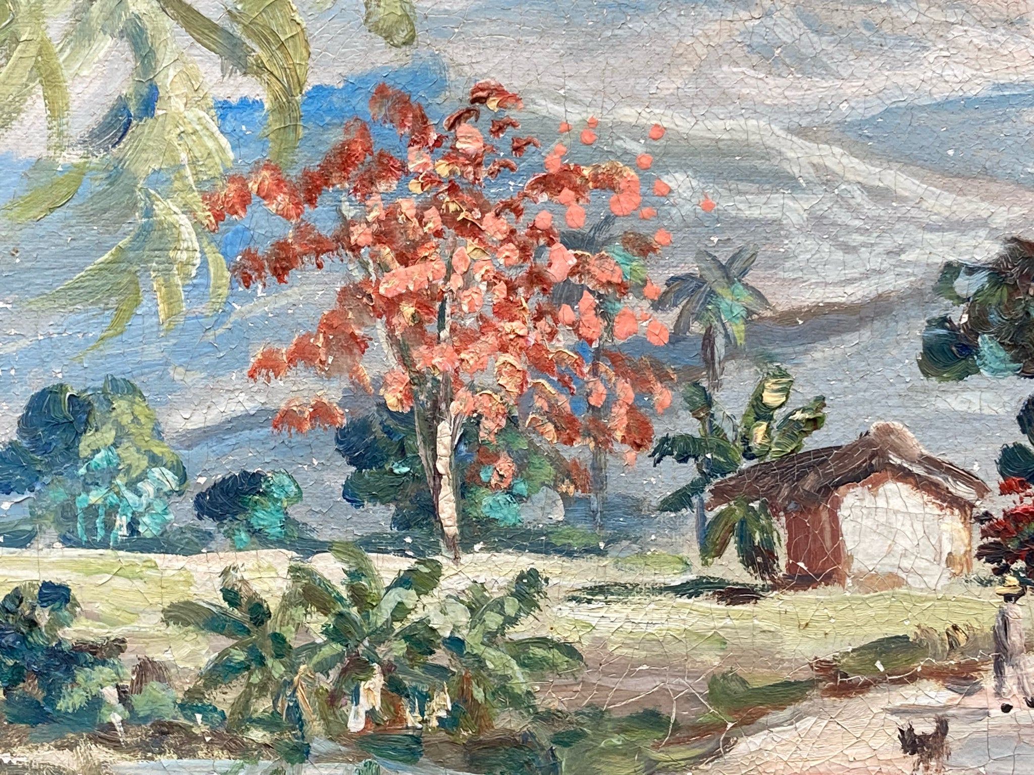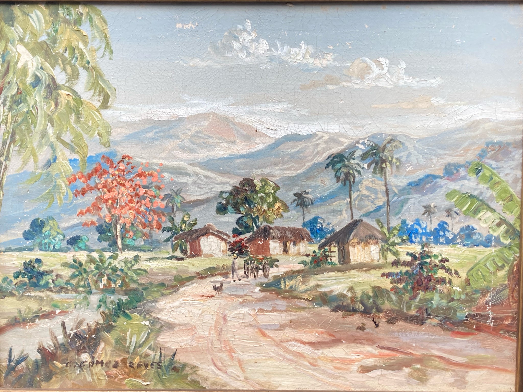 Vintage original G. Gomez Reyes signed painting. Acrylic on canvas. Detailed and vibrant Mexican village scene with people walking about, lush trees and mountains in the background. Painting is signed by the artist in the lower right corner. Painting measures 11" tall by 15" wide, total size with frame is 17" by 21". Painting has visible crackling and areas of chipped paint which is noted in photos, overall the painting is in good condition and still suitable for display.