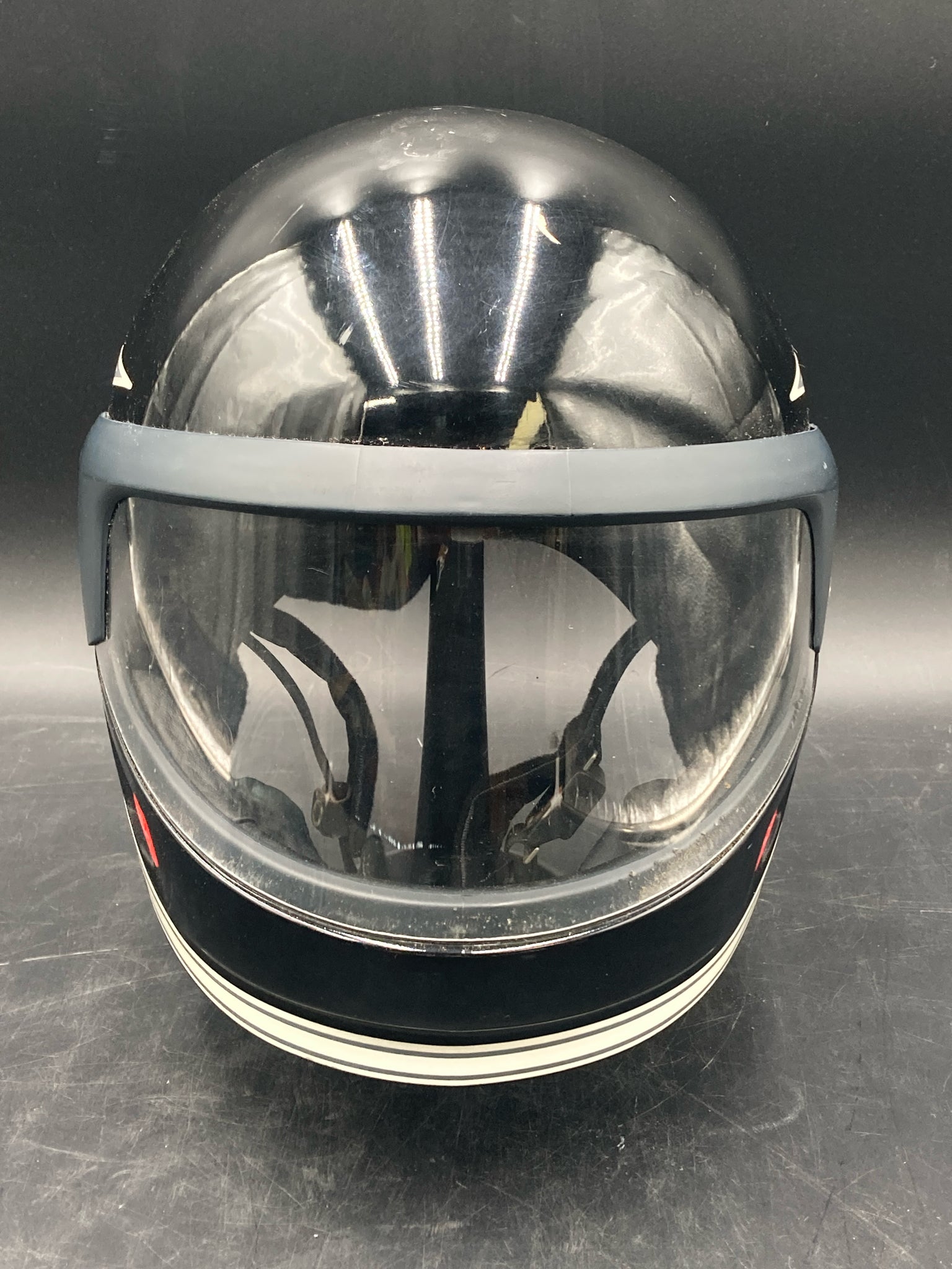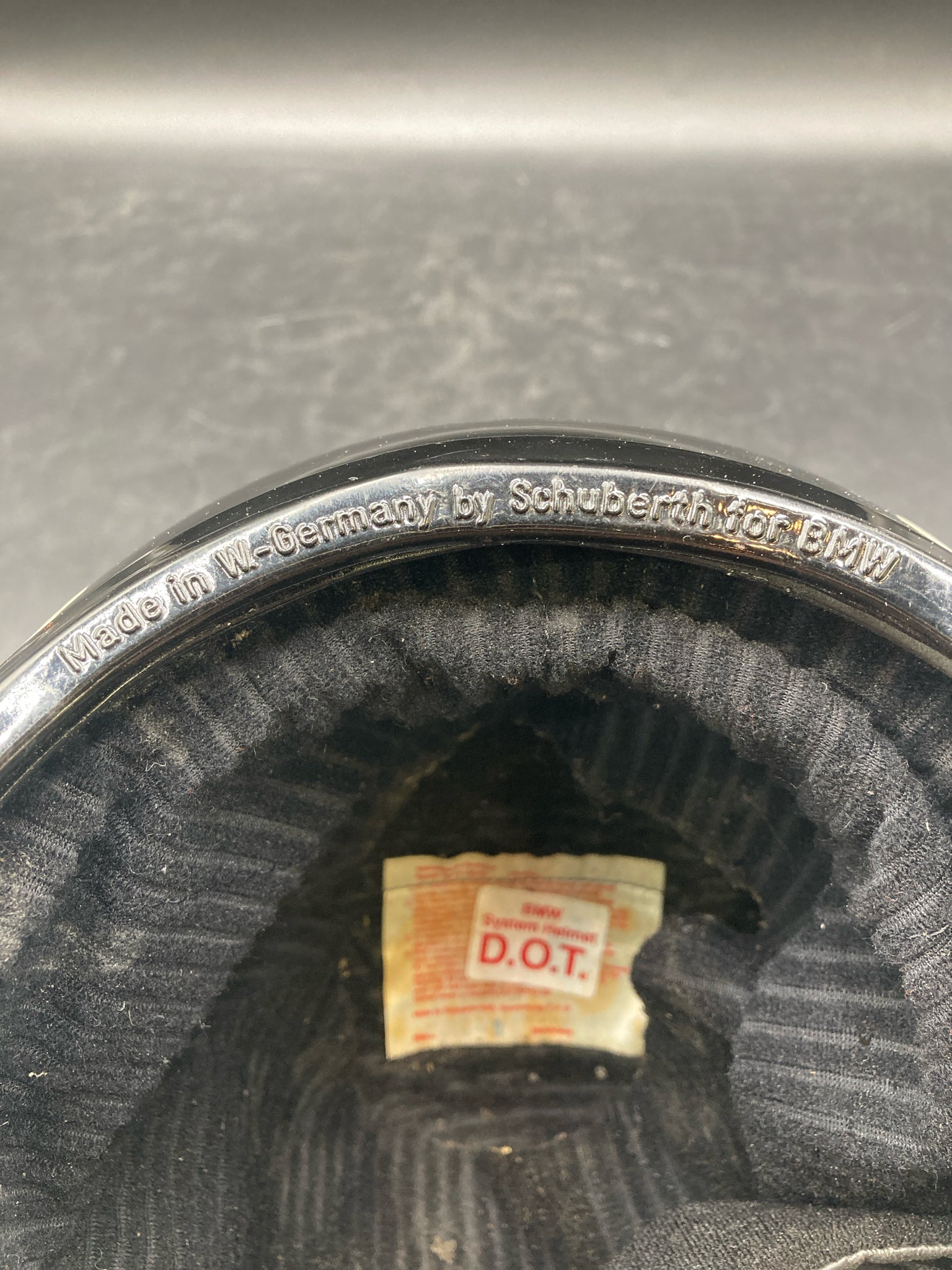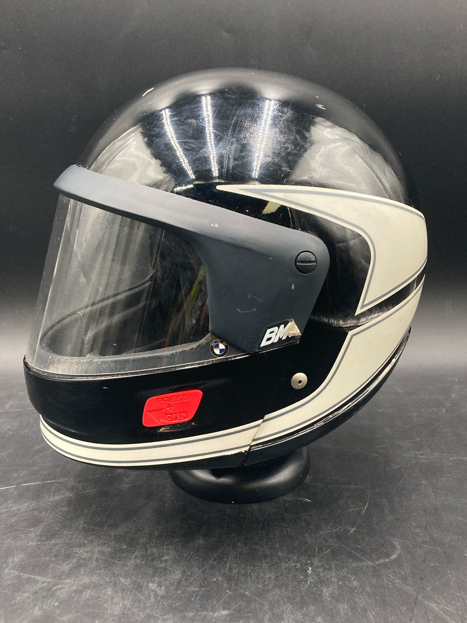 Vintage West German Schuberth BMW motorcycle helmet with extra visors. DOT approved helmet with hard plastic shell, flip up visor, and thick inner padding. Size marked 7 3/4 - 8. Exterior has some scratches and old padding is creating some dust so will likely require additional cleaning, otherwise helmet is in good condition.