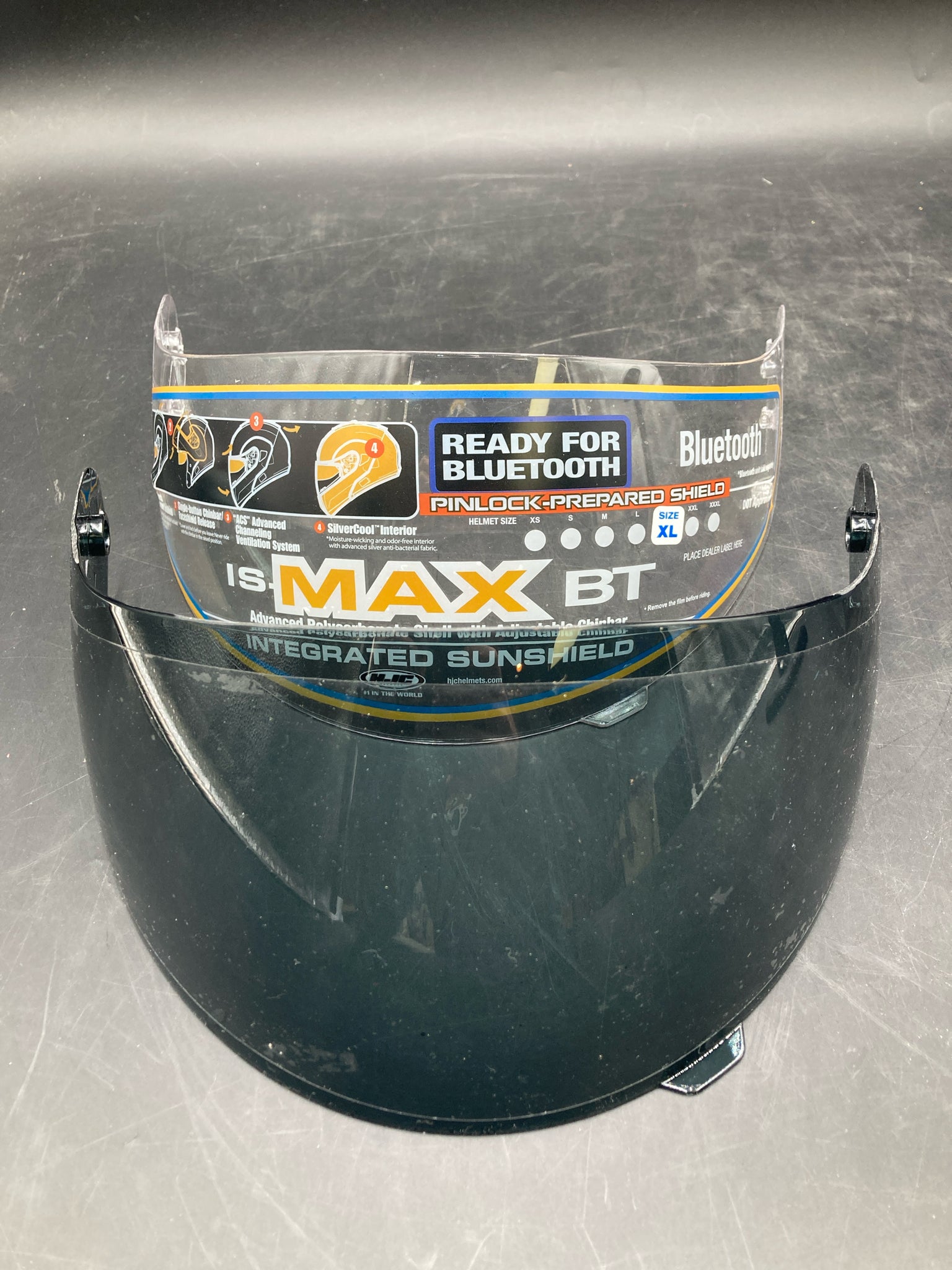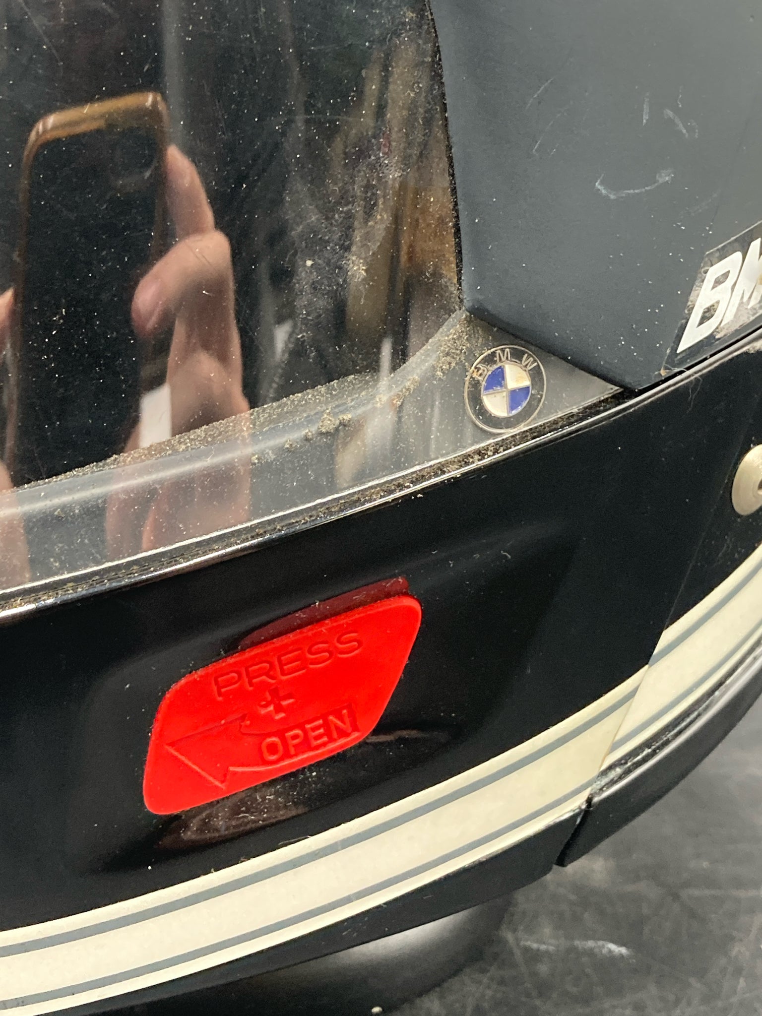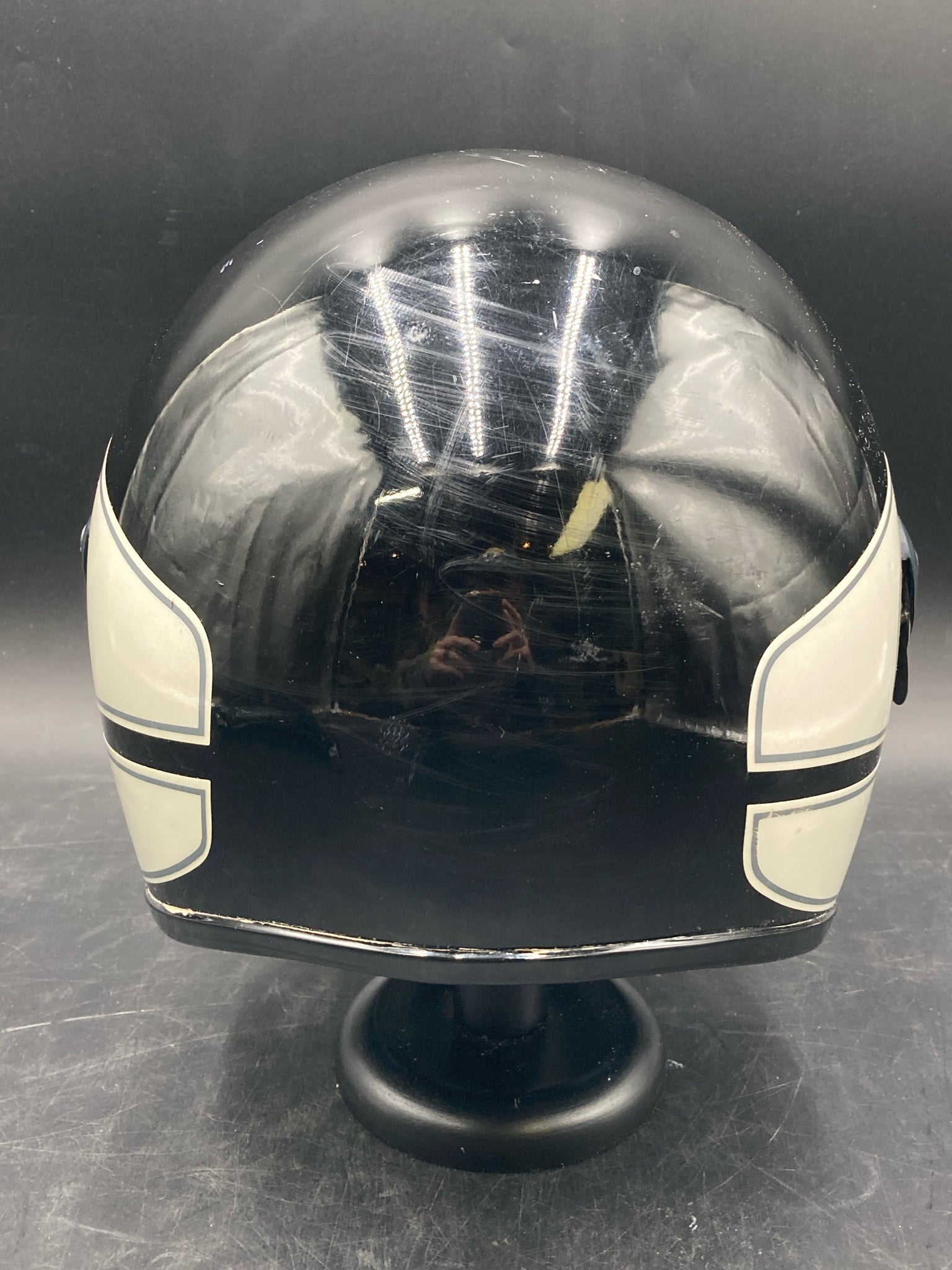 Vintage West German Schuberth BMW motorcycle helmet with extra visors. DOT approved helmet with hard plastic shell, flip up visor, and thick inner padding. Size marked 7 3/4 - 8. Exterior has some scratches and old padding is creating some dust so will likely require additional cleaning, otherwise helmet is in good condition.