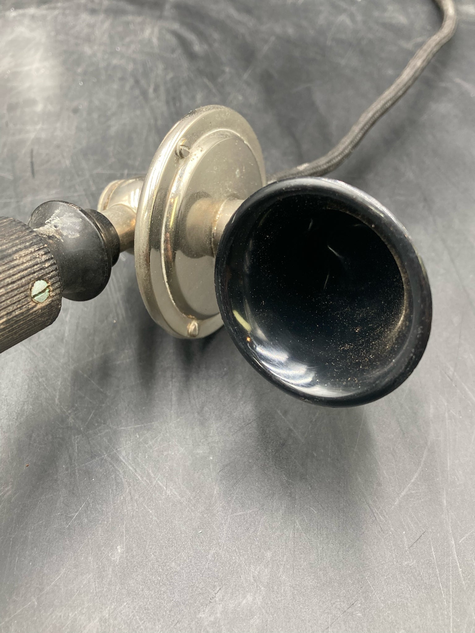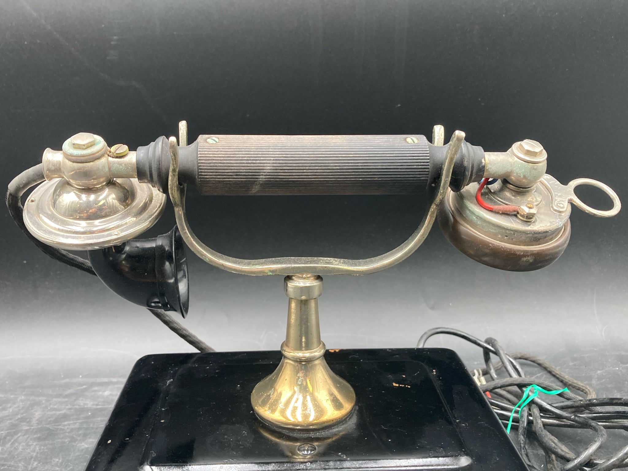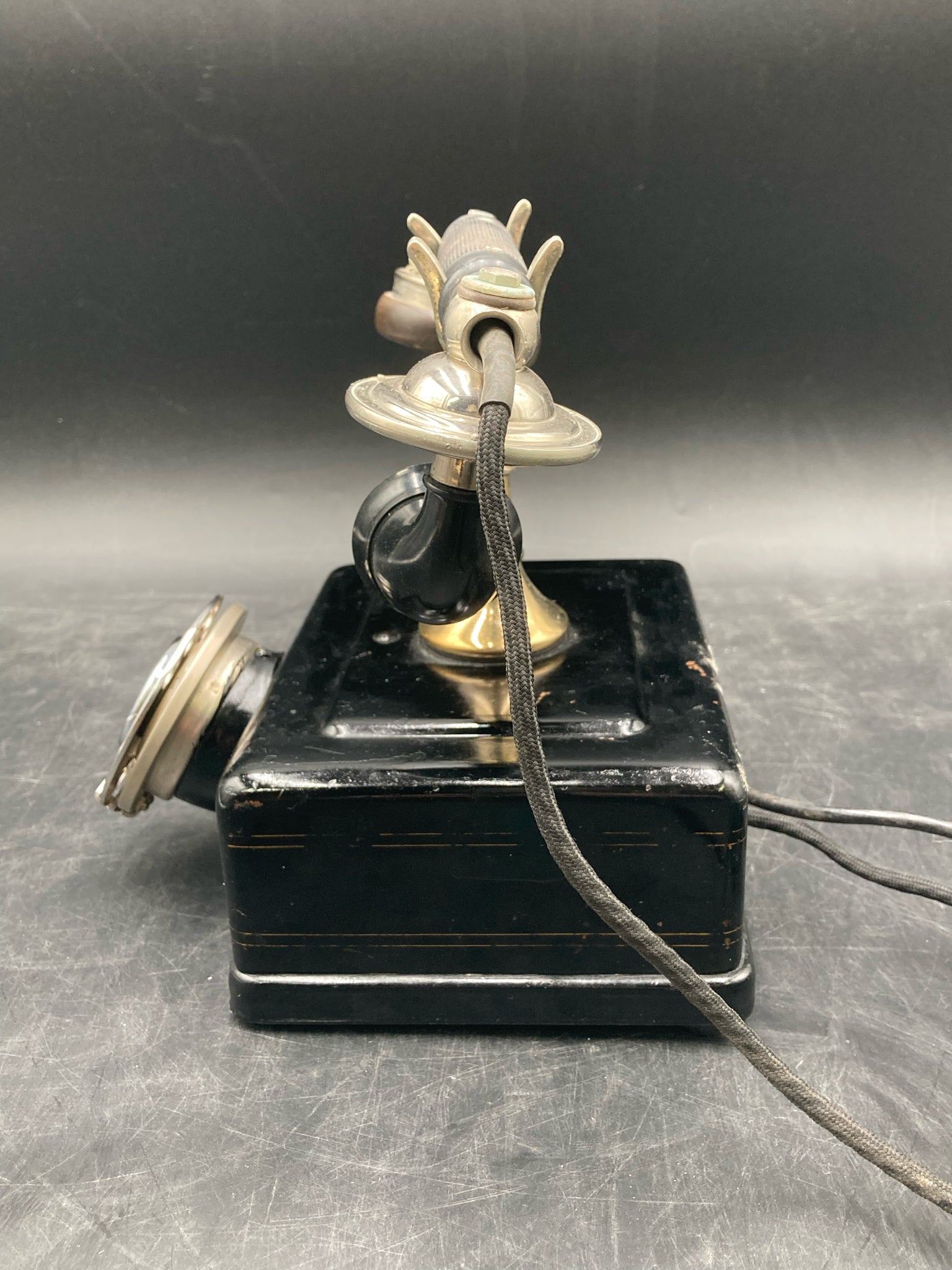 Western Electric centenary of the telephone desk rotary phone. Made in 1976 to commemorate the 100th anniversary of the invention of the telephone, accurate rotary phone model based on antique phones with working rotary dial, bakelite earpiece, brass phone holder and shielded wiring. Phone has not been wired to test function and is sold as a display piece. Phone has some light surface wear otherwise it is in very good physical condition.
